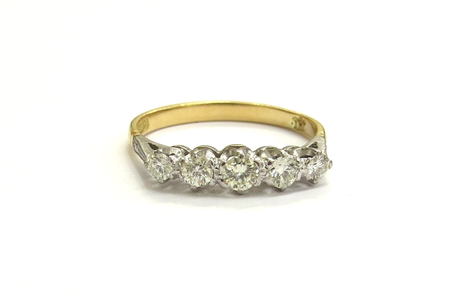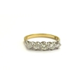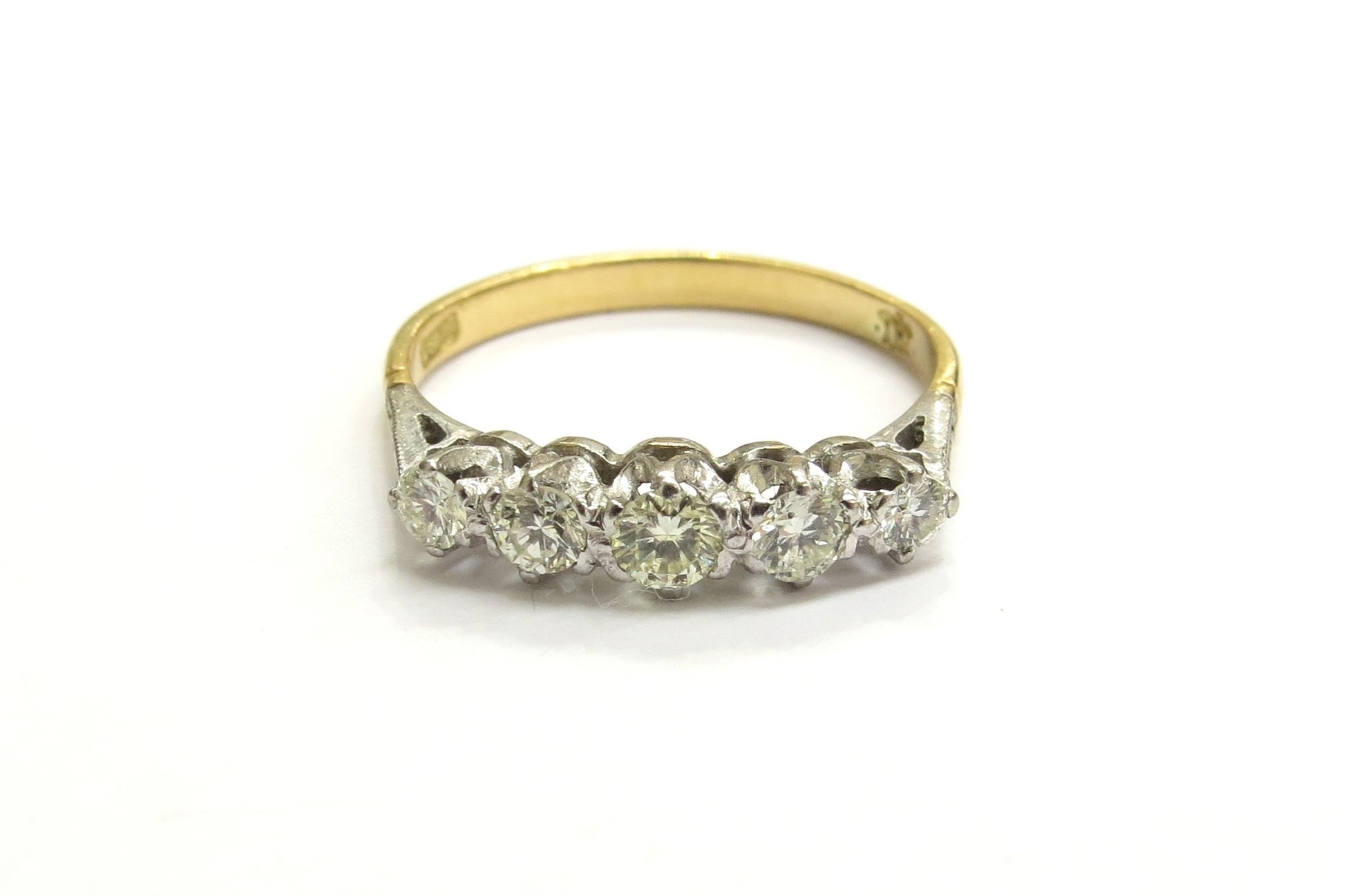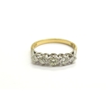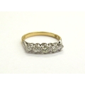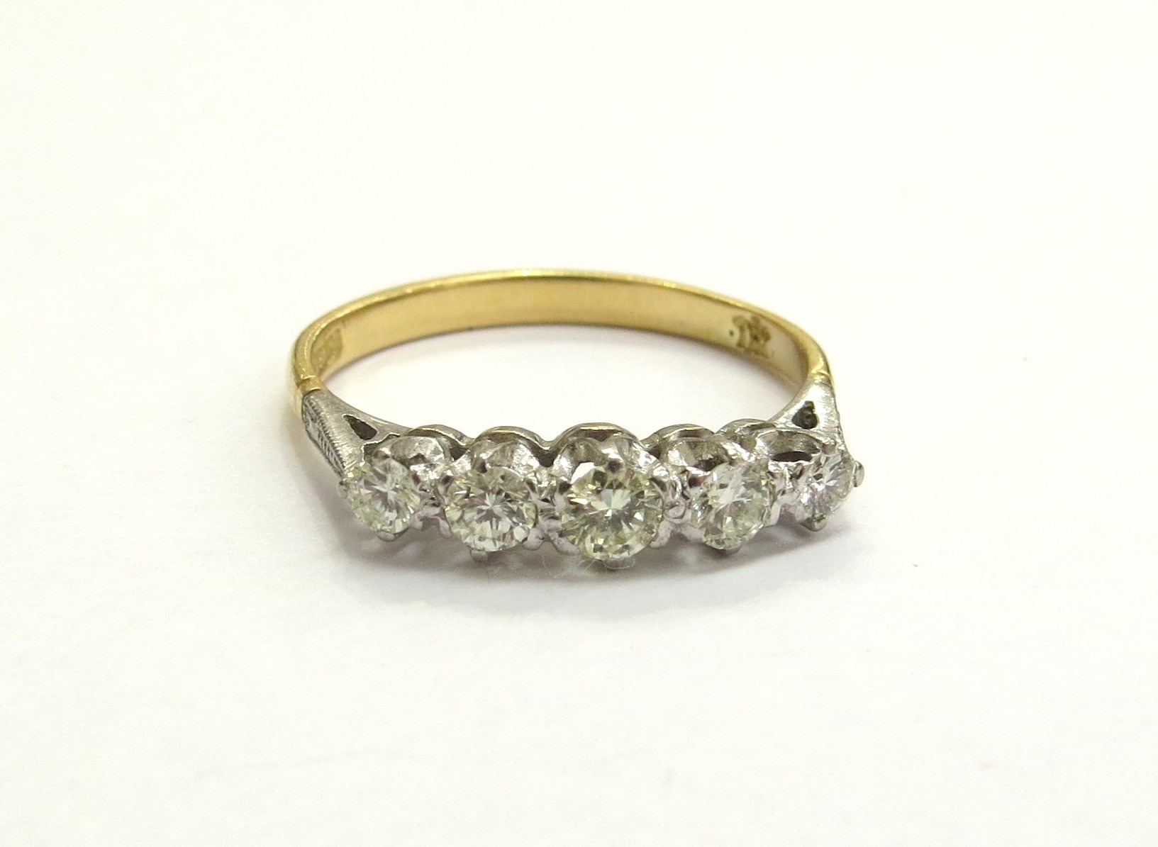 An 18ct gold platinum set five stone graduated diamond ring. Size O/P, 2.2g