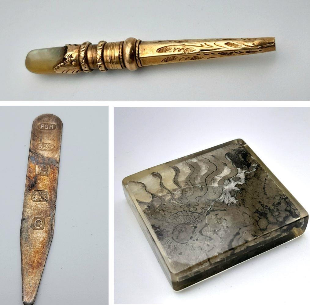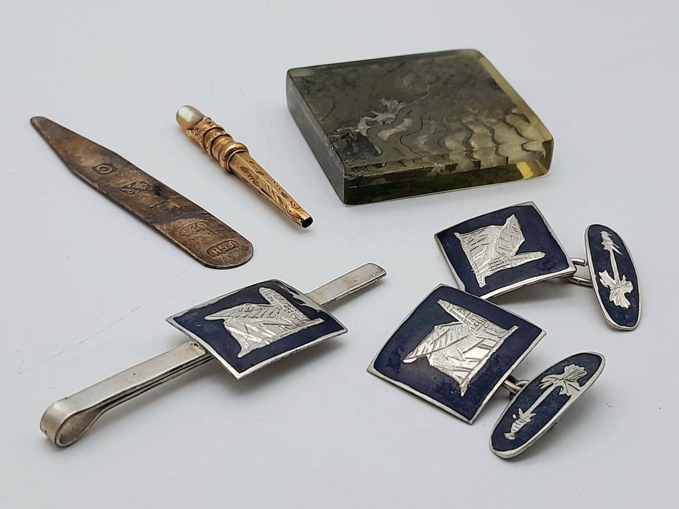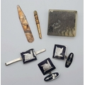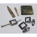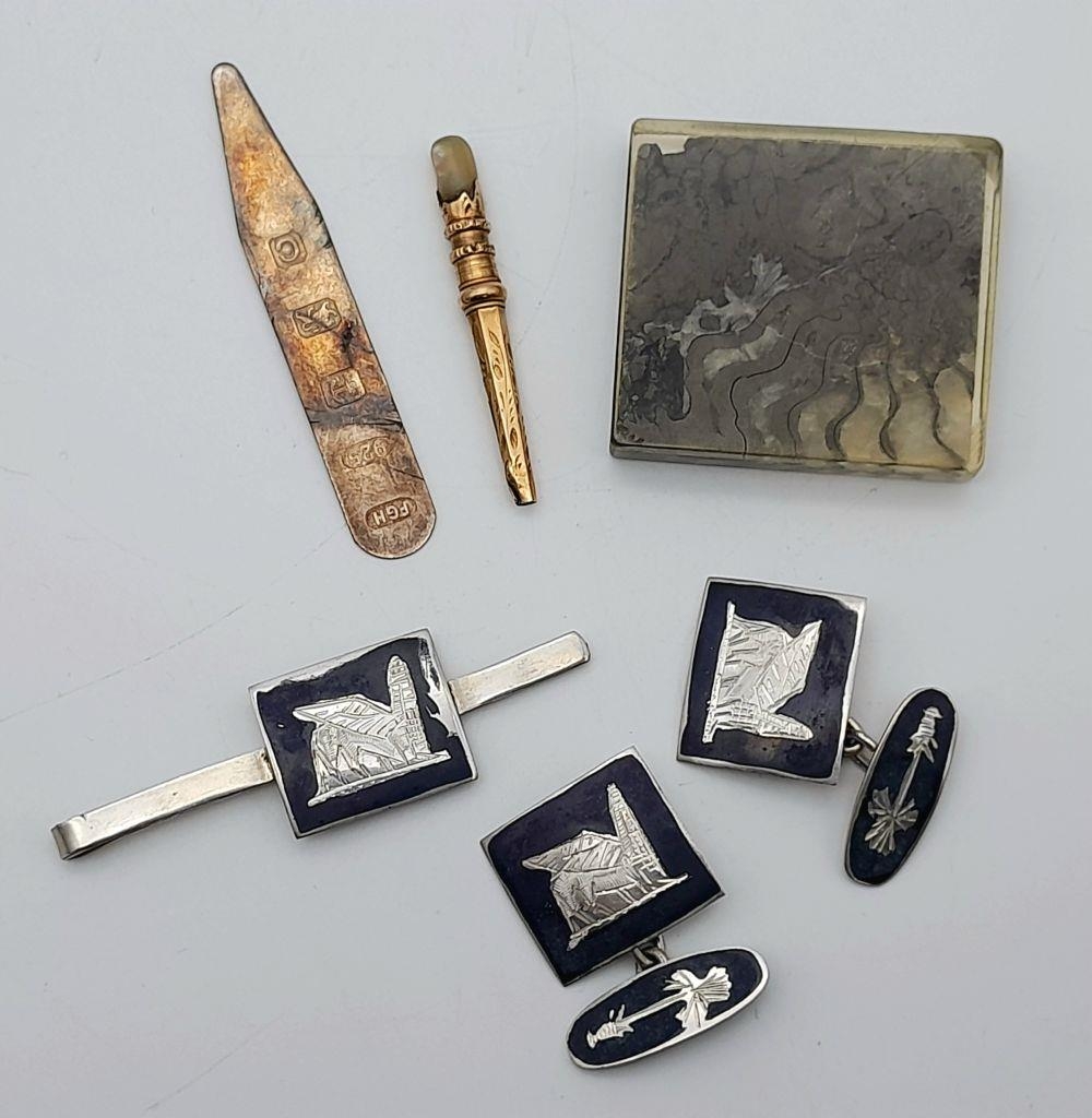 An Eclectic Mix of vintage Items, brooch and cufflinks set, hallmarked silver nail manicure etc