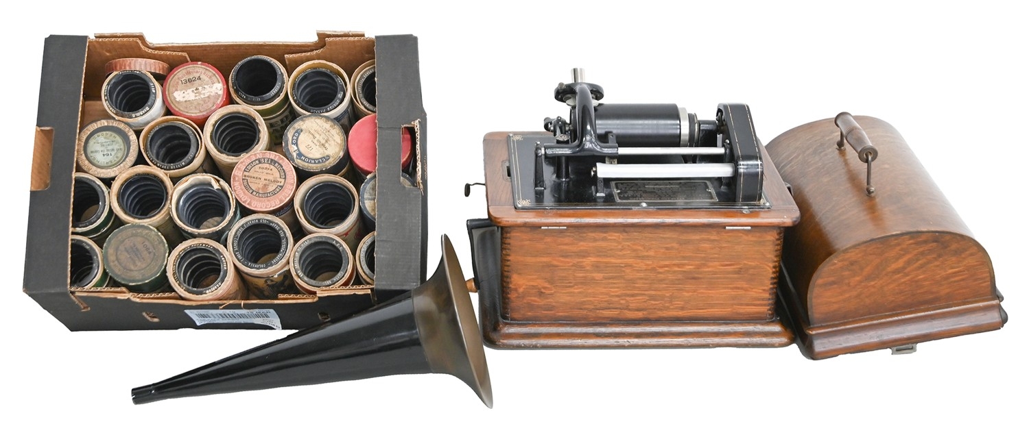 An Edison Standard phonograph, early 20th c, No 684327, oak case with domed lid and swing handle, maker's plaque inscribed Thomas A. Edison, with four-minute reproducer and japanned horn, 29cm h; 28 x 24cm and miscellaneous contemporary wax cylinders