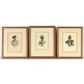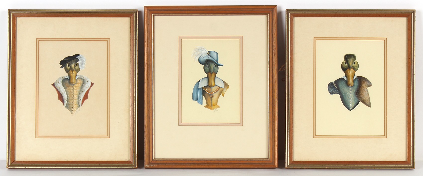 Property of a lady - Christopher Hope-King RMS (British, b.1951) - EDWARD VII, JAMES I, and SIR WALTER RALEIGH - three gouache portraits as ducks, in matching glazed frames, each 16.15 by 13.15ins. (41 by 33.5cms.) (overall) (3).