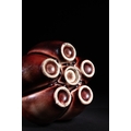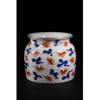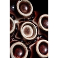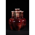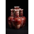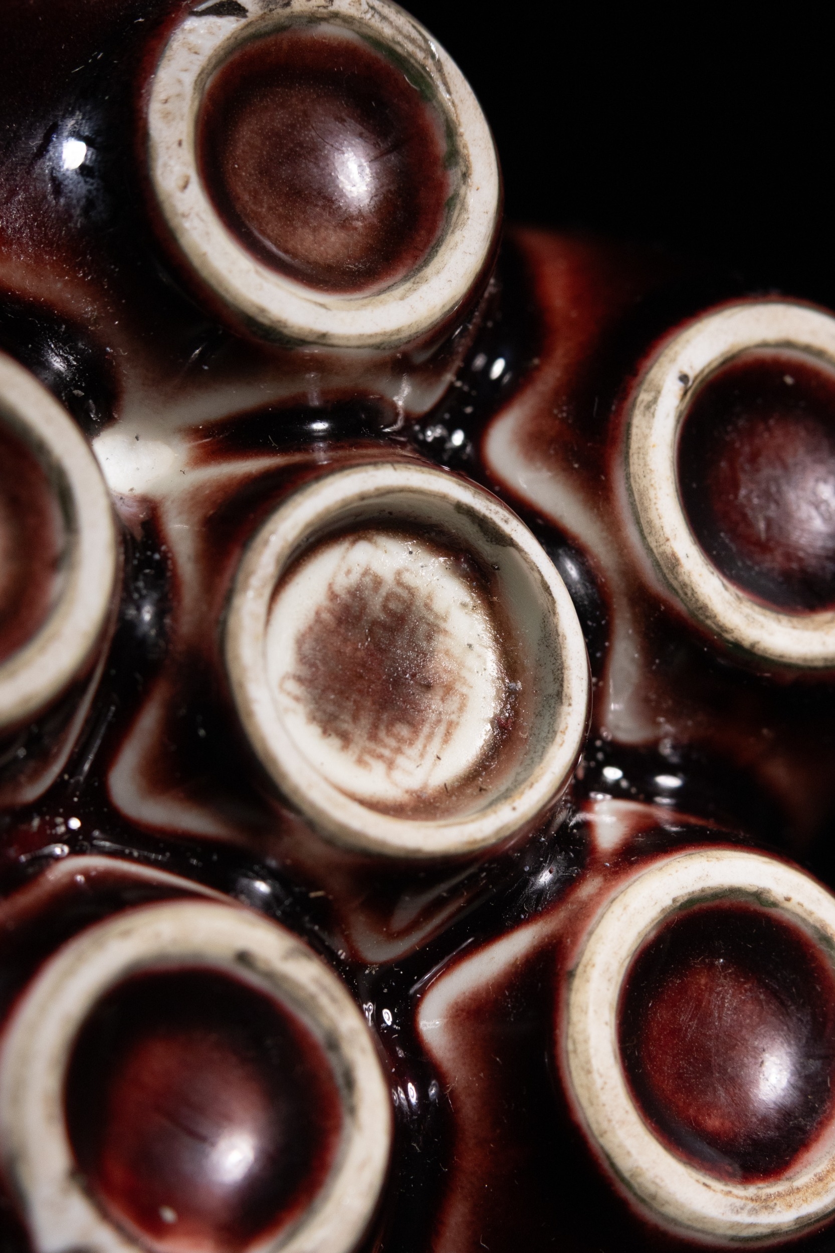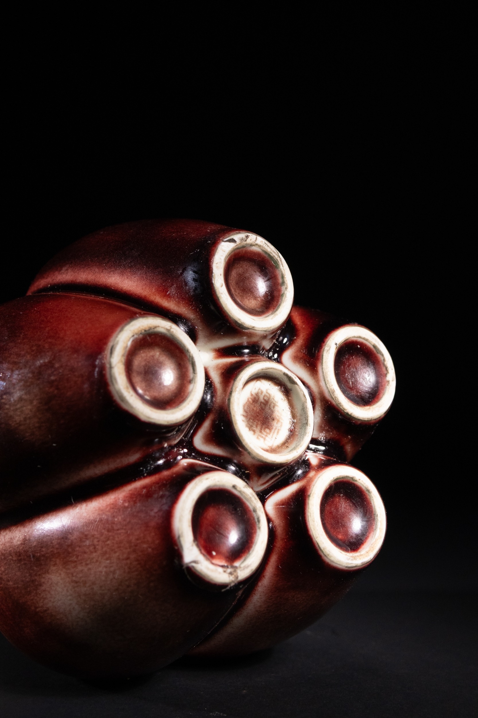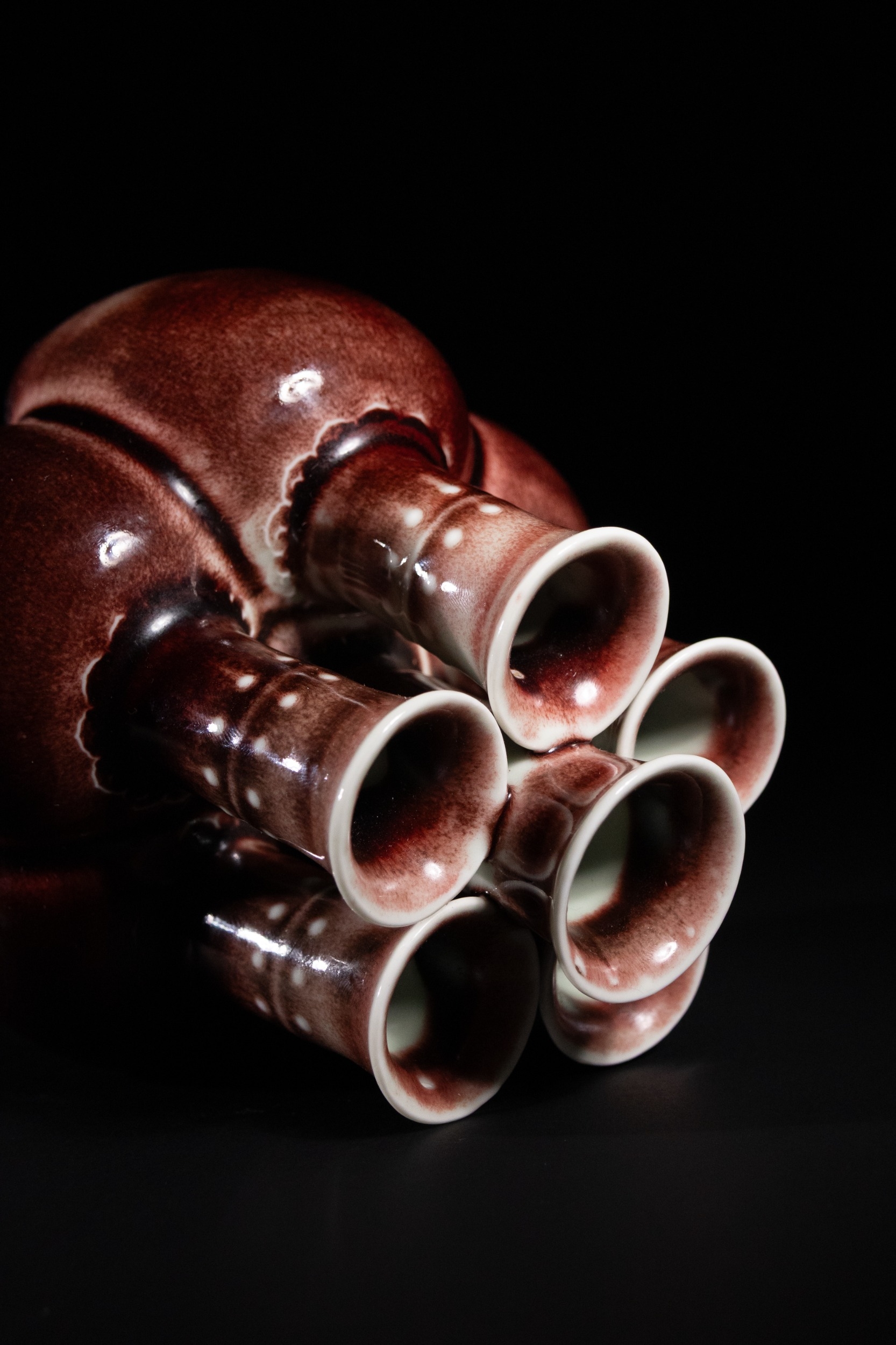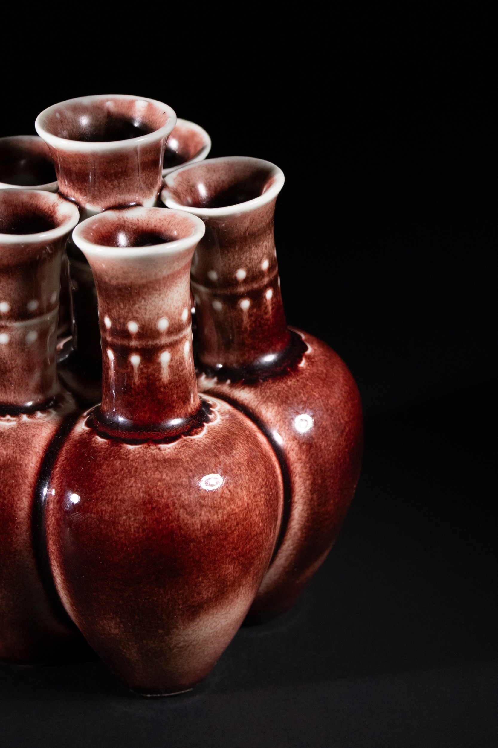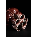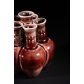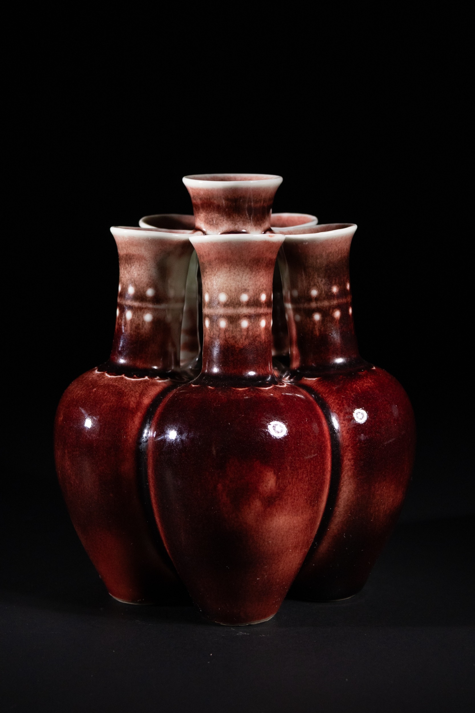 A Chinese Sang de Boeuf Glazed Porcelain Five-Neck Vase - A multi-necked porcelain vase featuring a bulbous body from which five conjoined cylindrical necks rise, each terminating in a flaring rim. The vase is covered in a lustrous, mottled reddish-brown glaze of the flambé or sang de boeuf type, which thins to a pale mushroom or off-white color at the rims and raised areas, highlighting its form. Each neck is decorated with a band of raised white slip-dots below the rim. The underside of one of the necks bears a faint, impressed four-character seal script mark, "大清乾隆年製" (Dà Qīng Qiánlóng nián zhì), translating to "Made in the Great Qing Qianlong reign."