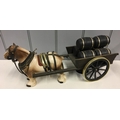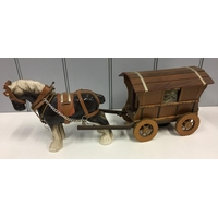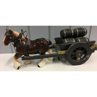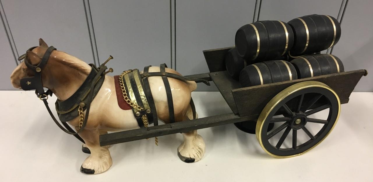 A vintage Shire Horse & black wooden Cart with metal wheels.