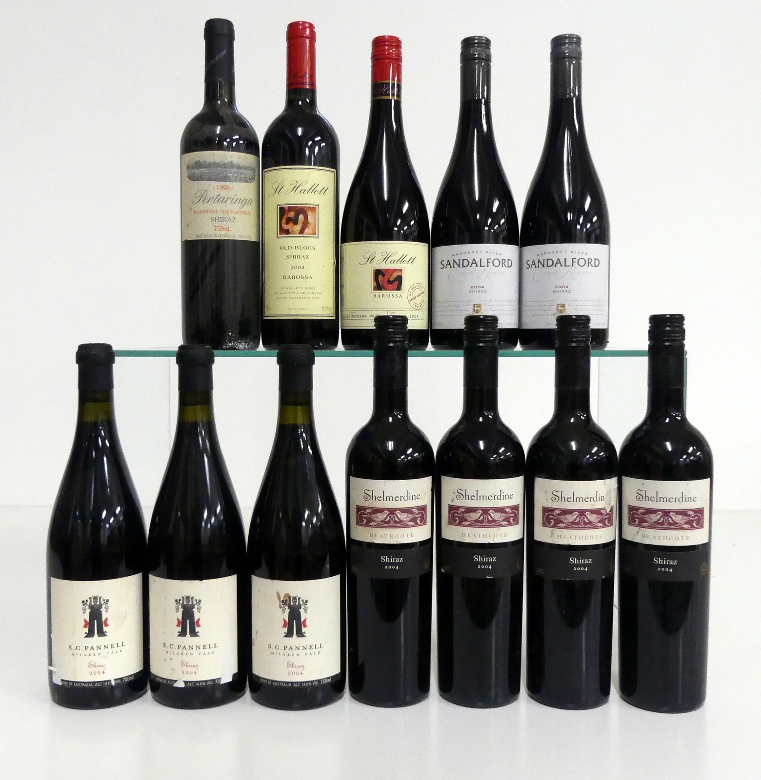 1 bt Pertaringa Shiraz 1998 McLaren Vale i.n, bs 1 bt St Hallett Old Block Shiraz 2002 1 bt St Hallett Scholz Estate Shiraz 2009 2 bts Sandalford Shiraz 2004 Margaret River hf/i.n 3 bts S.C. Pannell Shiraz 2004 McLaren Vale i.n, sl bs, sl cdl 4 bts Shelmerdine Shiraz 2004 Heathcote hf/i.n, sl stl, 1 scuffed label Above 12 bottles