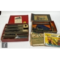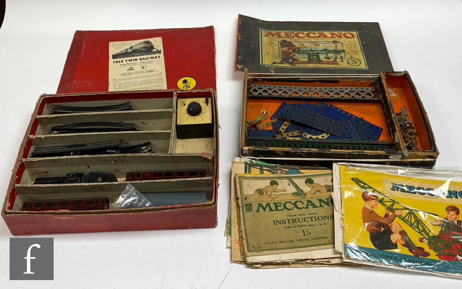A collection of 1920s Meccano pieces houses in a Meccano No. 3 box, with assorted Meccano instructions, and a Trix Twin Railway set with a 4-4-0 BR black 8032 locomotive and tender and two LMS coaches. (2)
