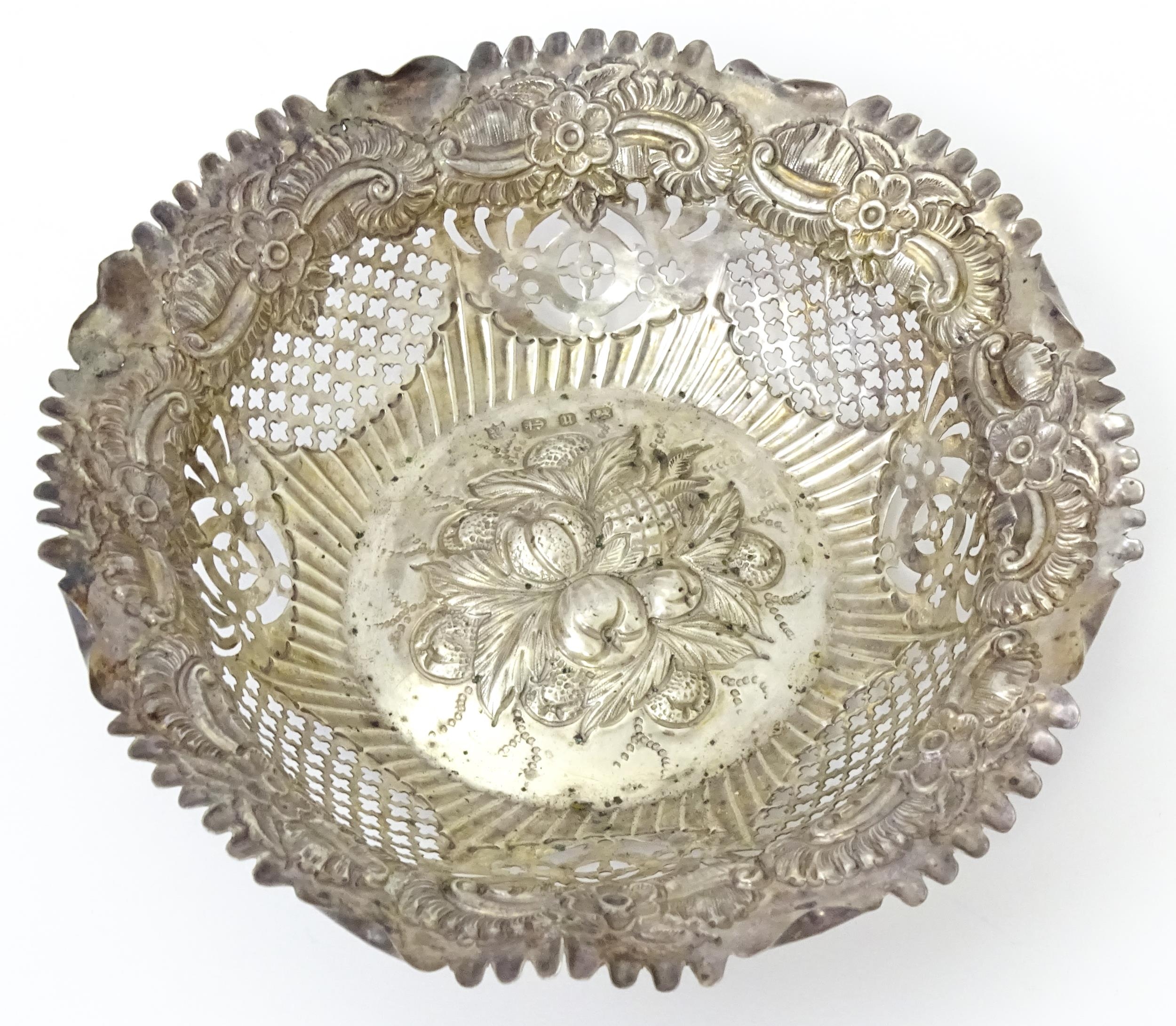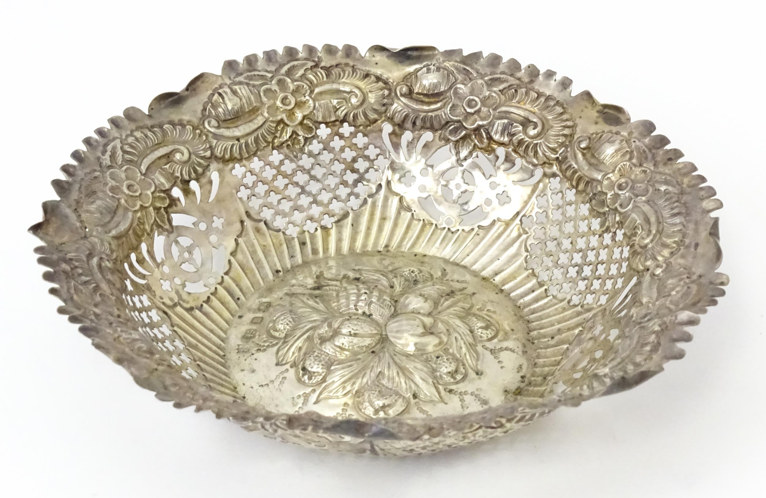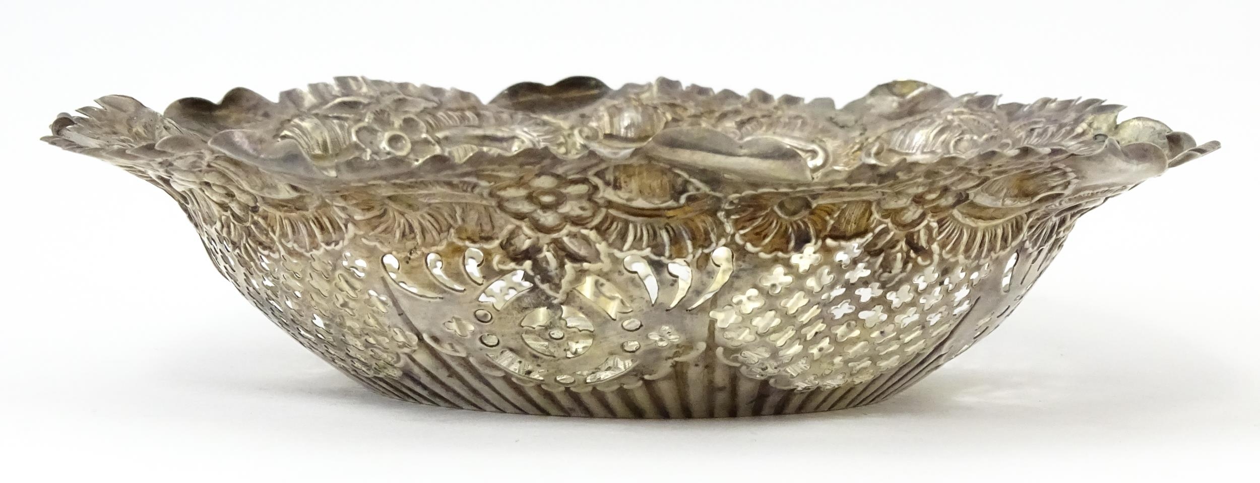 A silver bon bon dish with embossed and pierced decoration, hallmarked Birmingham 1894, maker George Nathan & Ridley Hayes. Approx. 6" wide (TW approx. 80g)