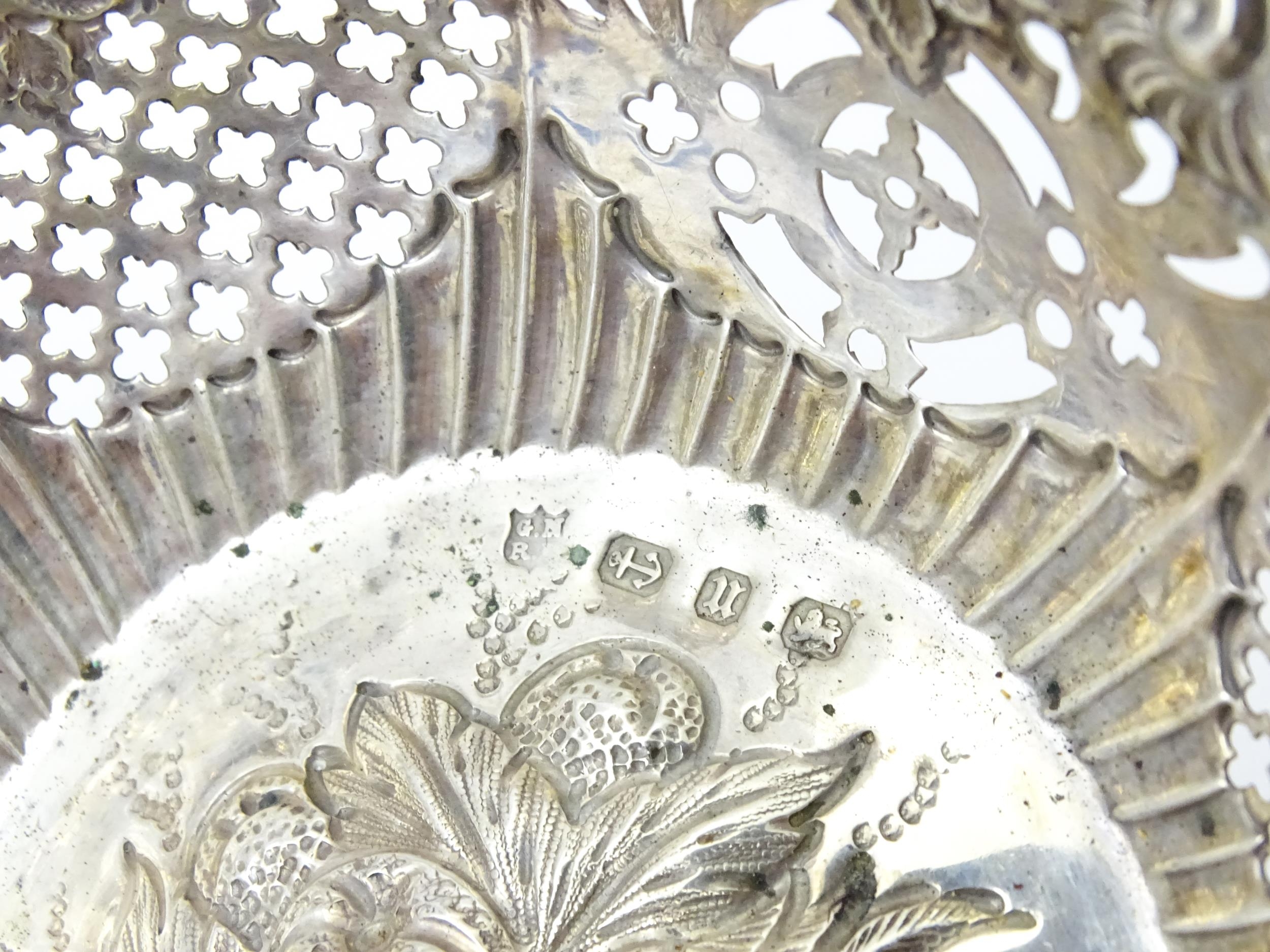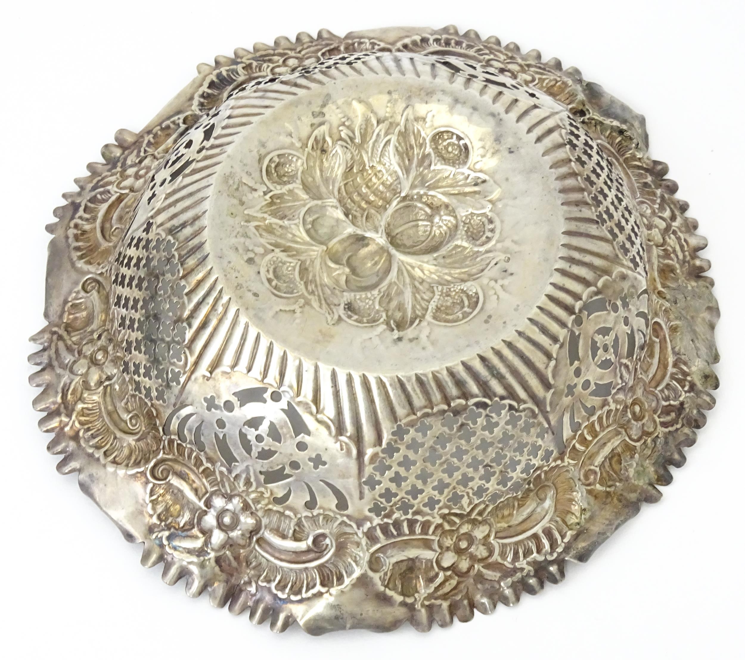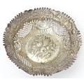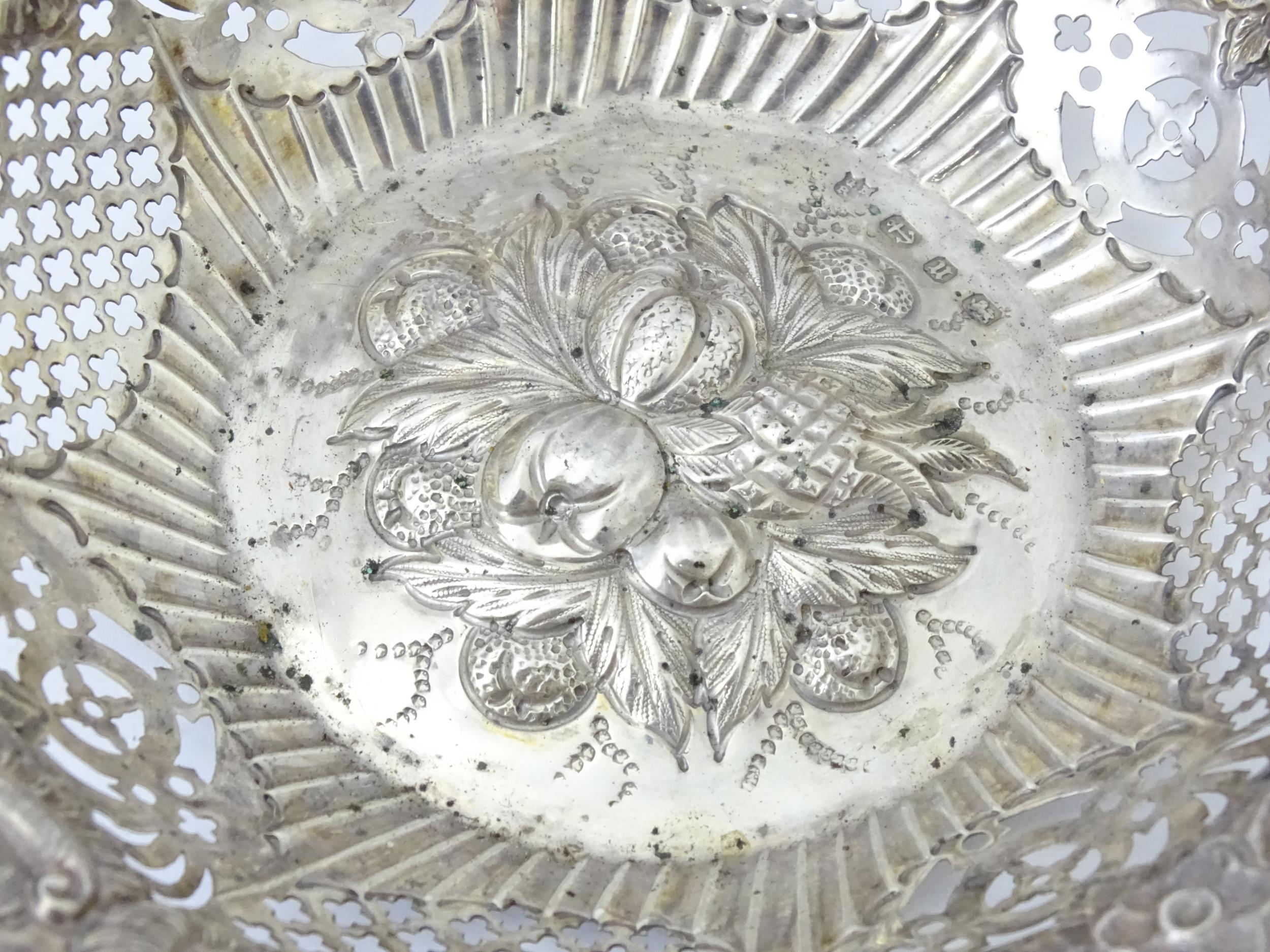 A silver bon bon dish with embossed and pierced decoration, hallmarked Birmingham 1894, maker George Nathan & Ridley Hayes. Approx. 6" wide (TW approx. 80g)