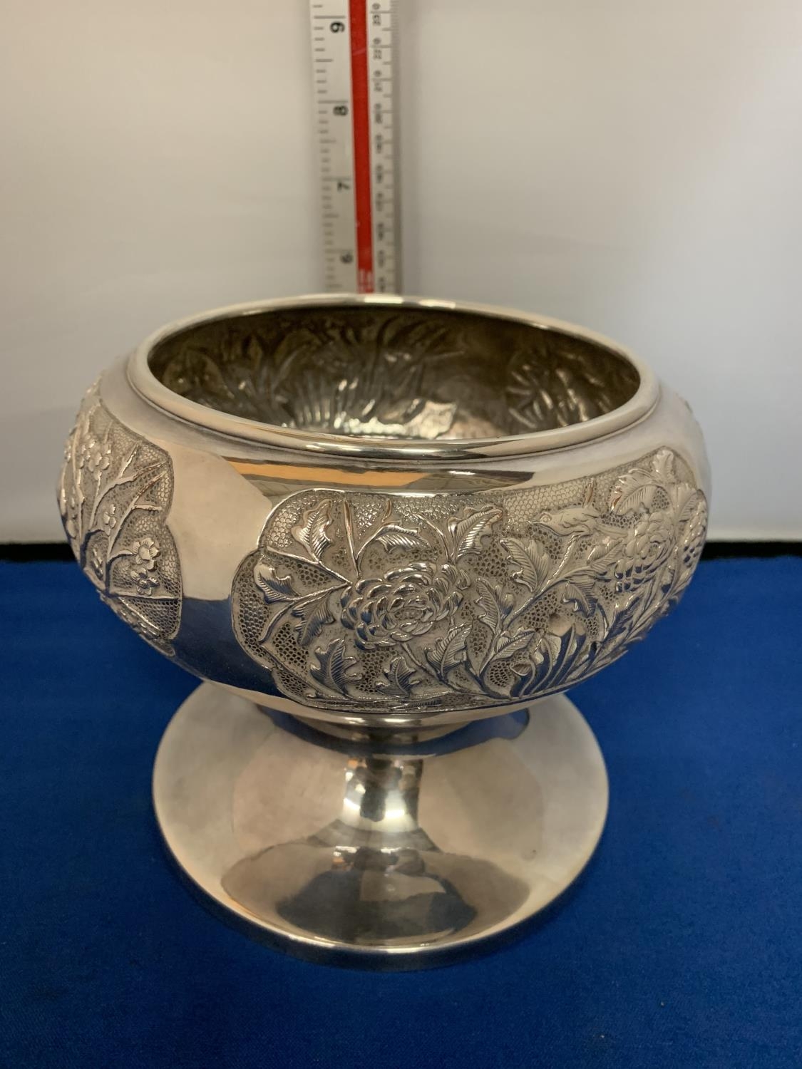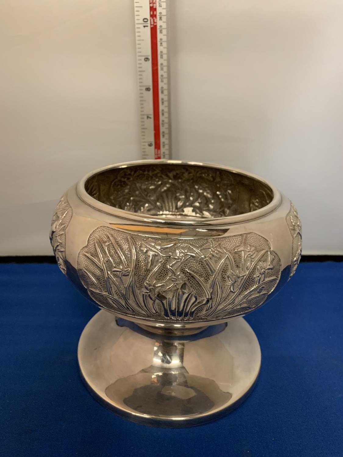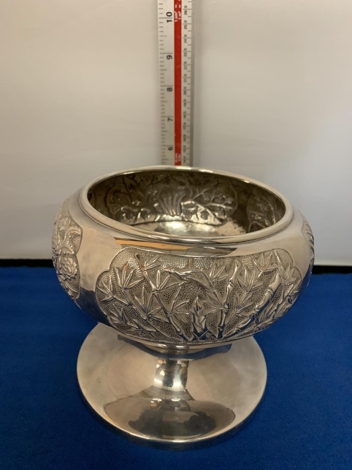 A C.1900 CHINESE UNMARKED WHITE METAL PEDESTAL BOWL / VASE WITH FOUR PANELS DECORATED WITH BIRDS AND BAMBOO SHOOT DESIGN, HEIGHT 15 CM