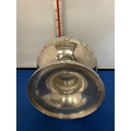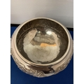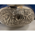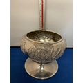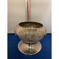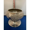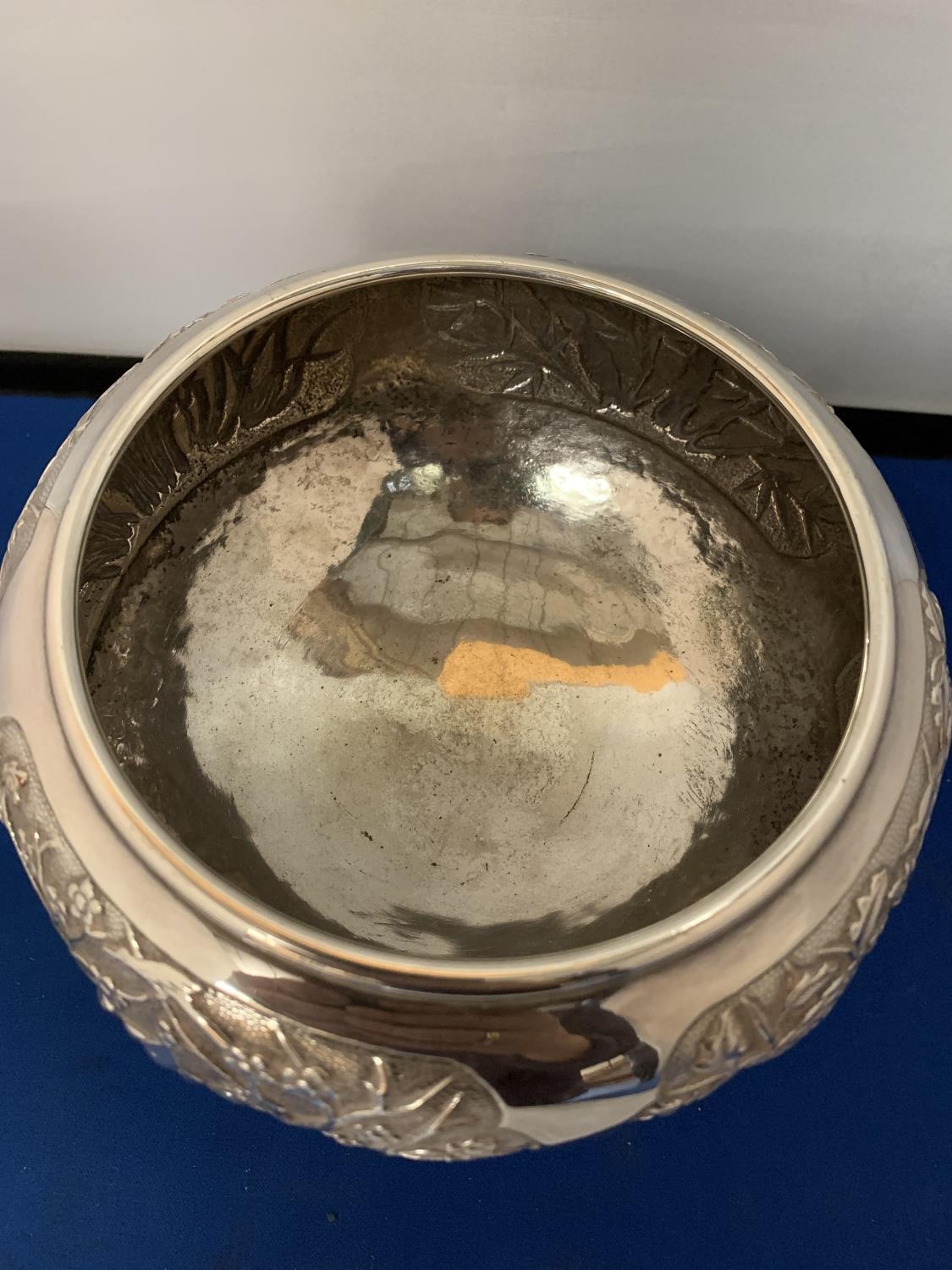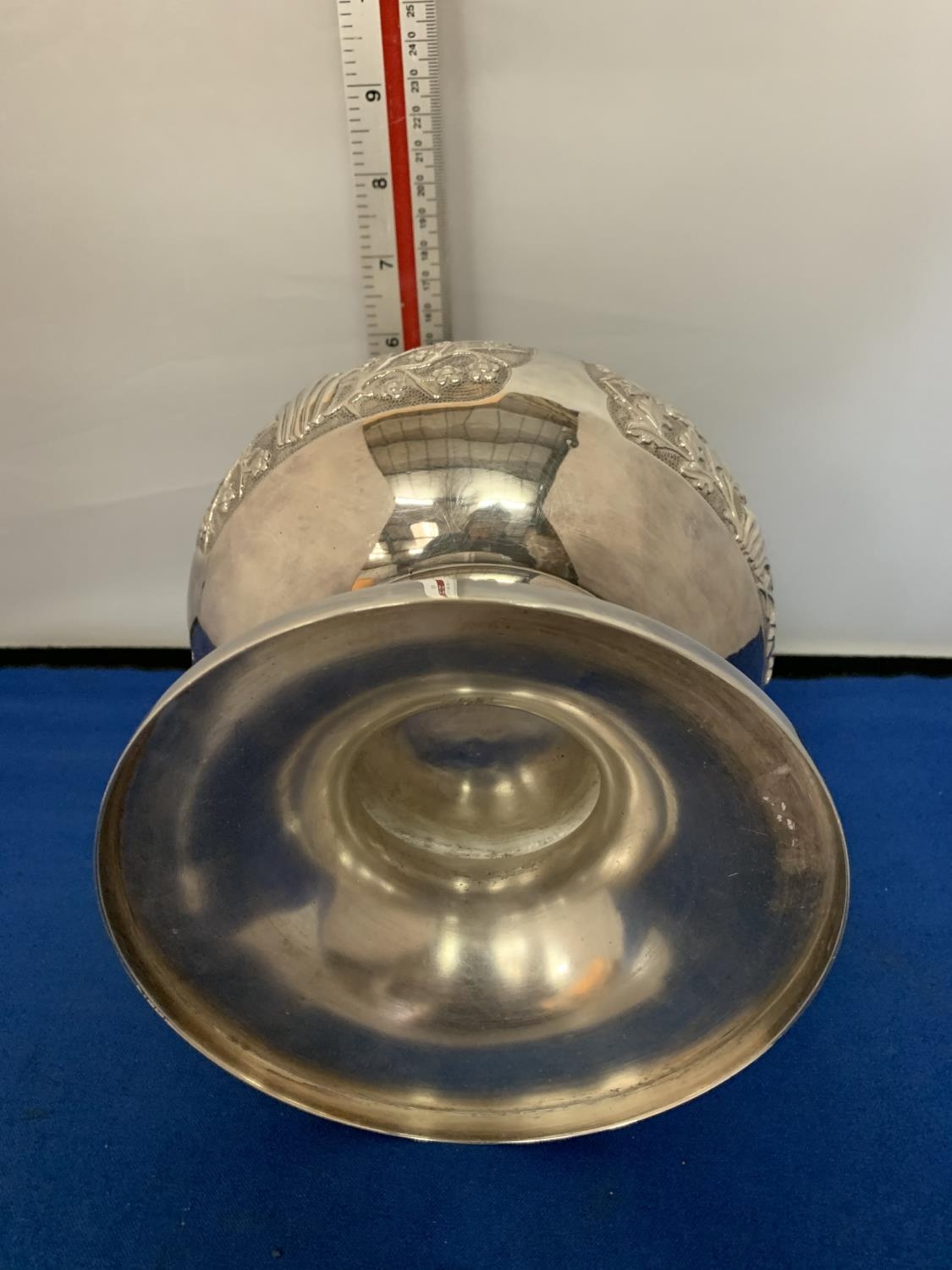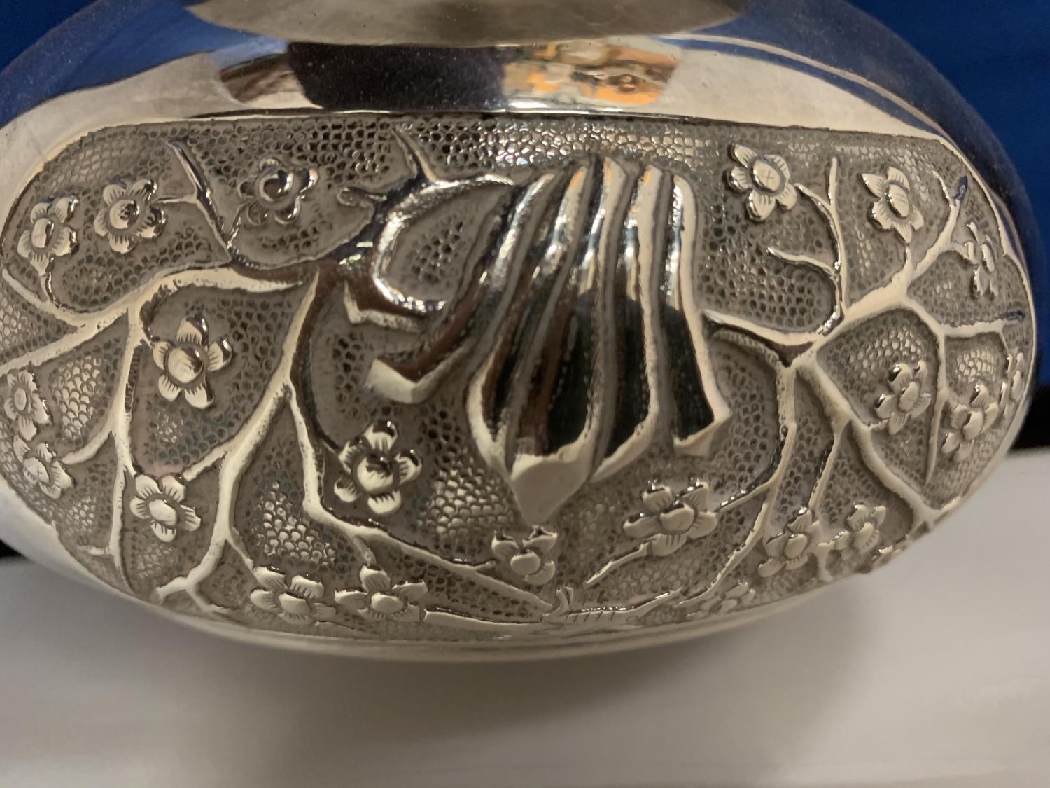 A C.1900 CHINESE UNMARKED WHITE METAL PEDESTAL BOWL / VASE WITH FOUR PANELS DECORATED WITH BIRDS AND BAMBOO SHOOT DESIGN, HEIGHT 15 CM