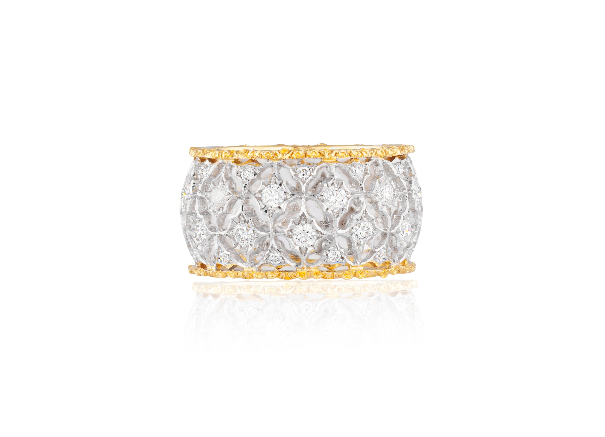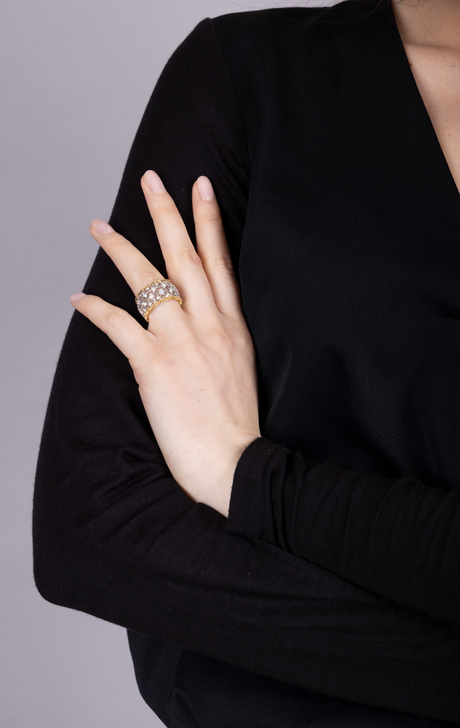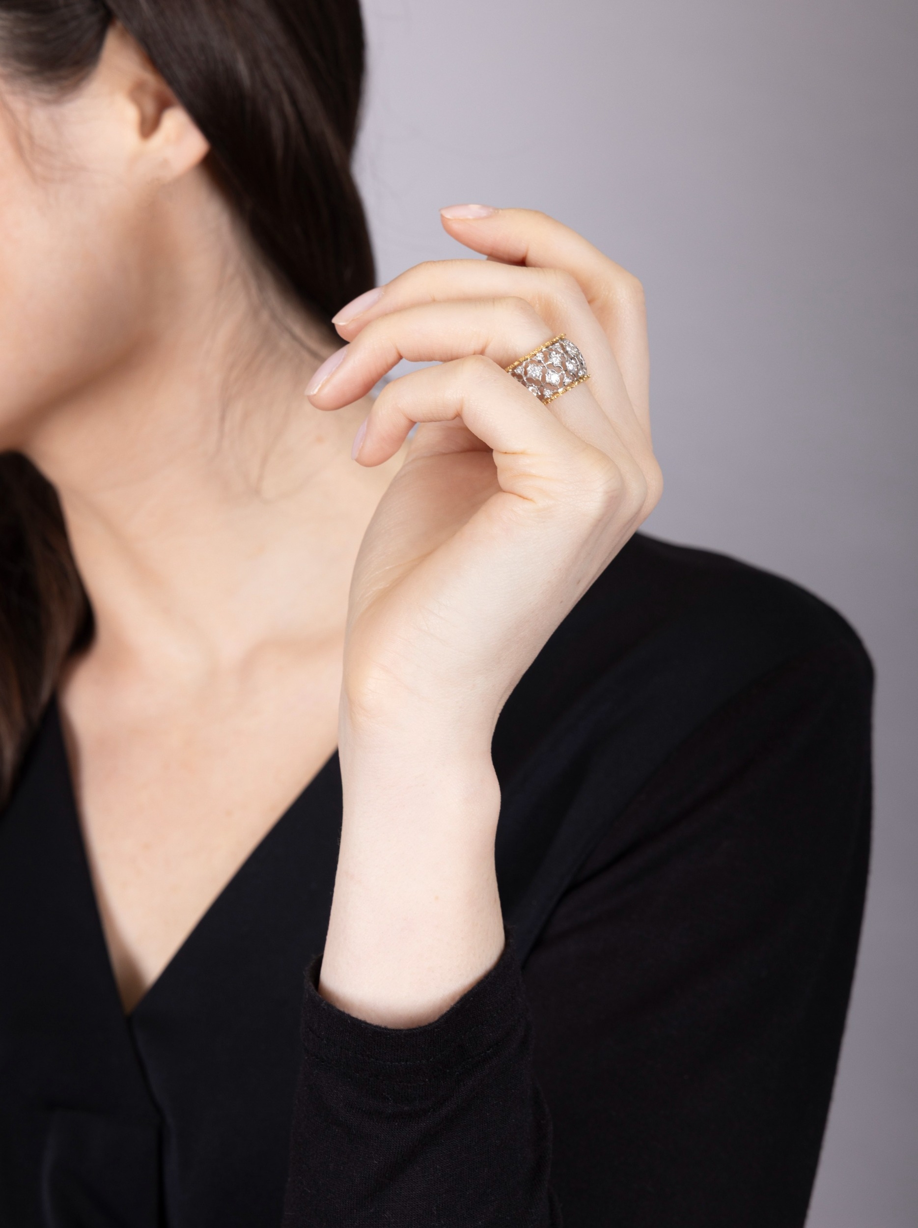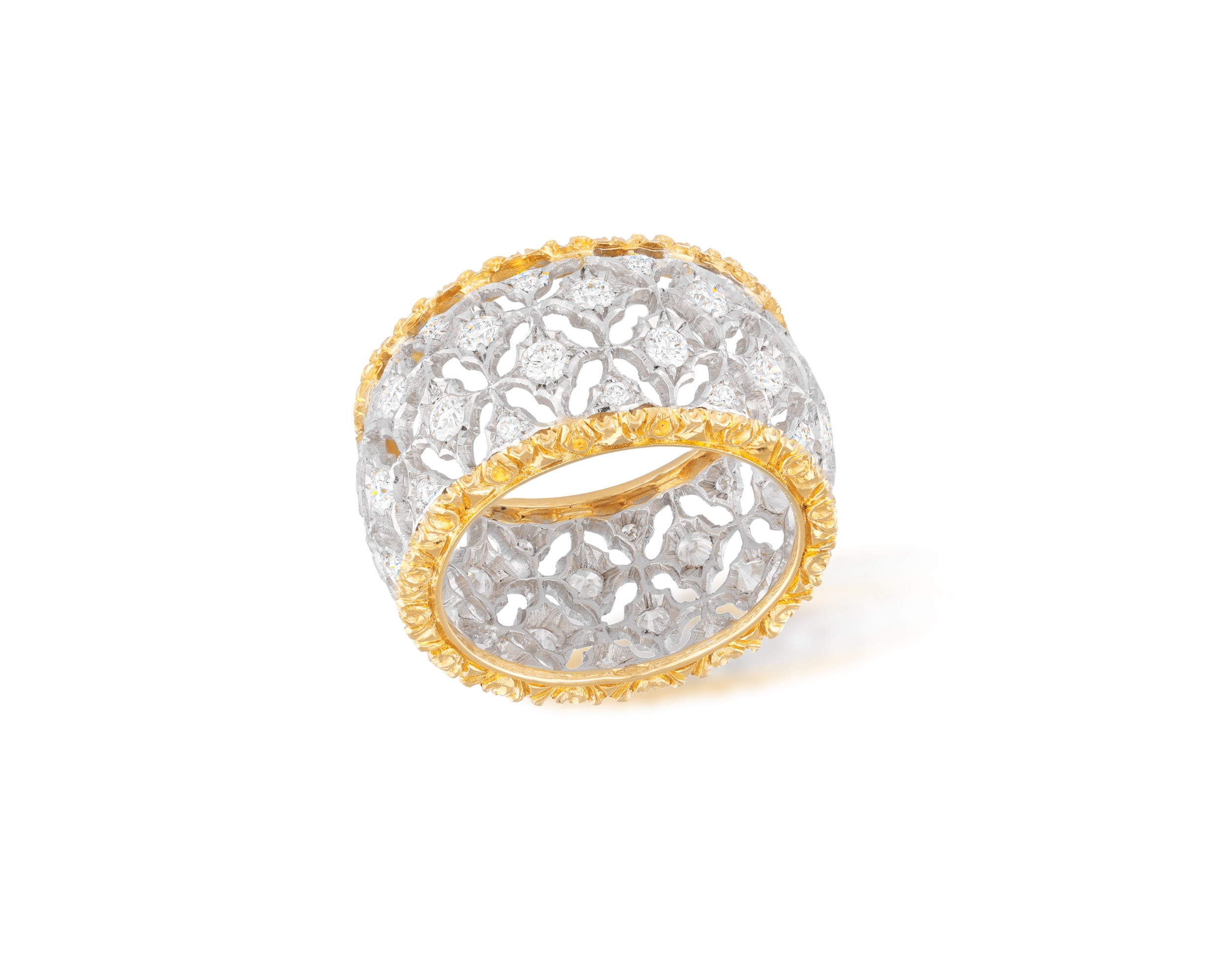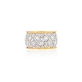 BUCCELLATI: A DIAMOND RING Of bi-coloured design, formed as a continuous openwork foliate lattice, accented by brilliant-cut diamonds, between textured borders, mounted in 18K gold, diamonds approximately 2.00cts total, signed M. Buccellati, ring size approximately M The celebrated Italian house of Buccellati is renowned for jewels and silver of singular character: gold engraved until it seems to assume the softness of silk, the lightness of lace, or the delicacy of tulle. Founded in Milan in 1919 by Mario Buccellati, the Maison has remained faithful to a vision of jewellery not merely as adornment, but as an art of texture, refinement, and memory. Born in Ancona in 1891 and trained in Milan, Mario Buccellati drew deeply from the goldsmithing traditions of antiquity, the Middle Ages, and the Renaissance. From the outset, his ambition was not simply to revive historic techniques, but to reanimate them in a language at once exacting and modern. That ambition became the foundation of the house: surfaces patiently worked by hand through techniques such as rigato, telato, modellato, ornato, and segrinato, which endowed gold with an unmistakable tactile richness and gave Buccellati its enduring visual identity. An important chapter in Mario Buccellati's ascent was his friendship with Gabriele D'Annunzio, the celebrated poet and one of the great tastemakers of early twentieth-century Italy. More than a literary figure, D'Annunzio was a powerful arbiter of style, whose approval carried exceptional prestige in artistic and aristocratic circles. Their friendship, which began in 1922, culminated in 1936 when he hailed Buccellati as "The Prince of Goldsmiths"; a distinction that placed the jeweller within a wider Italian tradition of art, craftsmanship, and cultivated beauty. From the beginning, Buccellati belonged to a rarefied world of aristocratic elegance and refined patronage. Mario Buccellati's creations were admired by aristocrats and royal families, while he also supplied ornamental objects to the Pope and the great cardinals of Rome, securing the house a place within the highest circles of taste and ceremony. That aura of distinction has endured into the present. In more recent years, figures such as Beatrice Borromeo and Talita von Fürstenberg have appeared in connection with the Maison, extending its long association with poise, refinement, and cultivated style. Yet Buccellati's prestige rests not upon association alone, but upon the singularity of its creations: jewels whose engraved gold, openwork lightness, and historical craftsmanship lend them a character unlike that of any other house. The history of Buccellati after Mario is one of both continuity and transformation. International expansion had already begun during the founder's lifetime, when Luca Buccellati, Mario's eldest son, opened the first New York boutique in 1951. After Mario's death in 1965, his sons carried the family tradition forward in different ways: Gianmaria assumed the leading creative role, while Lorenzo and Federico contributed to the commercial development of the house in Italy. Although the Buccellati name was not always contained within a single unified company, its artistic identity remained remarkably coherent. Under Gianmaria Buccellati, the house expanded further into Hong Kong and Japan and, in 1979, established a boutique on Place Vendôme in Paris, becoming the first Italian jeweller to do so. Over the decades, Buccellati has extended its repertoire beyond jewellery into silver, watches, and bridal creations, while remaining anchored to the same essential principle: that precious materials achieve their highest expression not in excess, but in nuance. This is what gives Buccellati its distinctive place in the history of Italian jewellery. Its creations do not merely display splendour; they embody a cultivated ideal of beauty, shaped by the hand, enriched by history, and made enduring through style. Today, Buccellati remains closely bound to the family whose name it bears. Andrea Buccellati, Gianmaria's son, serves as Honorary Chairman and Creative Director, while Mariacristina, Luca, and Lucrezia Buccellati reflect the continuity of the family's presence within the Maison. Family memory, artistic discipline, and technical mastery thus remain inseparably intertwined.