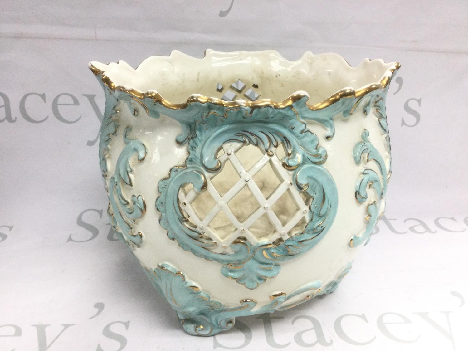 An English pottery jardiniere piercework and applied decoration, approx height 22.5cm. Shipping category D. NO RESERVE