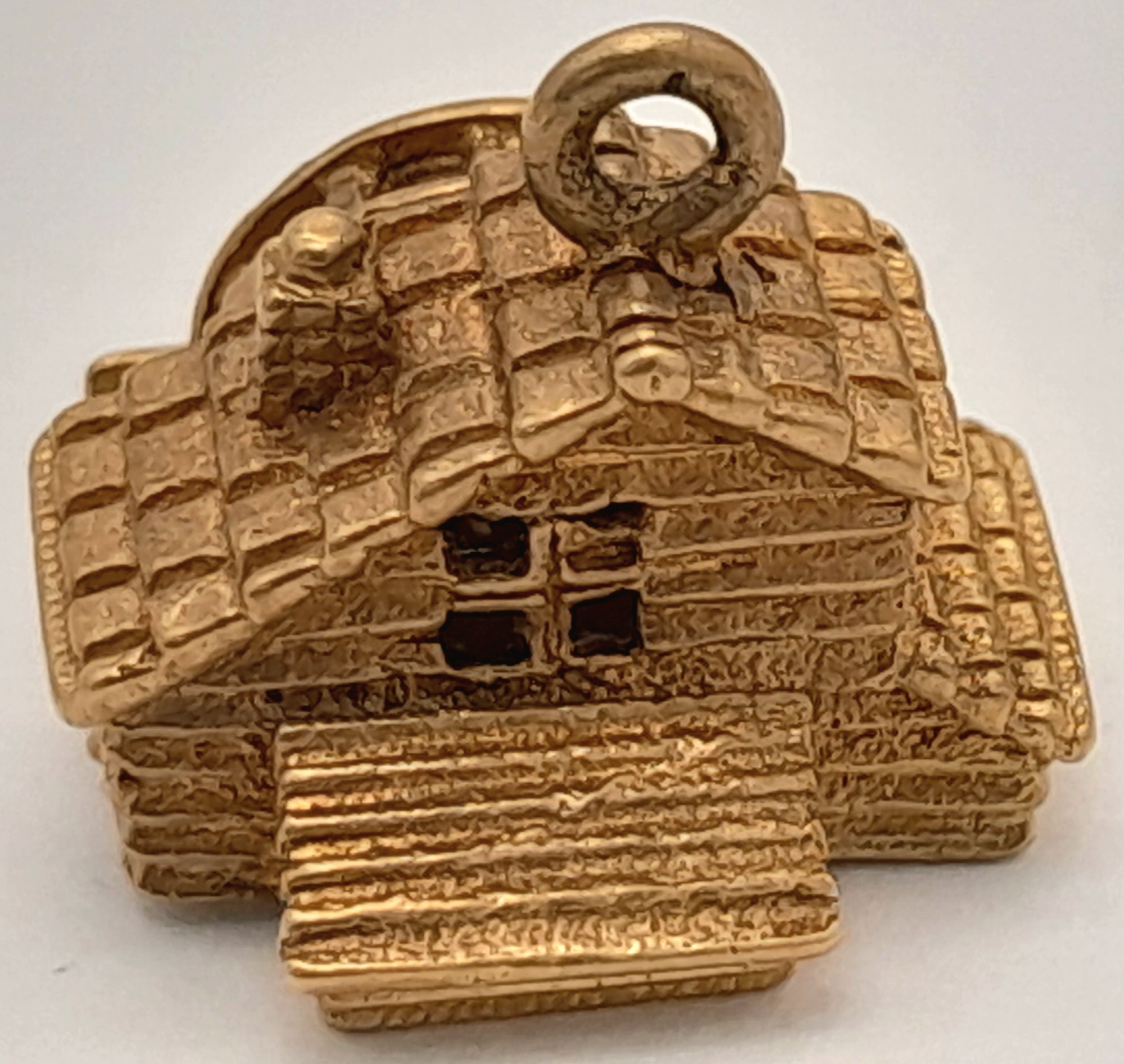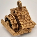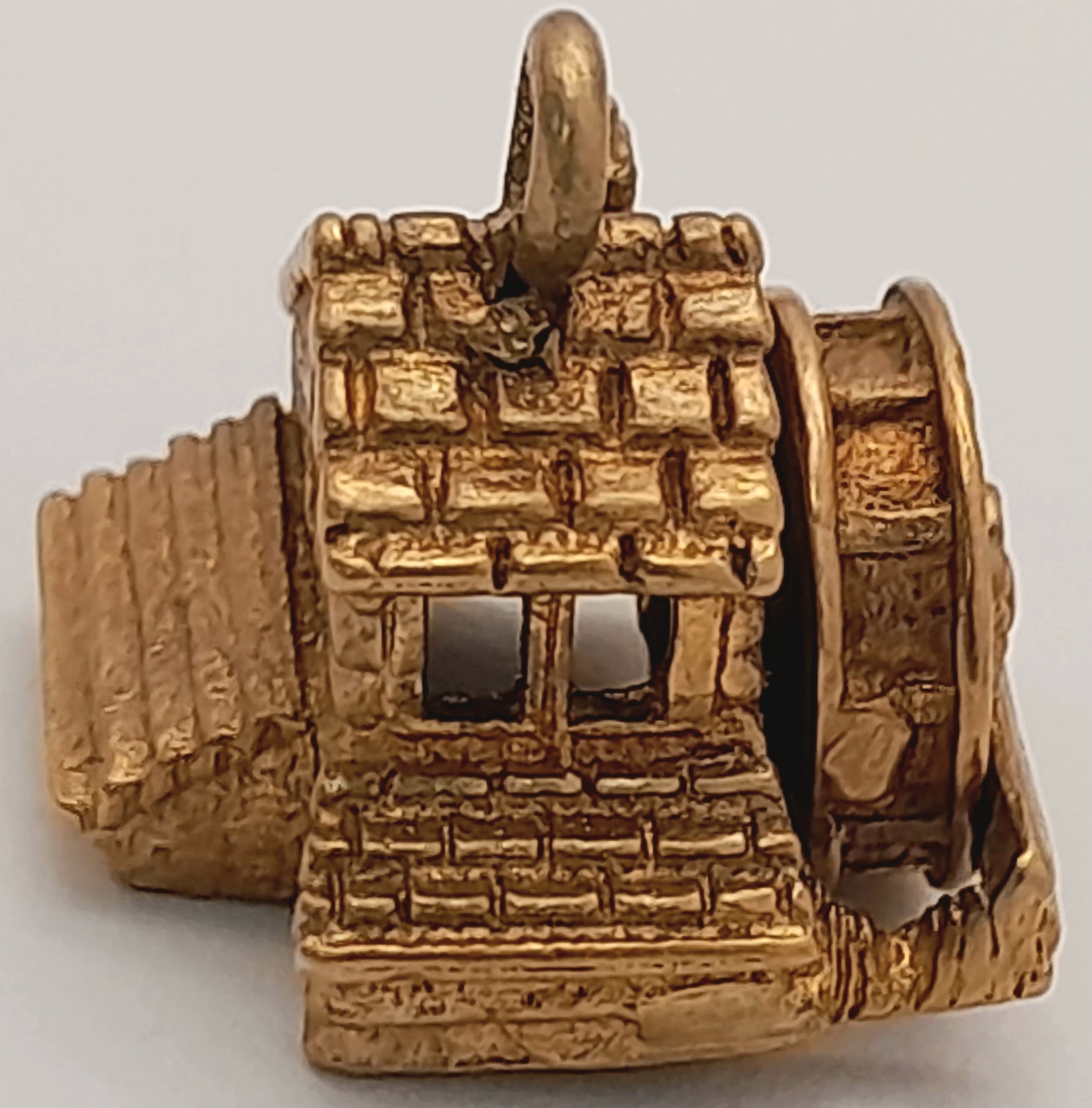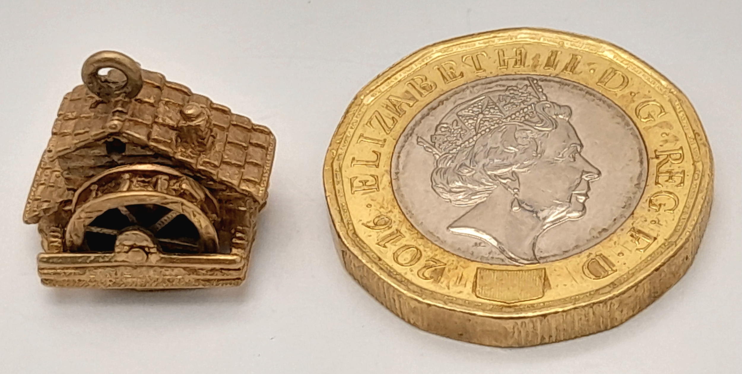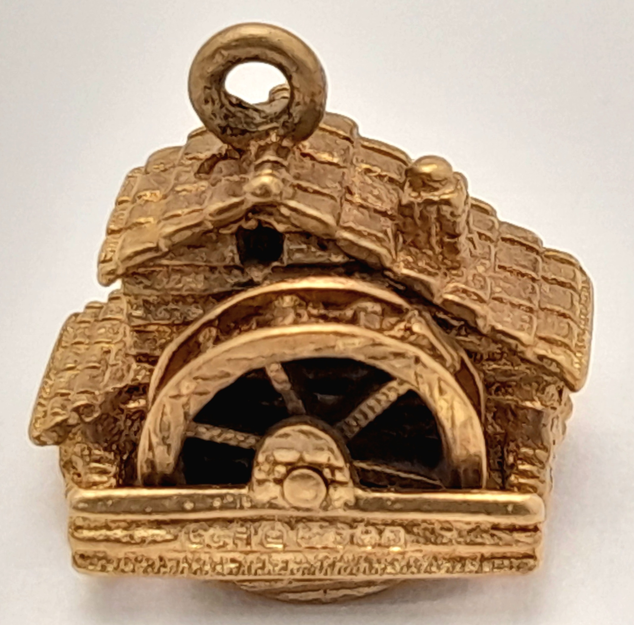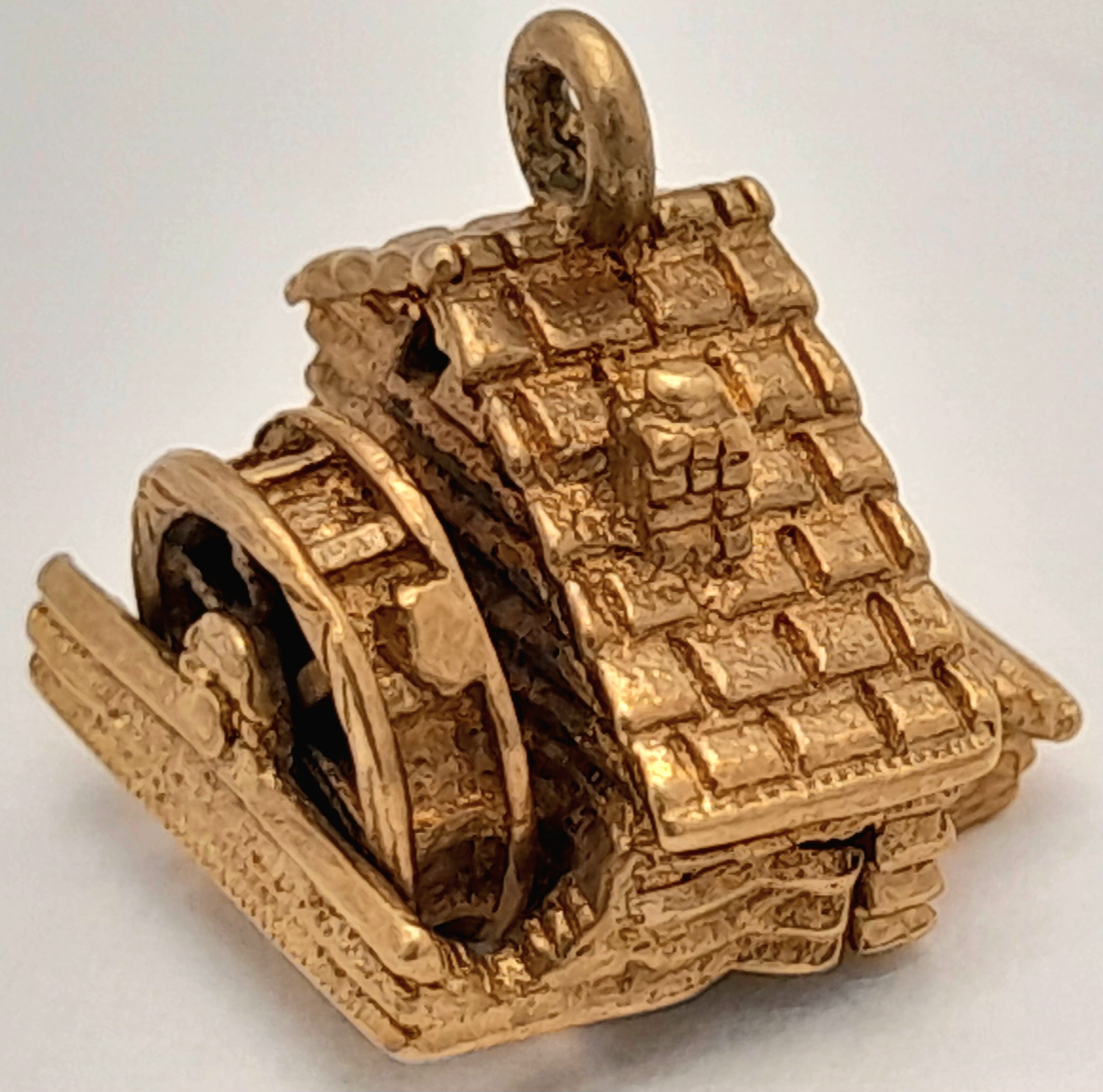 A 9K Yellow Gold House Pendant. Movable water wheel! 12mm. 3.1g.