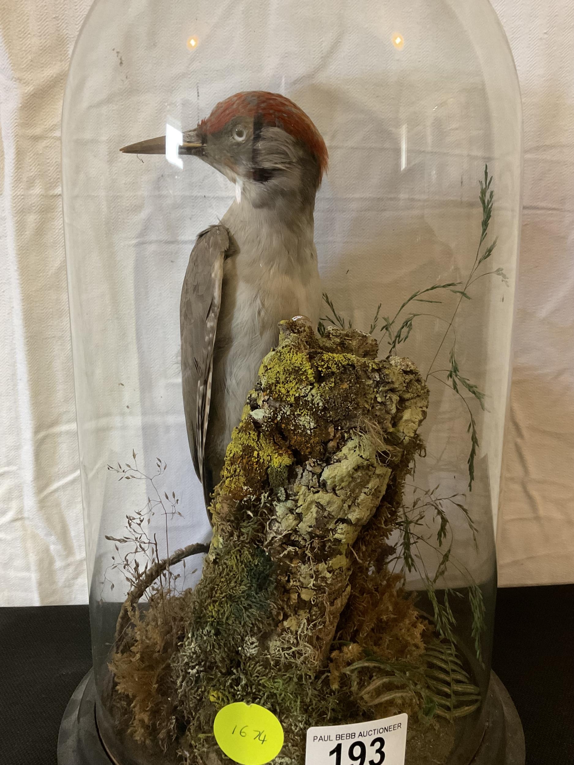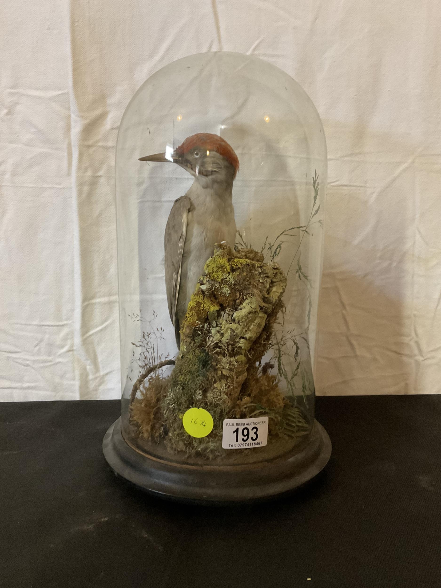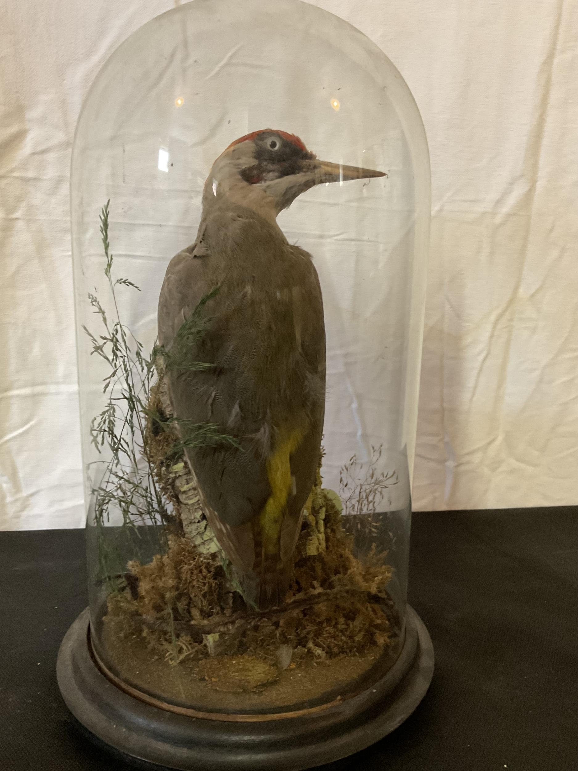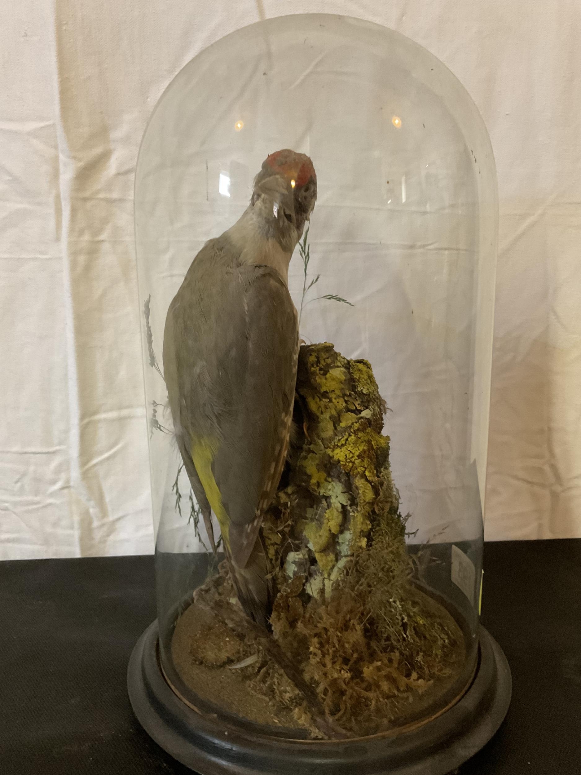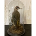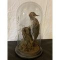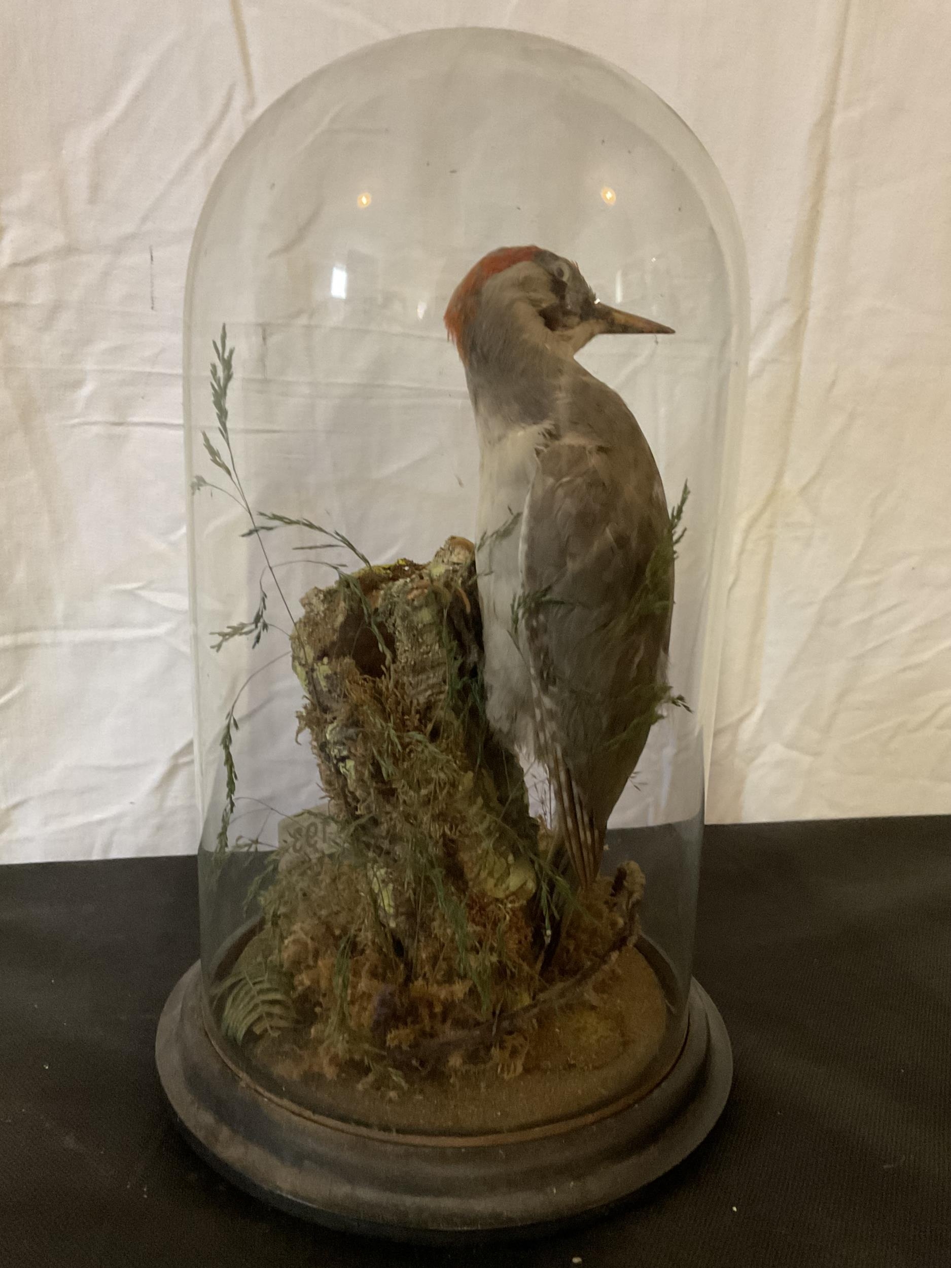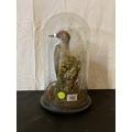 VICTORIAN TAXIDERMY WOODPECKER UNDER GLASS DOME H 13"