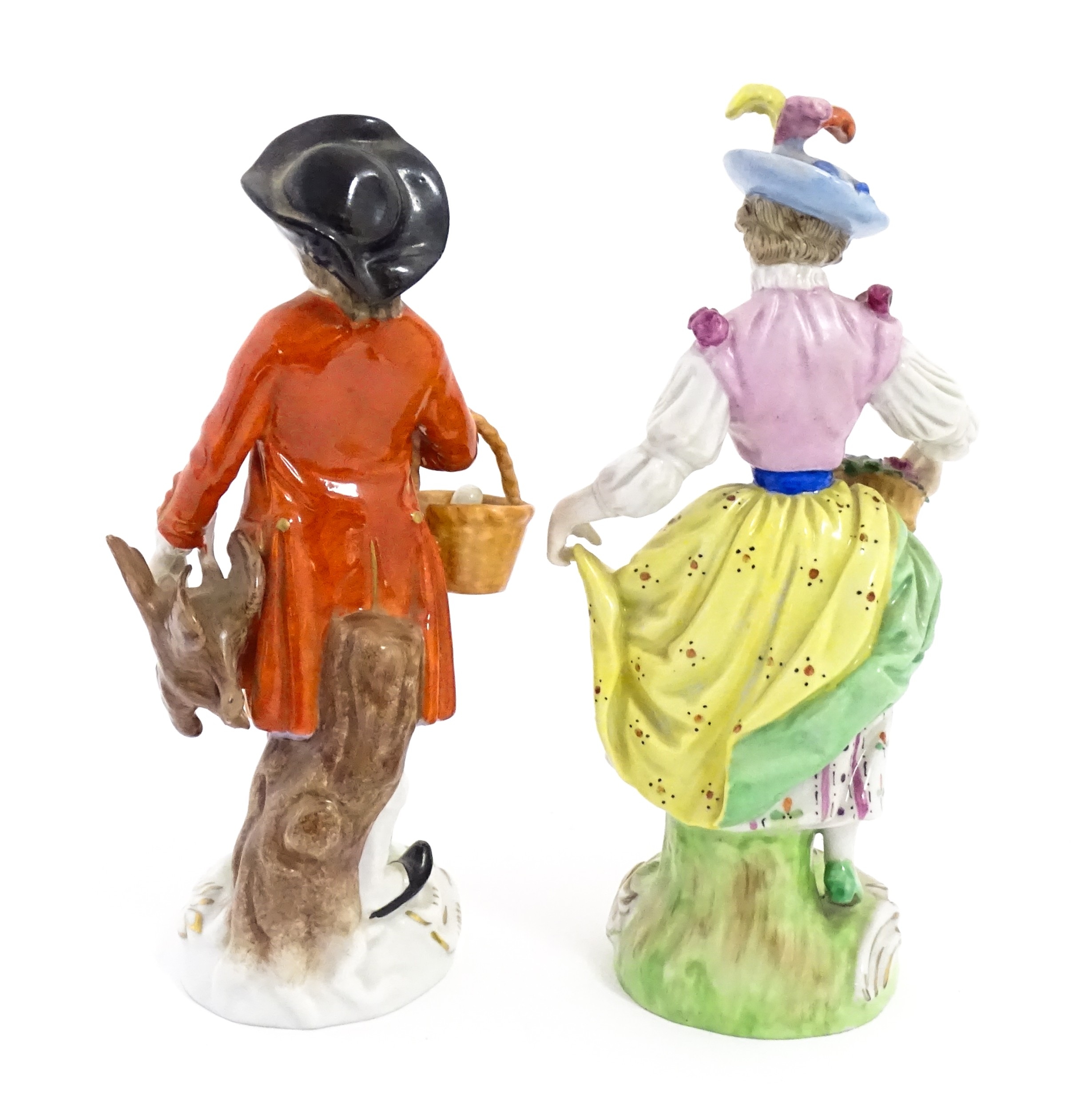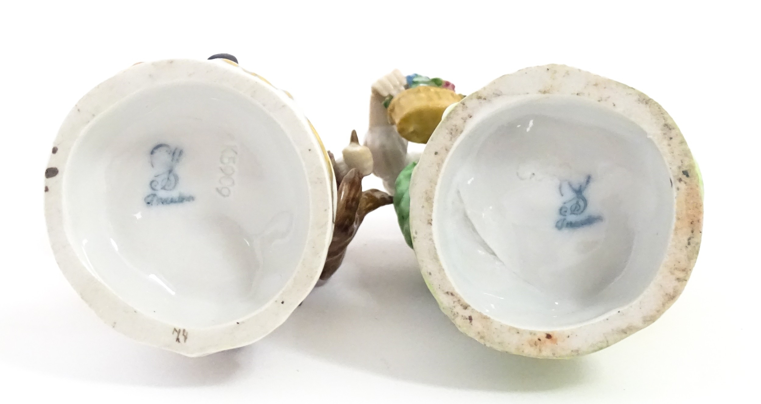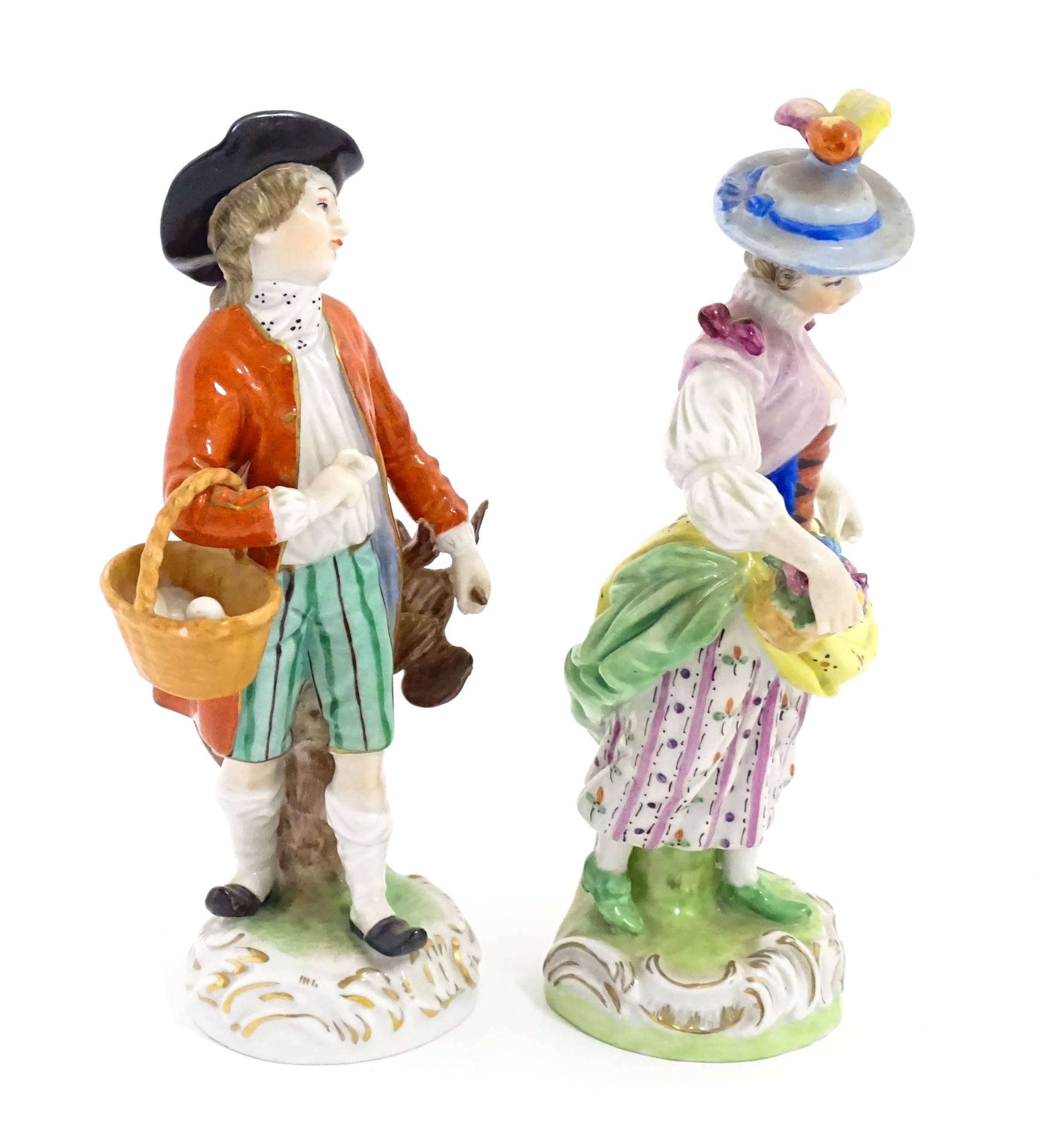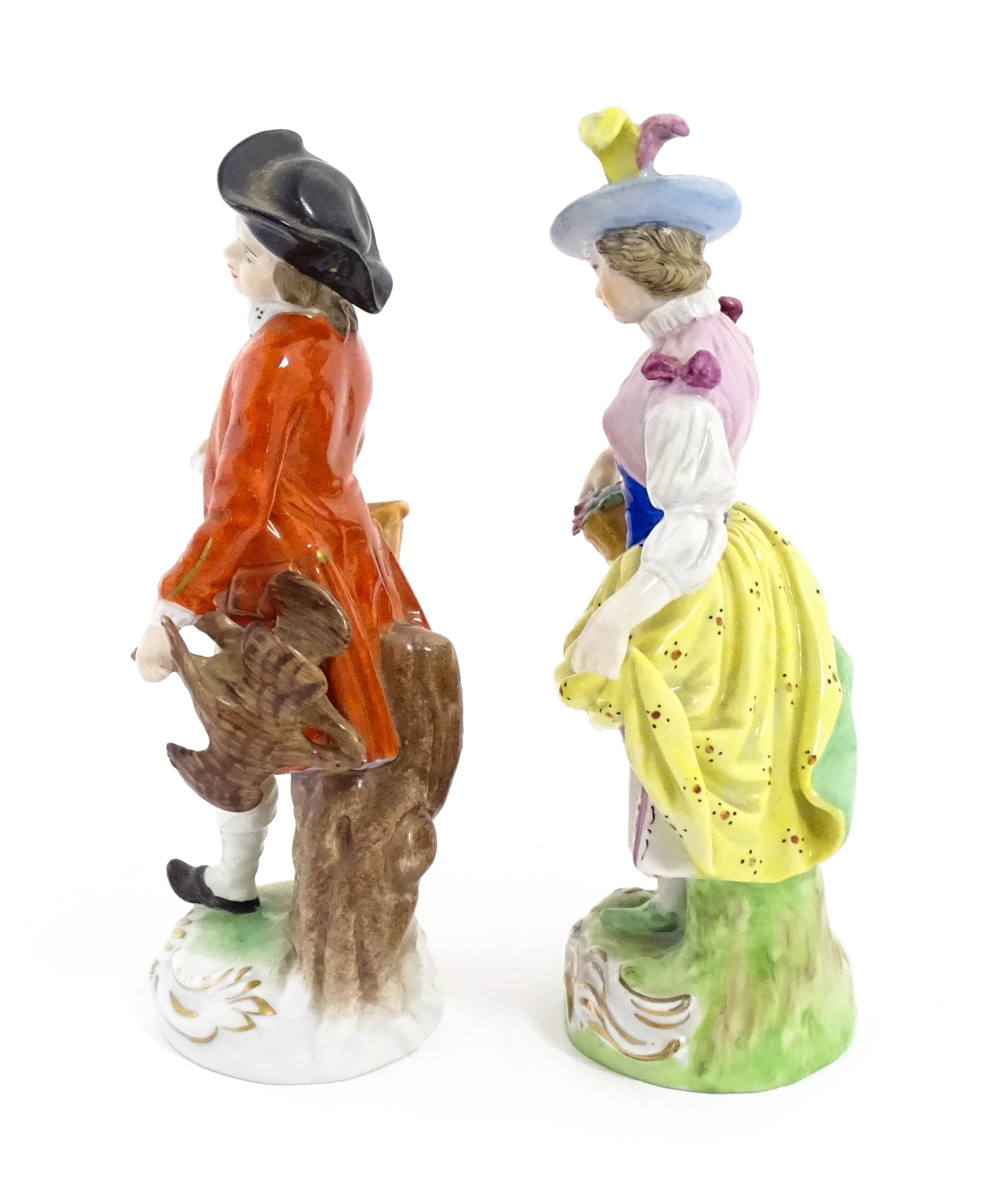 Two Dresden figures comprising The Game Seller, and Lady with Flowers. Marked under. Approx. 6" high (2)