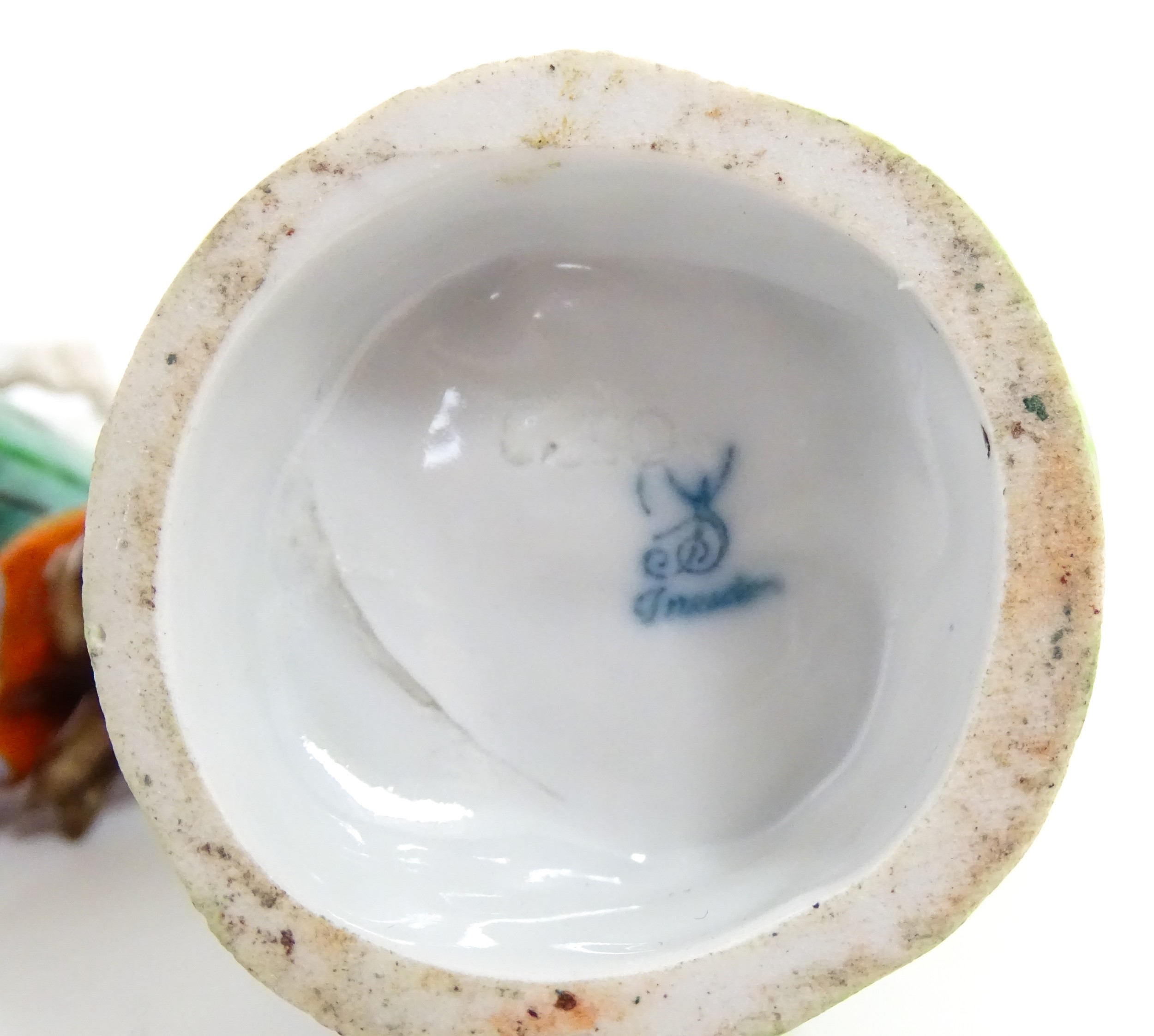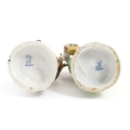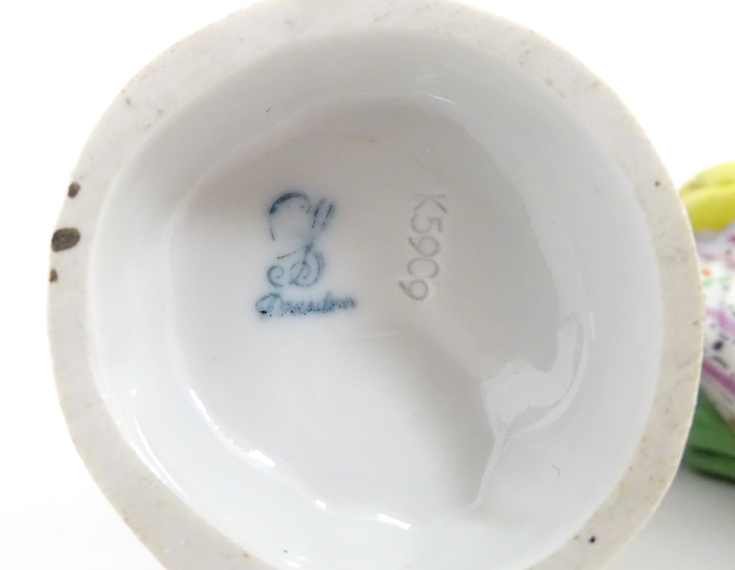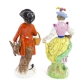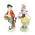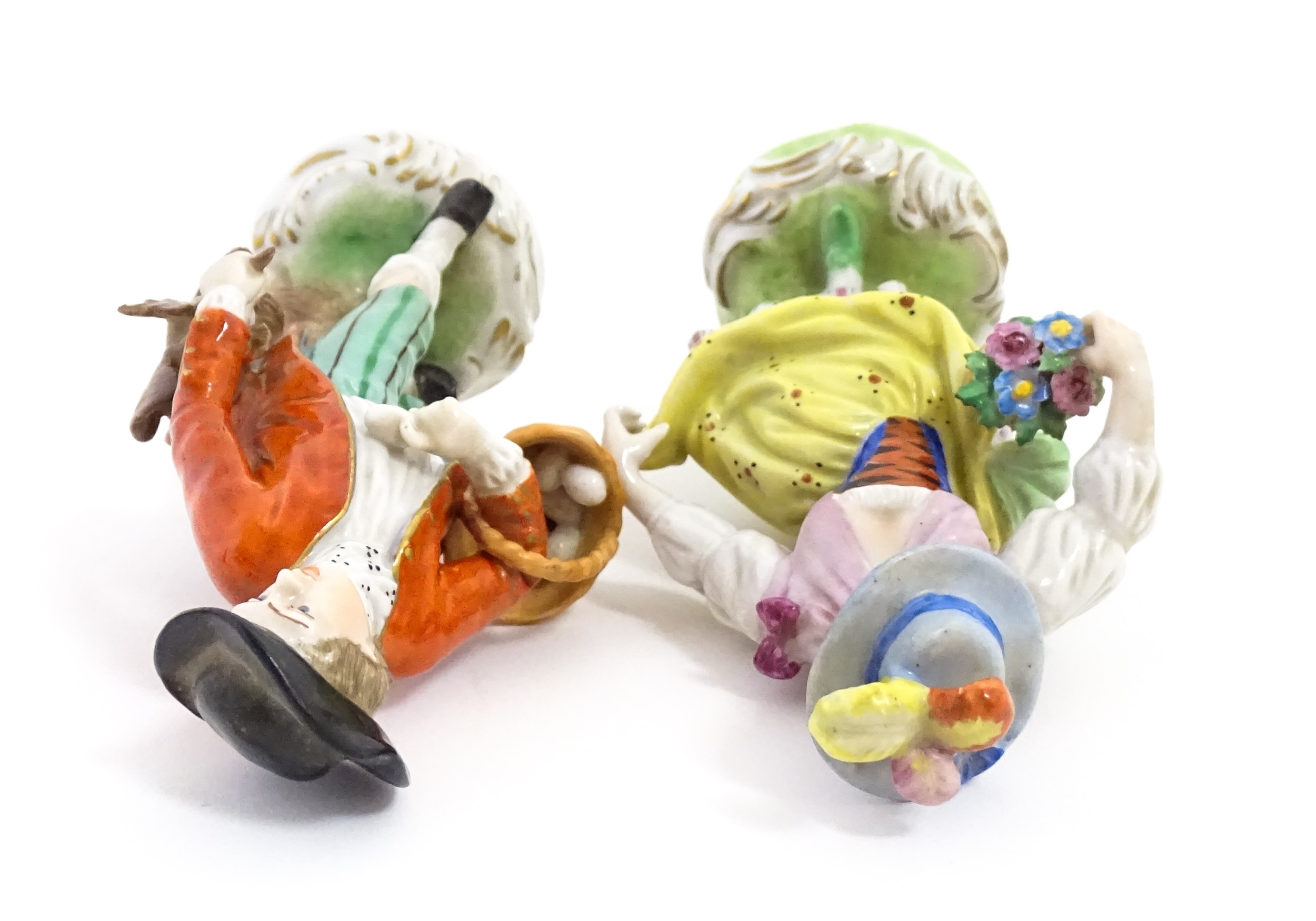 Two Dresden figures comprising The Game Seller, and Lady with Flowers. Marked under. Approx. 6" high (2)