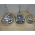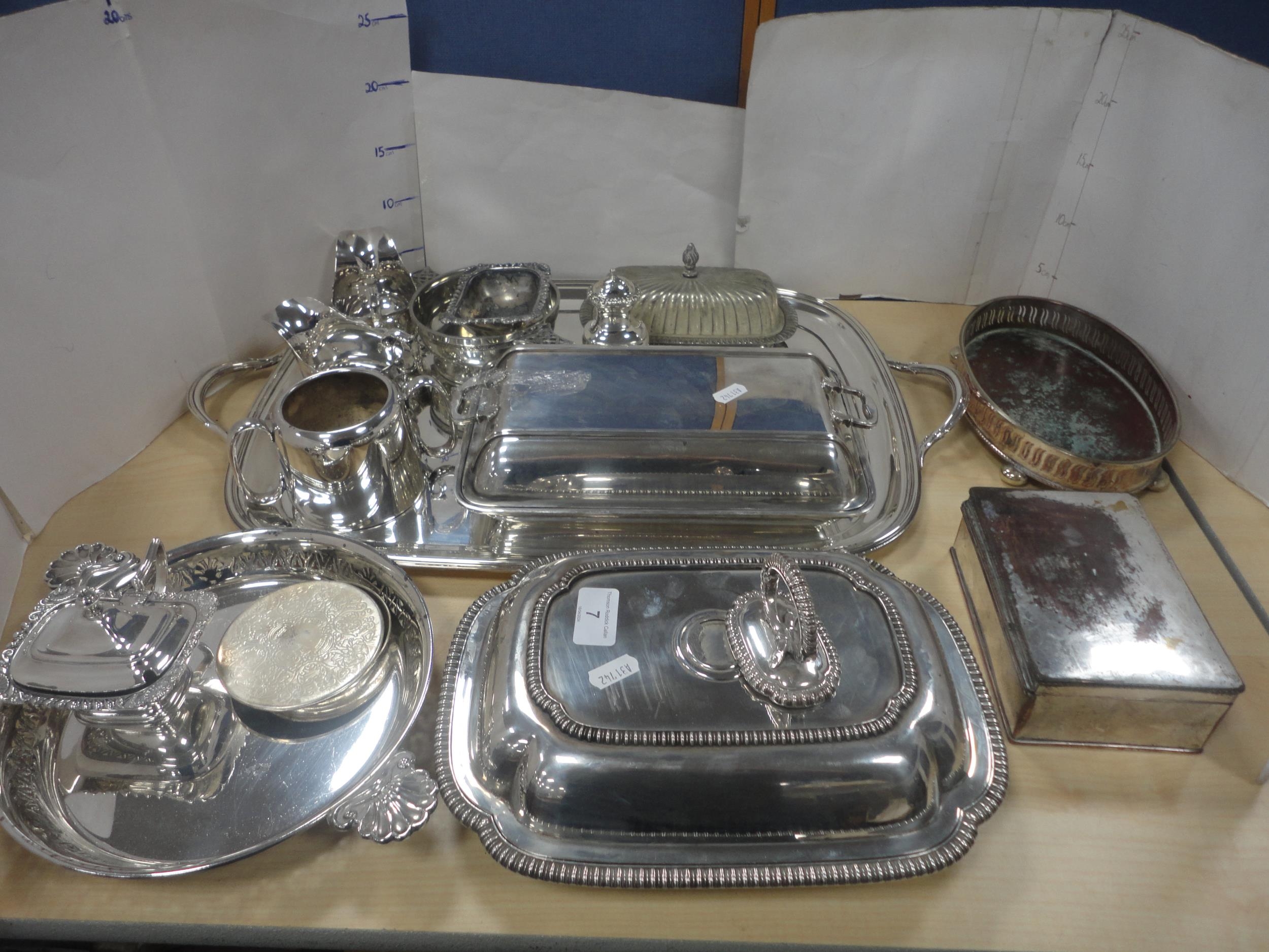 Collection of EPNS to include a serving tray, two sauce boats, box, mustard pot, entrée dishes, cigarette box etc.