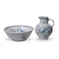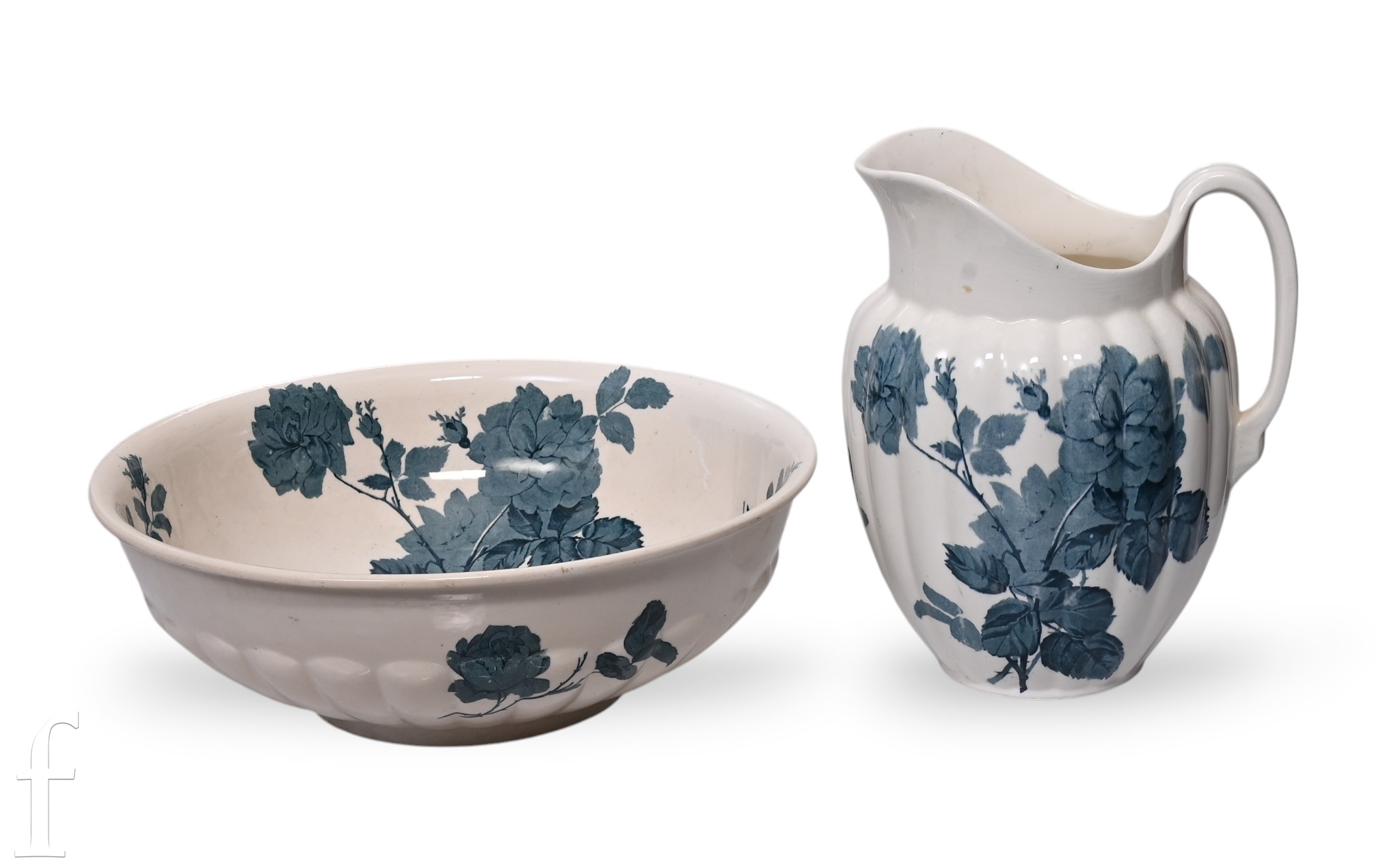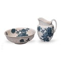 A late 19th Century Minton Nile pattern wash jug and bowl, circa 1900, the jug of fluted ovoid form with printed slate blue stemmed roses over ivory ground, printed marks, height of jug 19cm, diameter of bowl 38cm. (2)