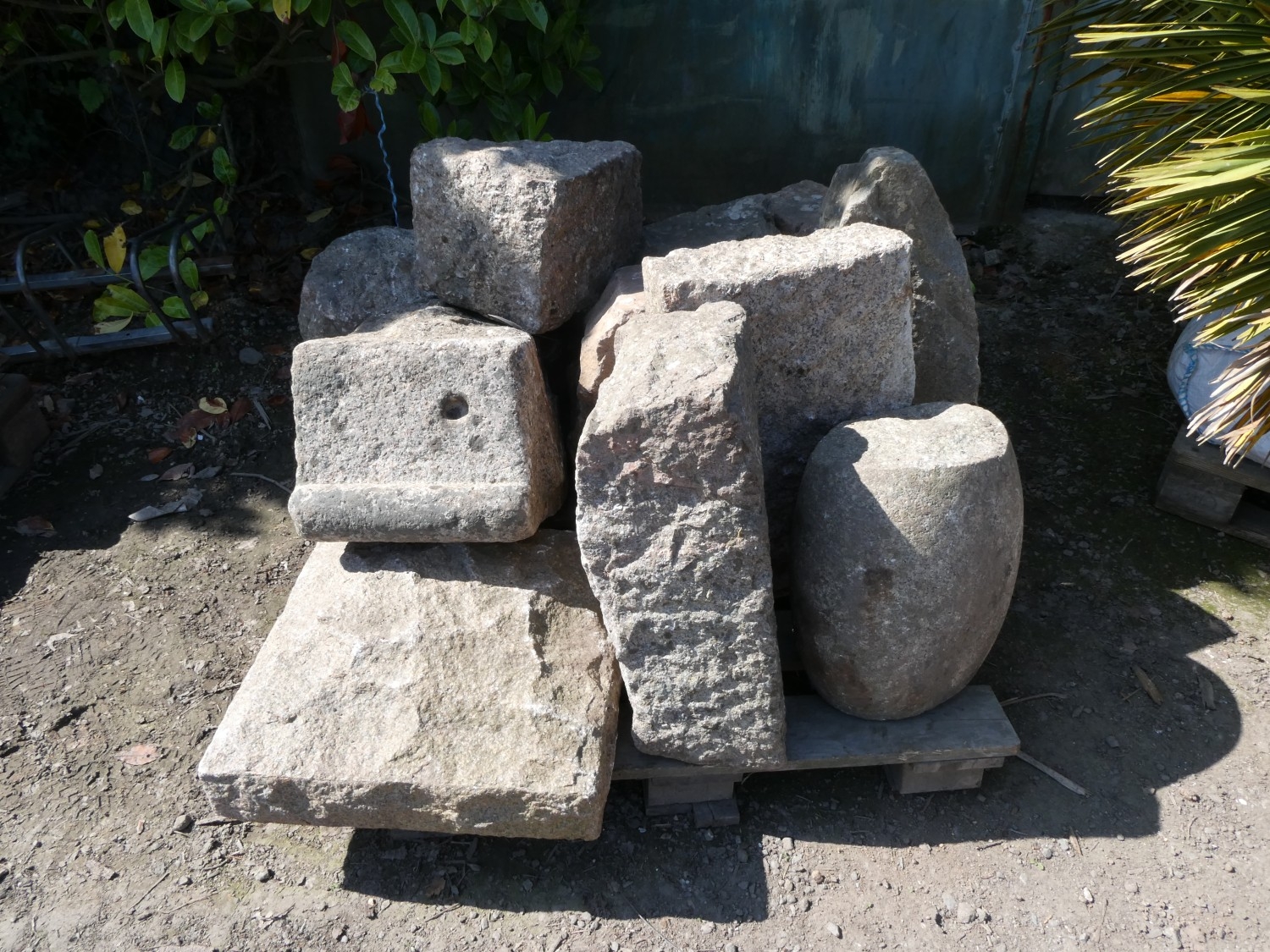 An assortment of granite to include a corbel, a cap stone, various lintels/steps etc.