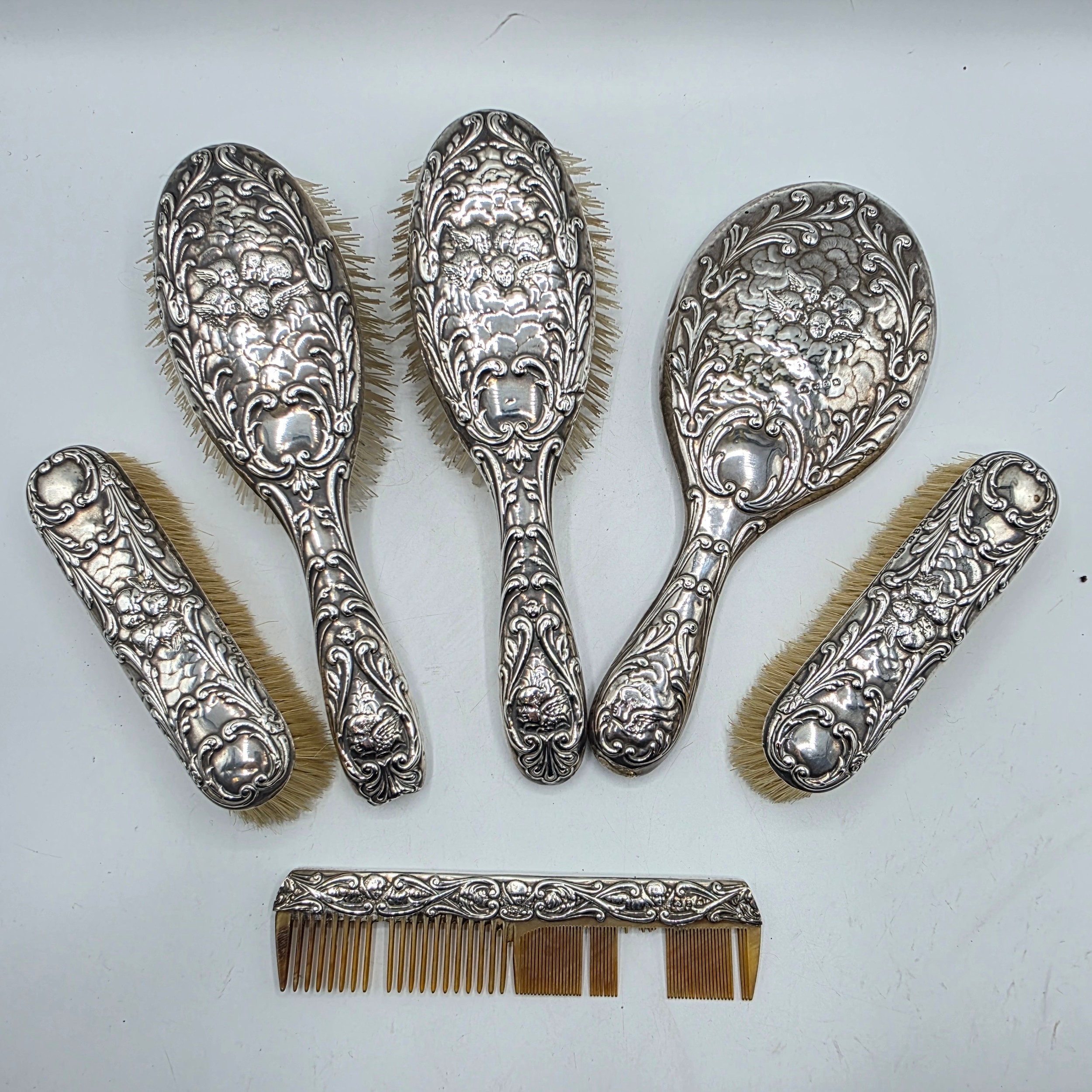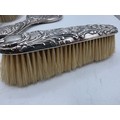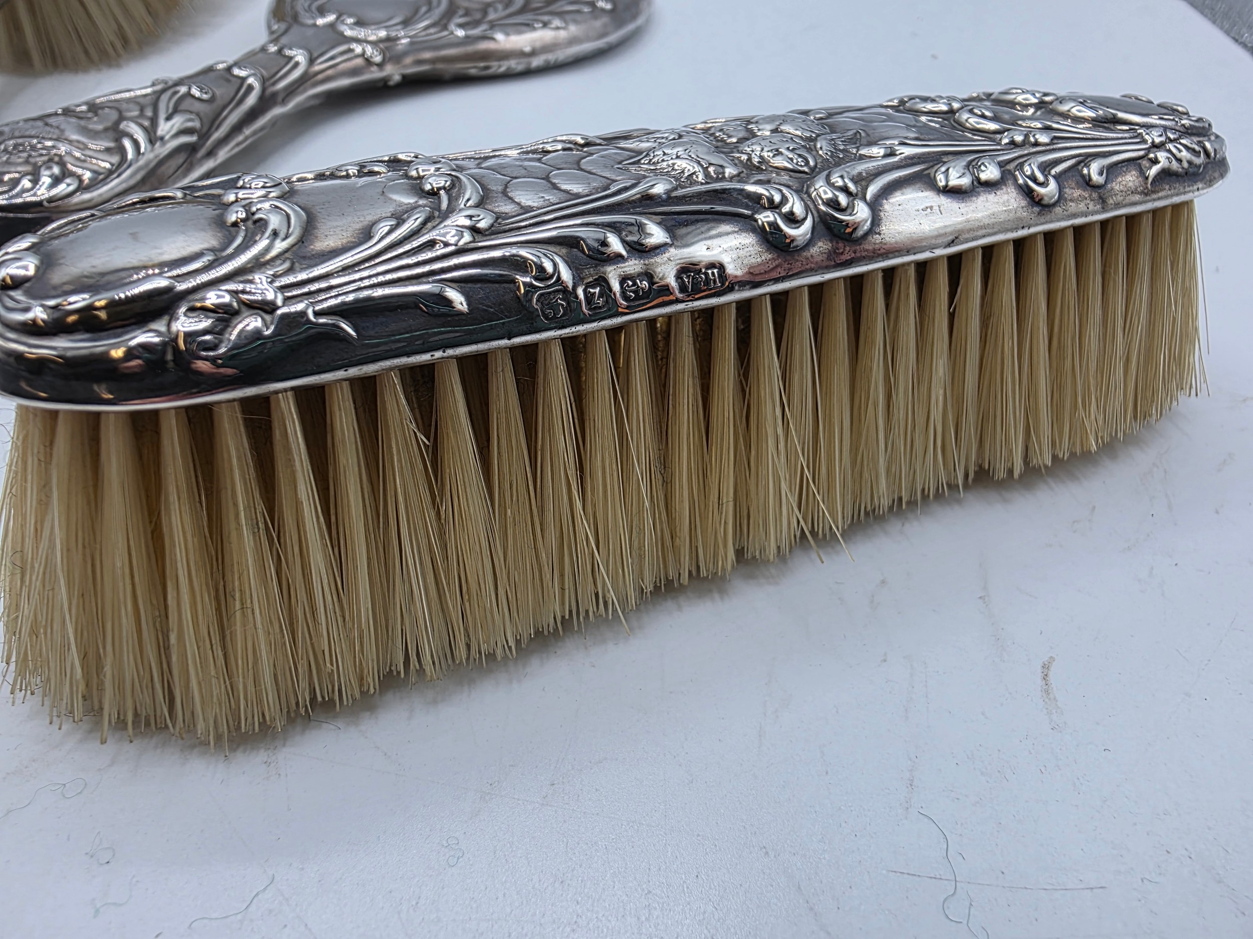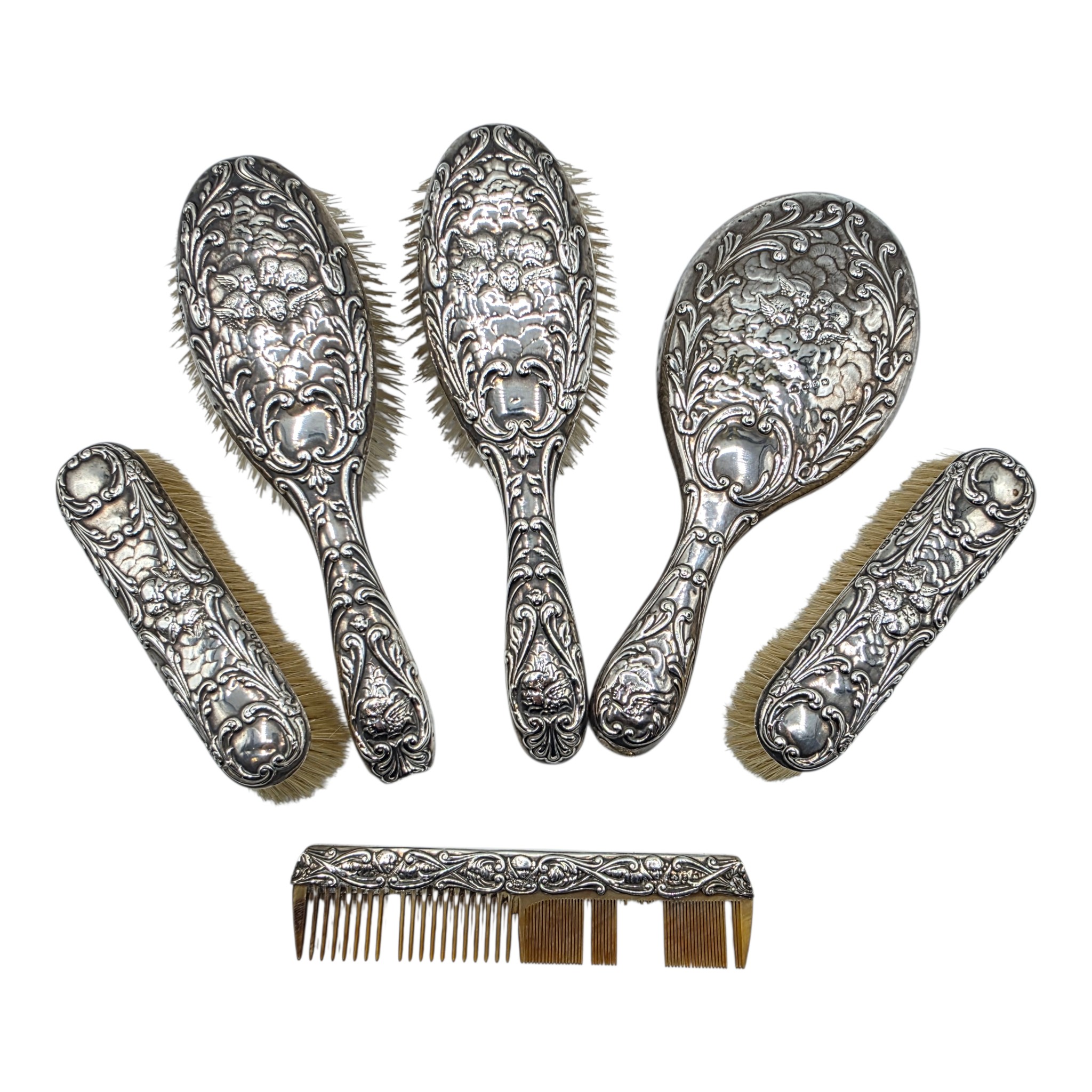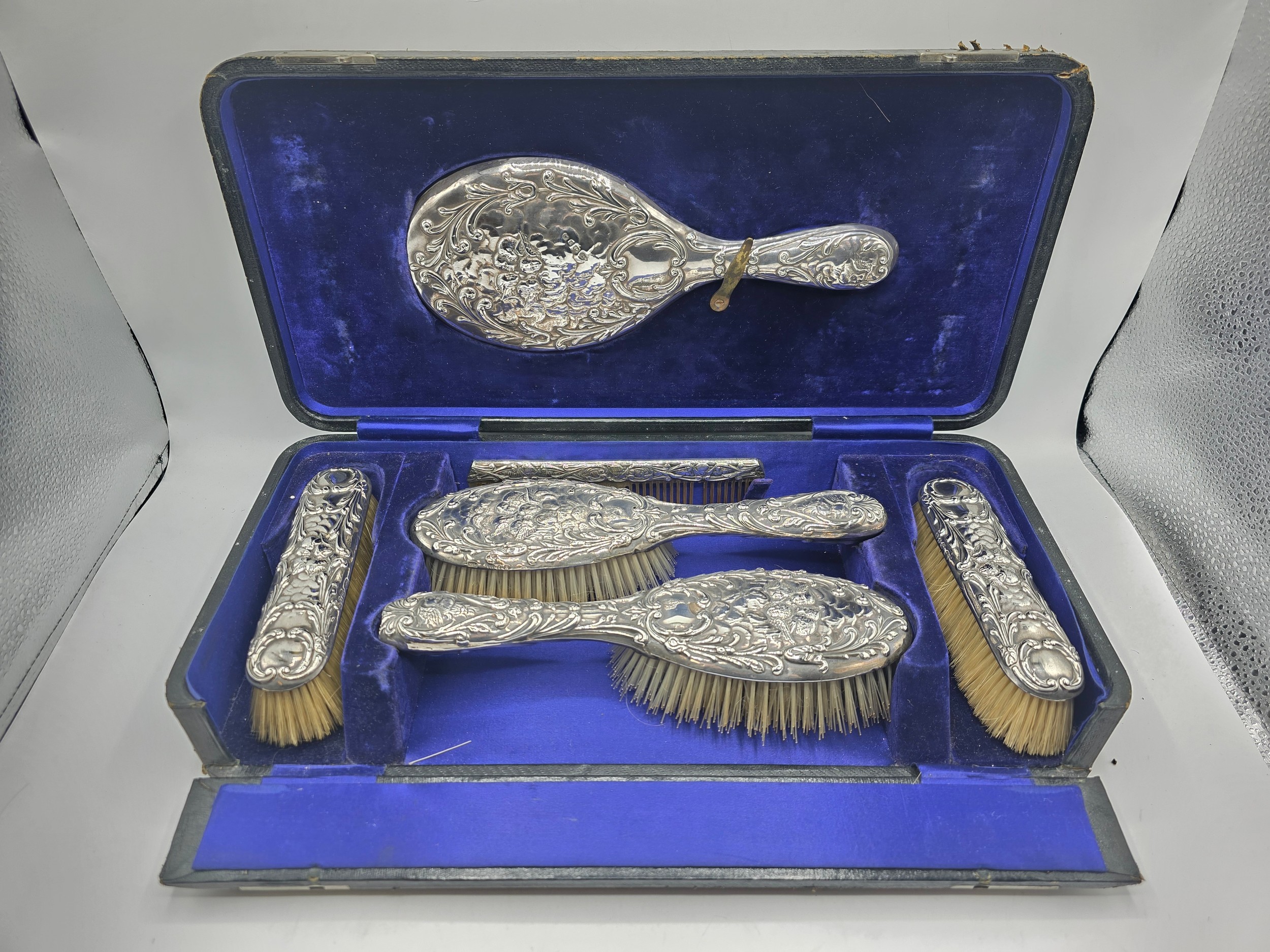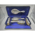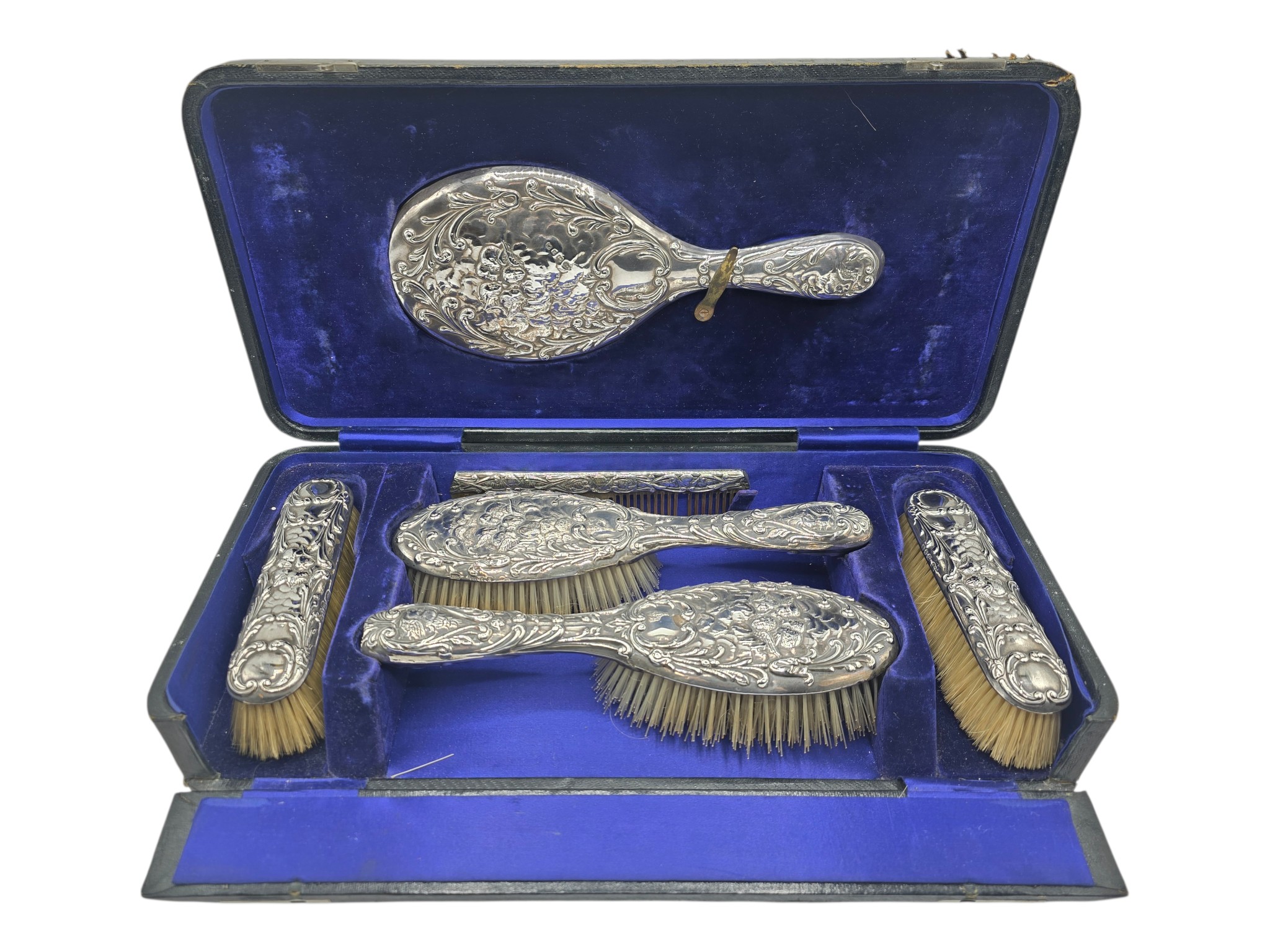 A sterling silver mounted travel dressing table set in blue velvet lined leather covered box, by Horton and Allday, Birmingham, 1899.