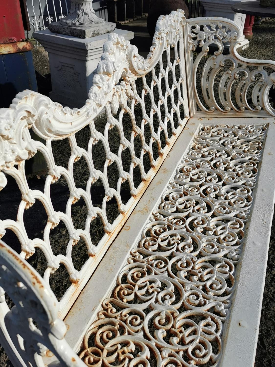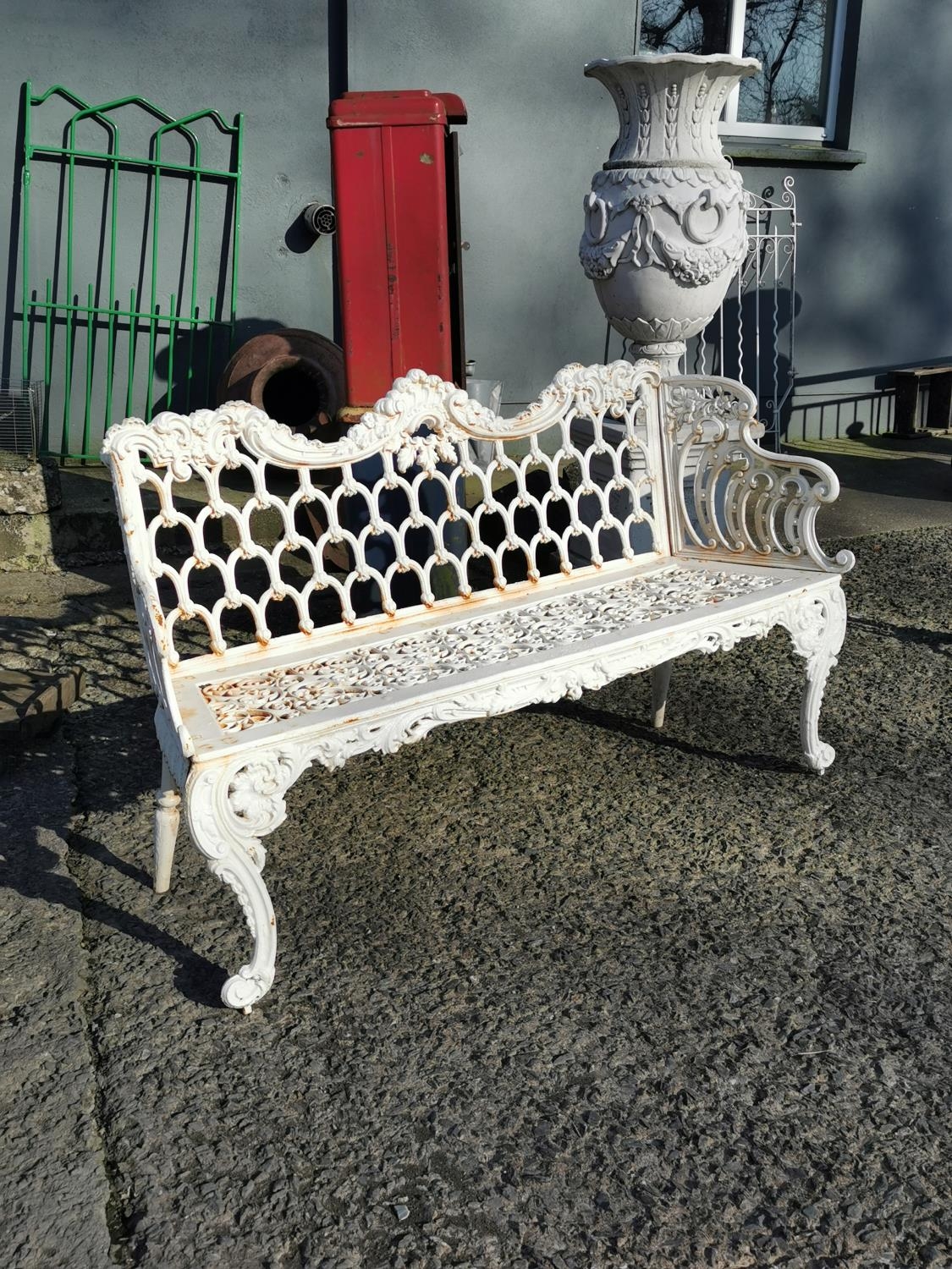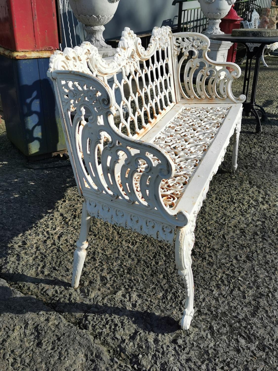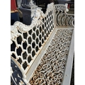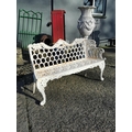 Decorative cast iron three seater garden bench {91 cm H x 148 cm W x 52 cm D}.