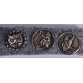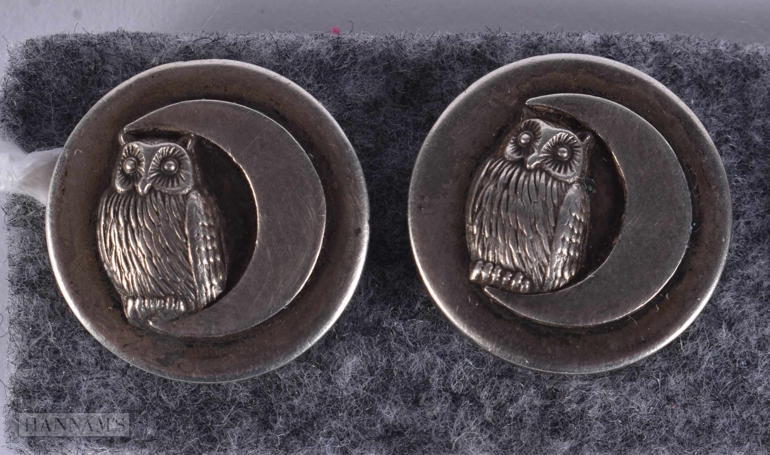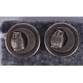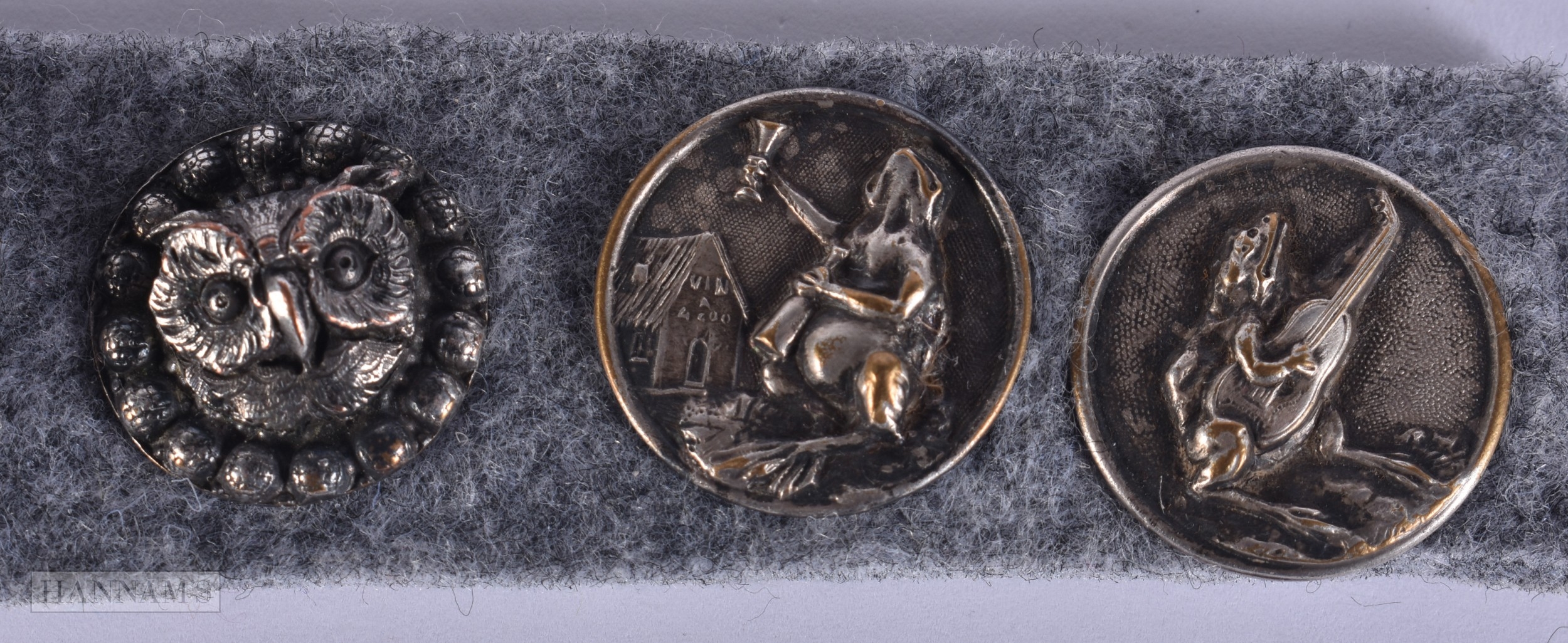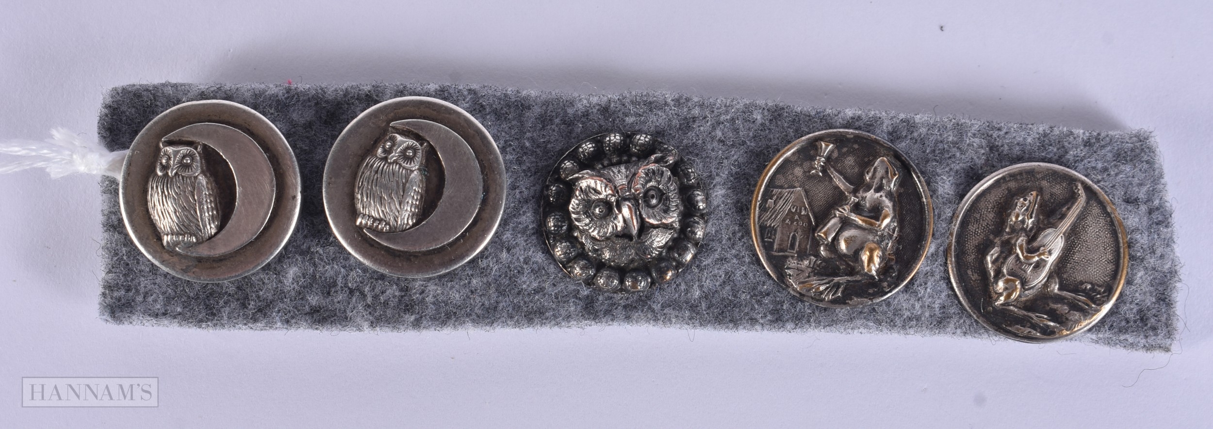 A LOVELY SET OF ANTIQUE NOVELTY OWL AND TOAD BUTTONS/TOGGLES. 1.75 cm wide. (5)