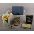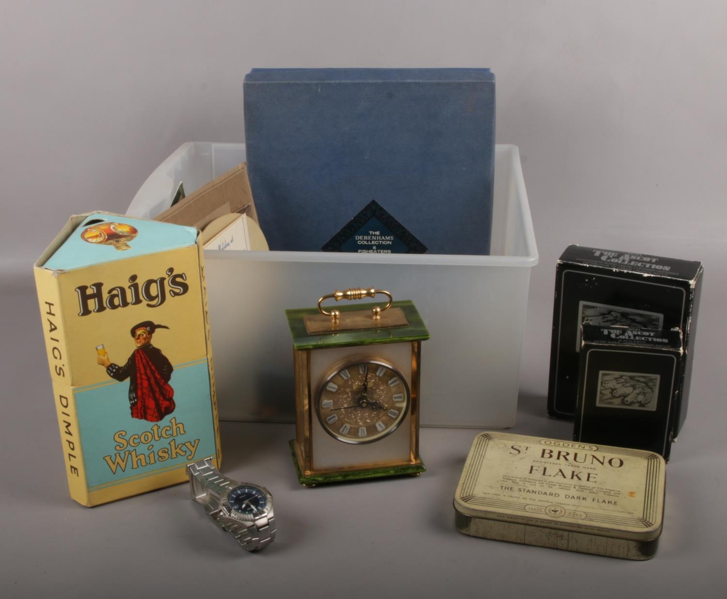 A Box of collectables, Bentima mantel clock, Avon The Ascot Collection Aftershave, Haig's Dimple empty bottle, Boxed silver plated fish cutlery, Sekonda Men's Quartz wrist watch etc