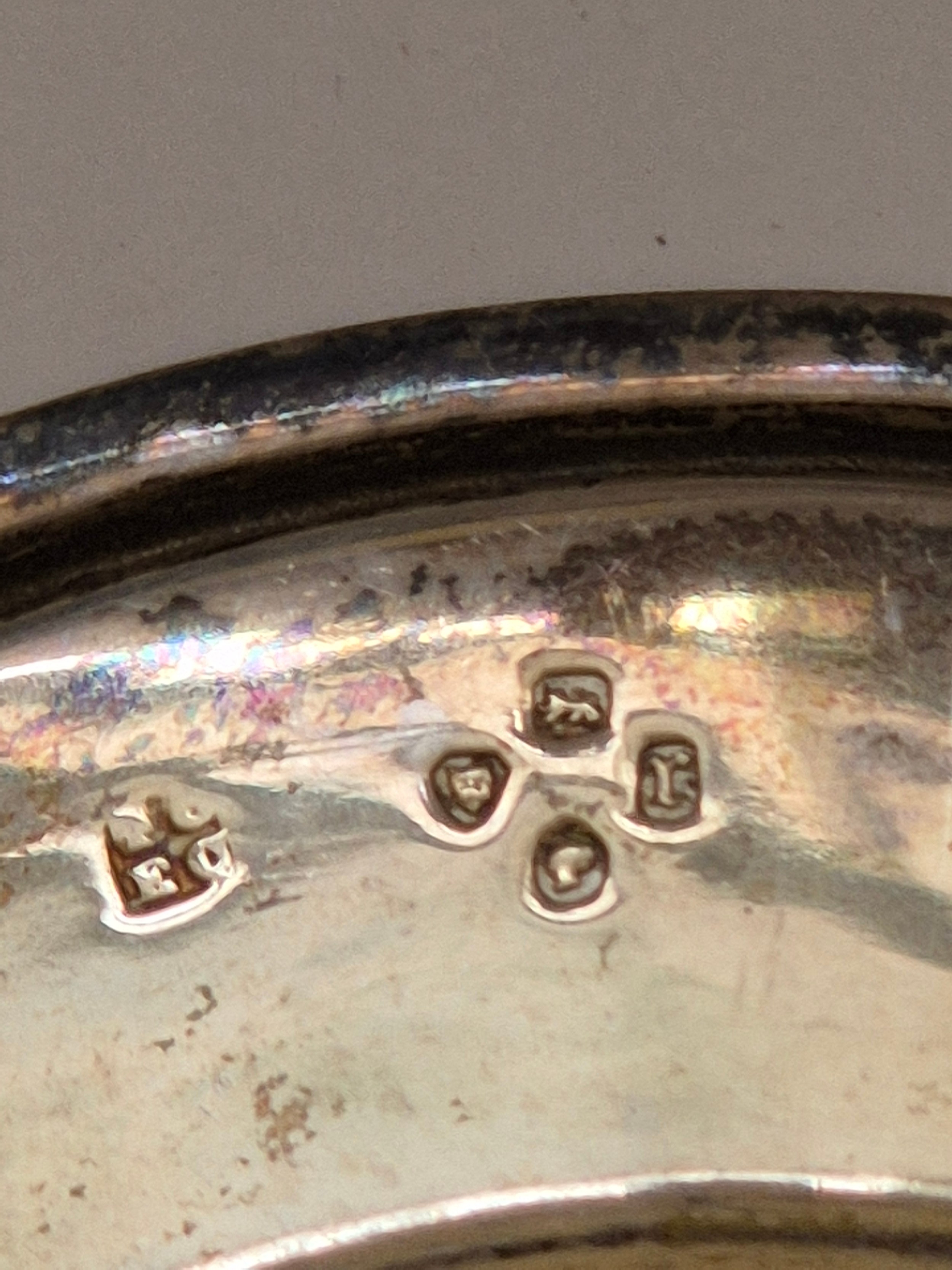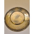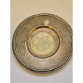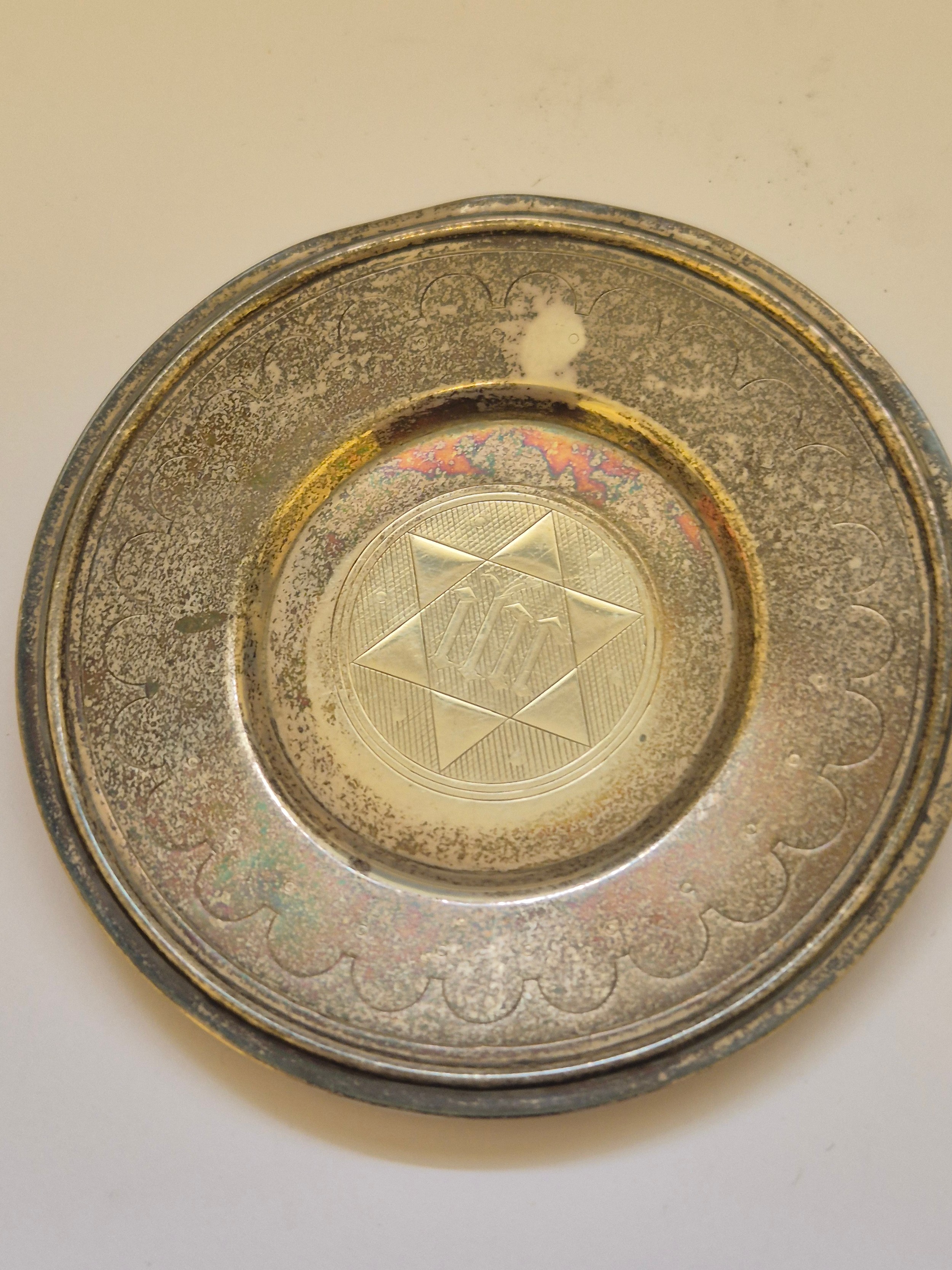 English silver Judaica Kiddush cup plate, engraved with the Star of David with the initials I.H.R. inside. The underside is hallmarked for London 1872. 9.5cm diameter. 38 grams