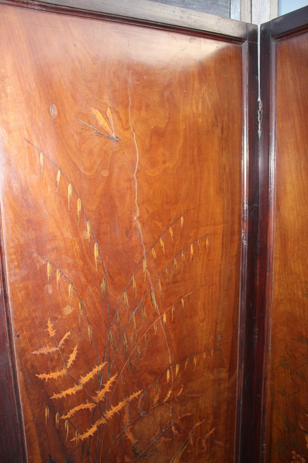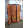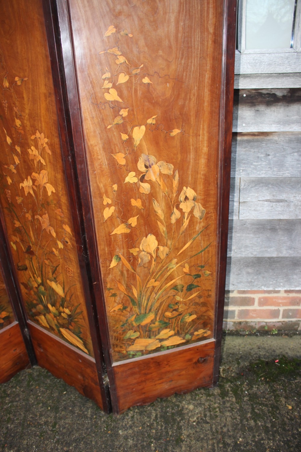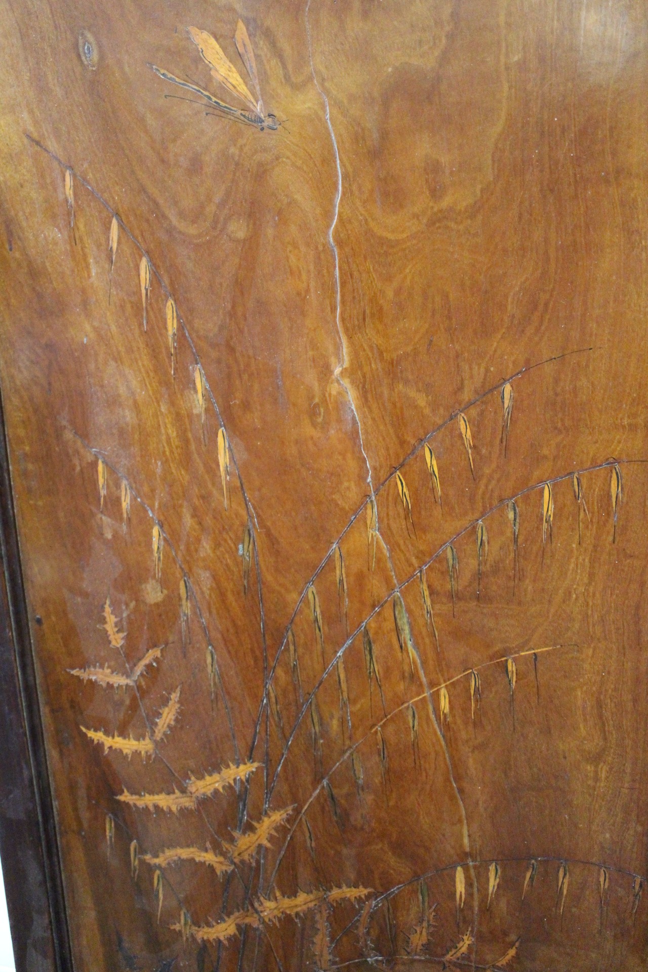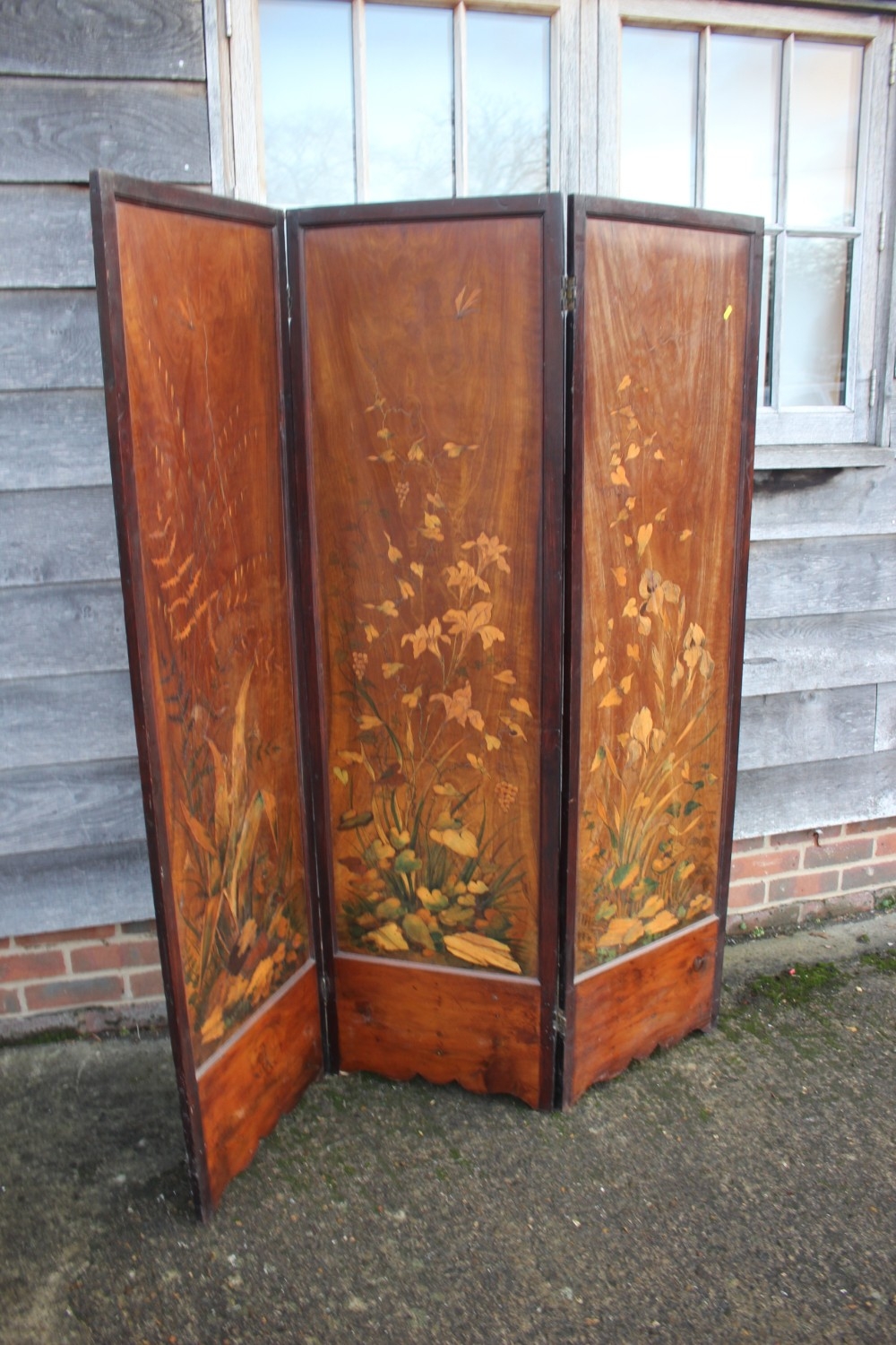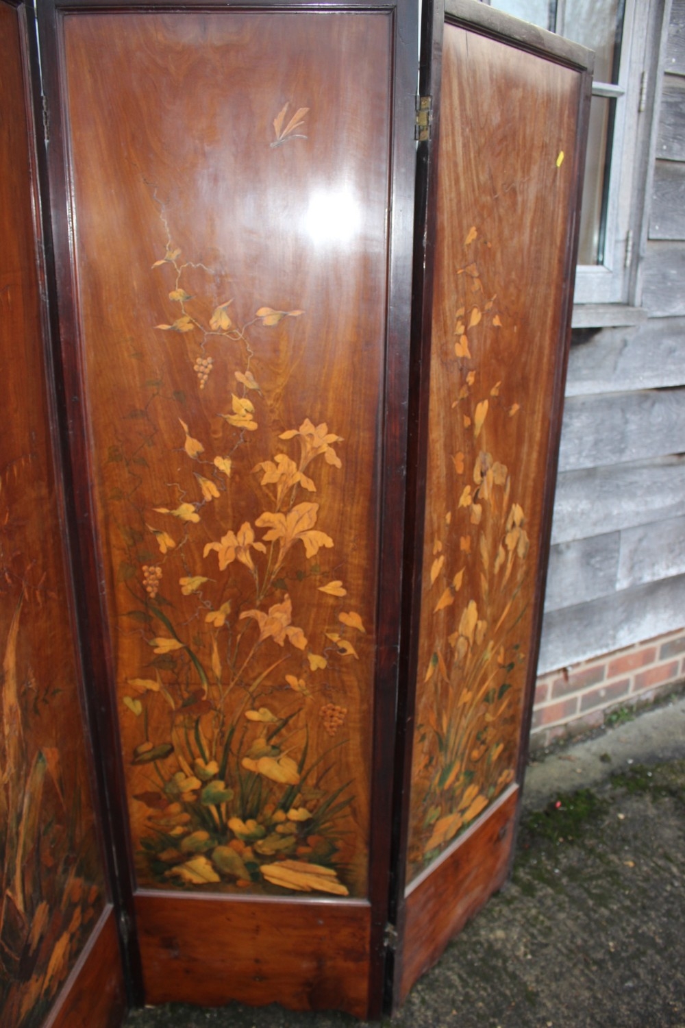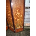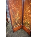 An Art Nouveau marquetry three-fold screen/room divider, decorated flora and insects, 54" wide overall x 65" high