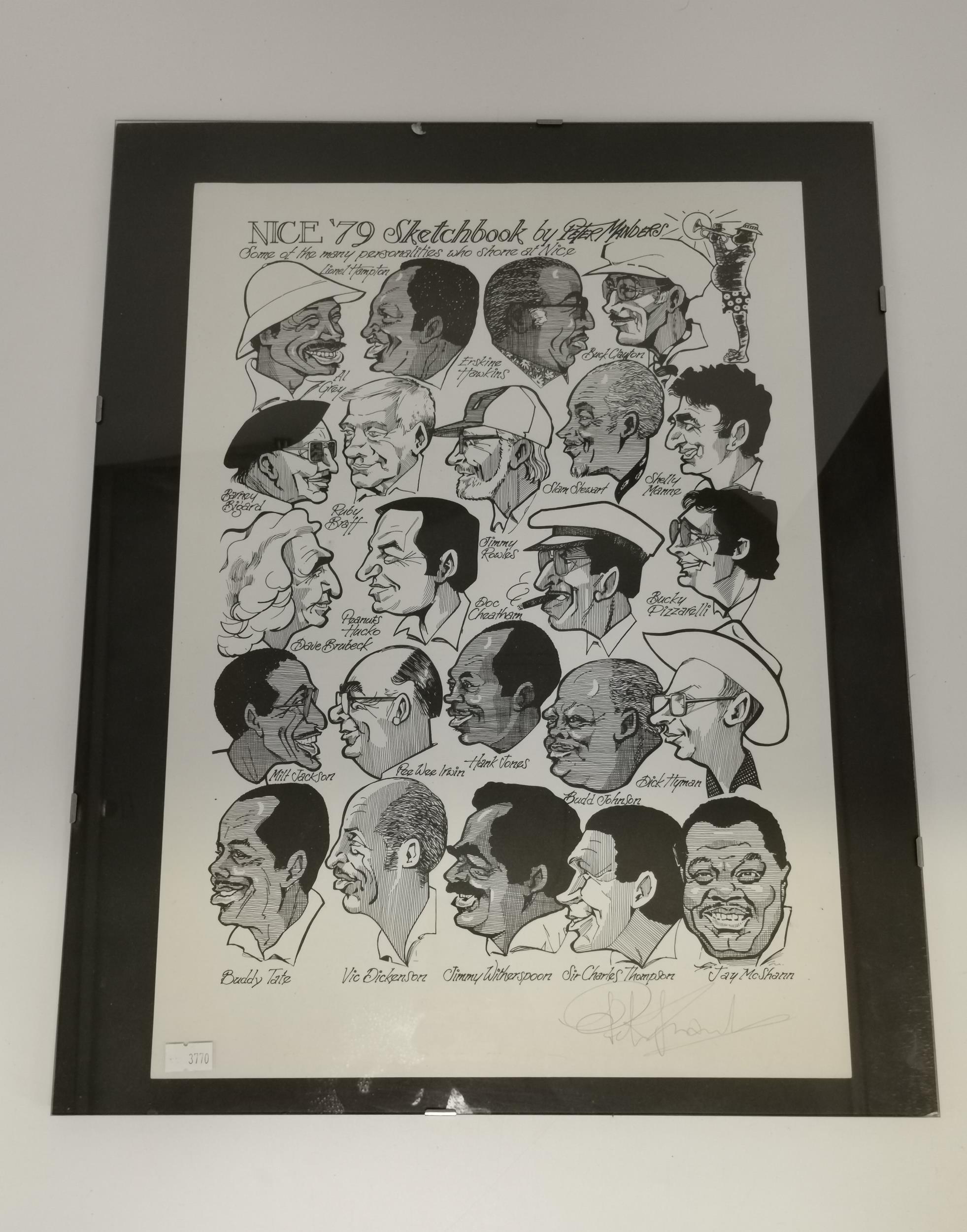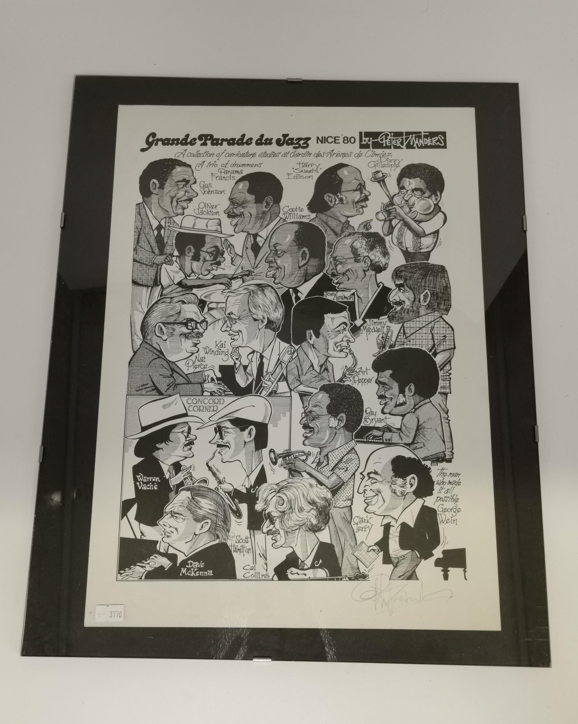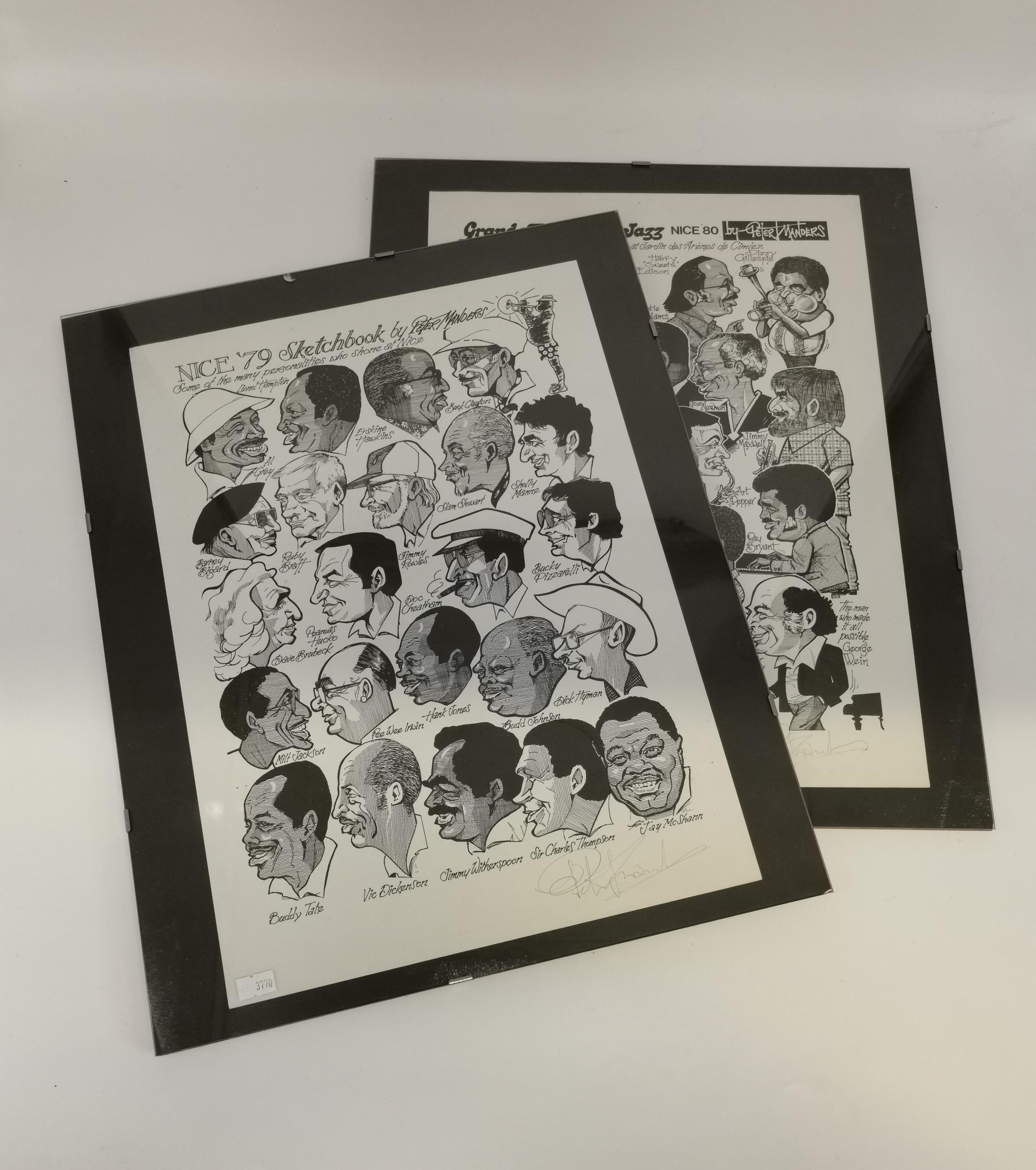 After Peter Manders (1936-2019), Grande Parade du Jazz, Nice, 1979 and 1980, two posters, multi-portrait ink caricature studies of jazz musicians, both signed in pencil by the artist, in clip frames. (2) 45cm by 32cm