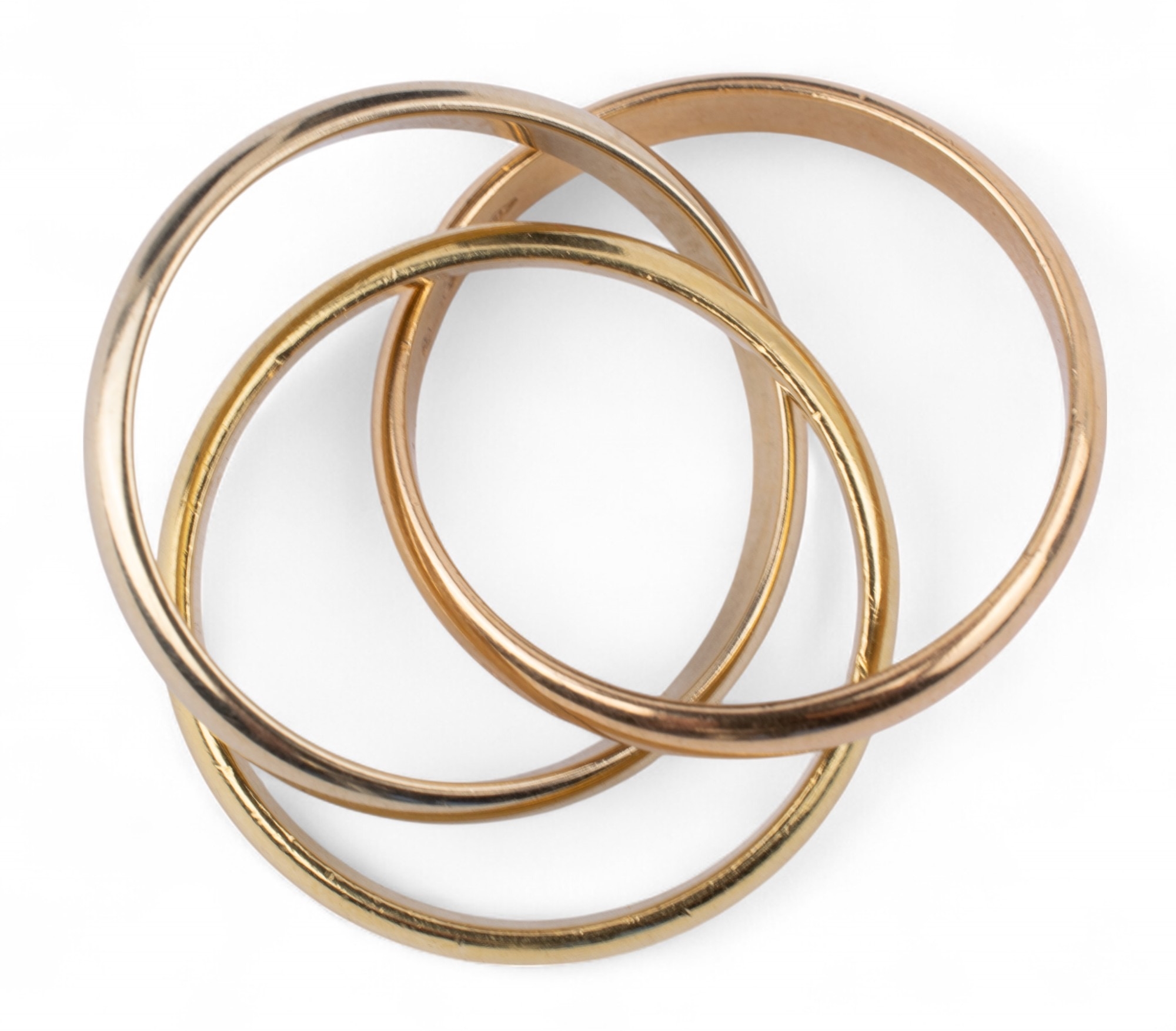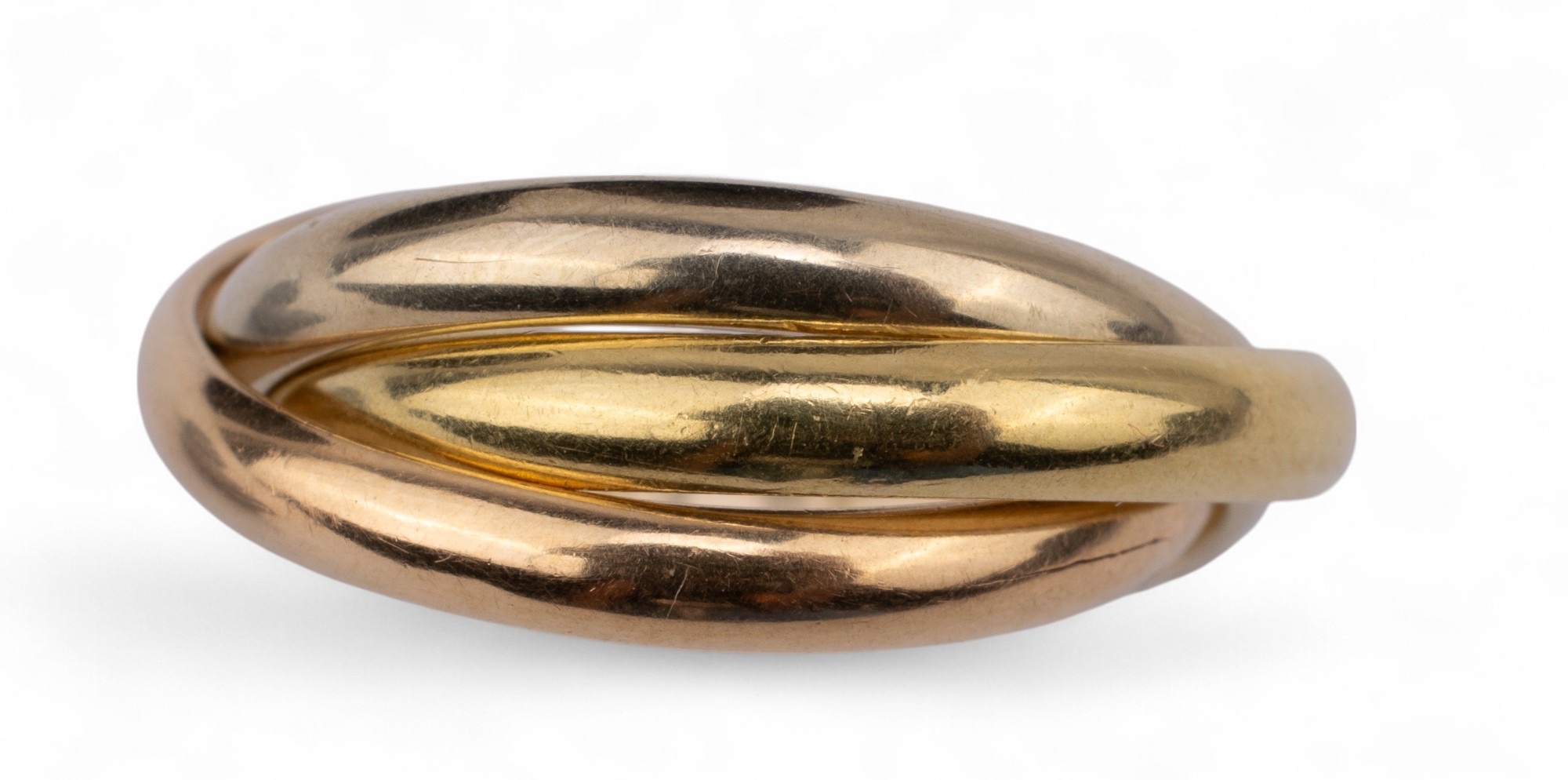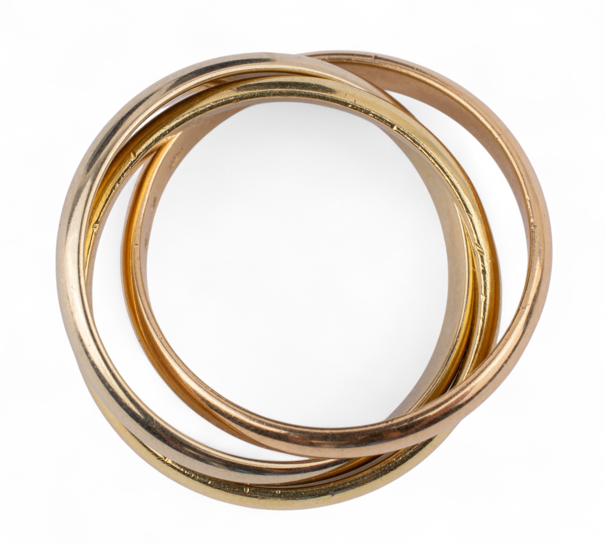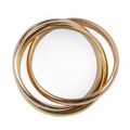 A Russian wedding ring, composed of white, rose and yellow gold bands