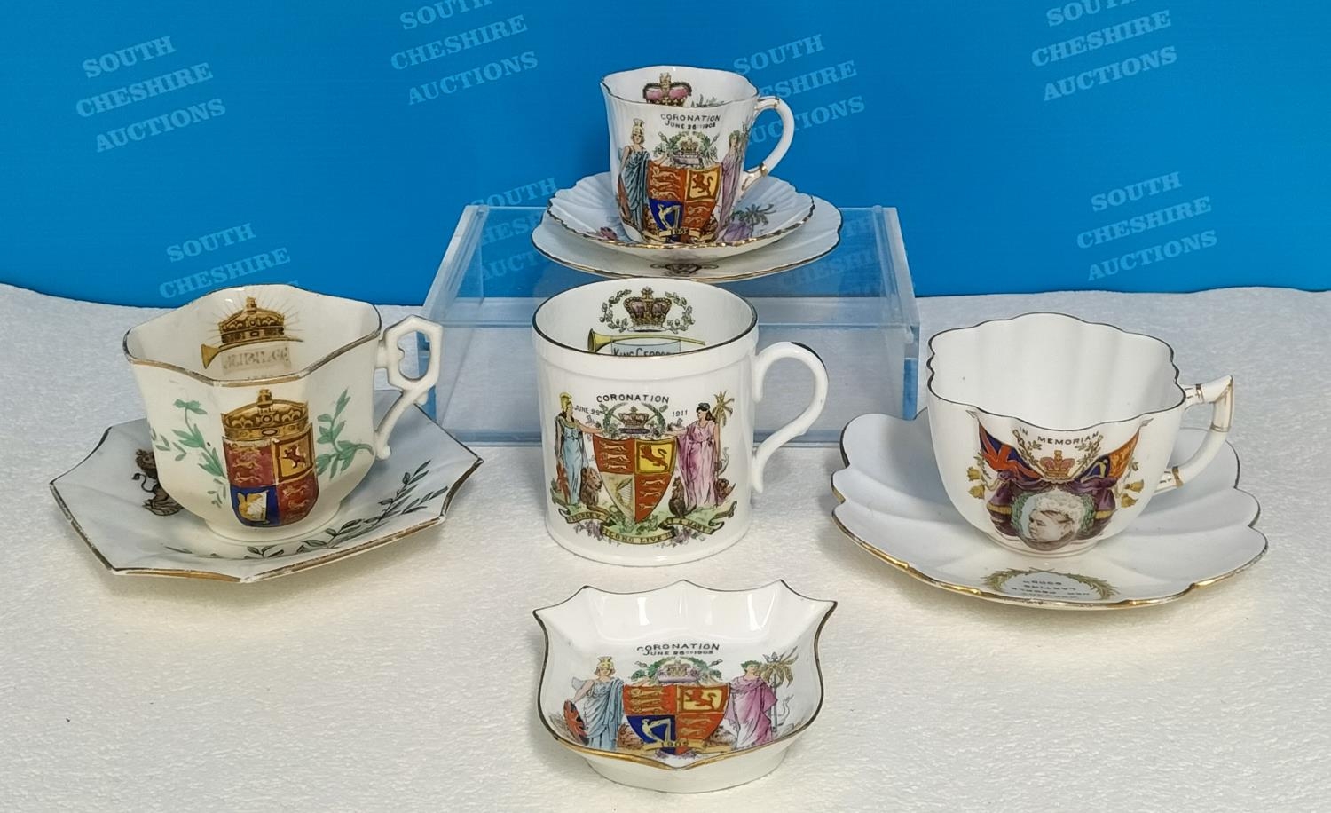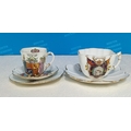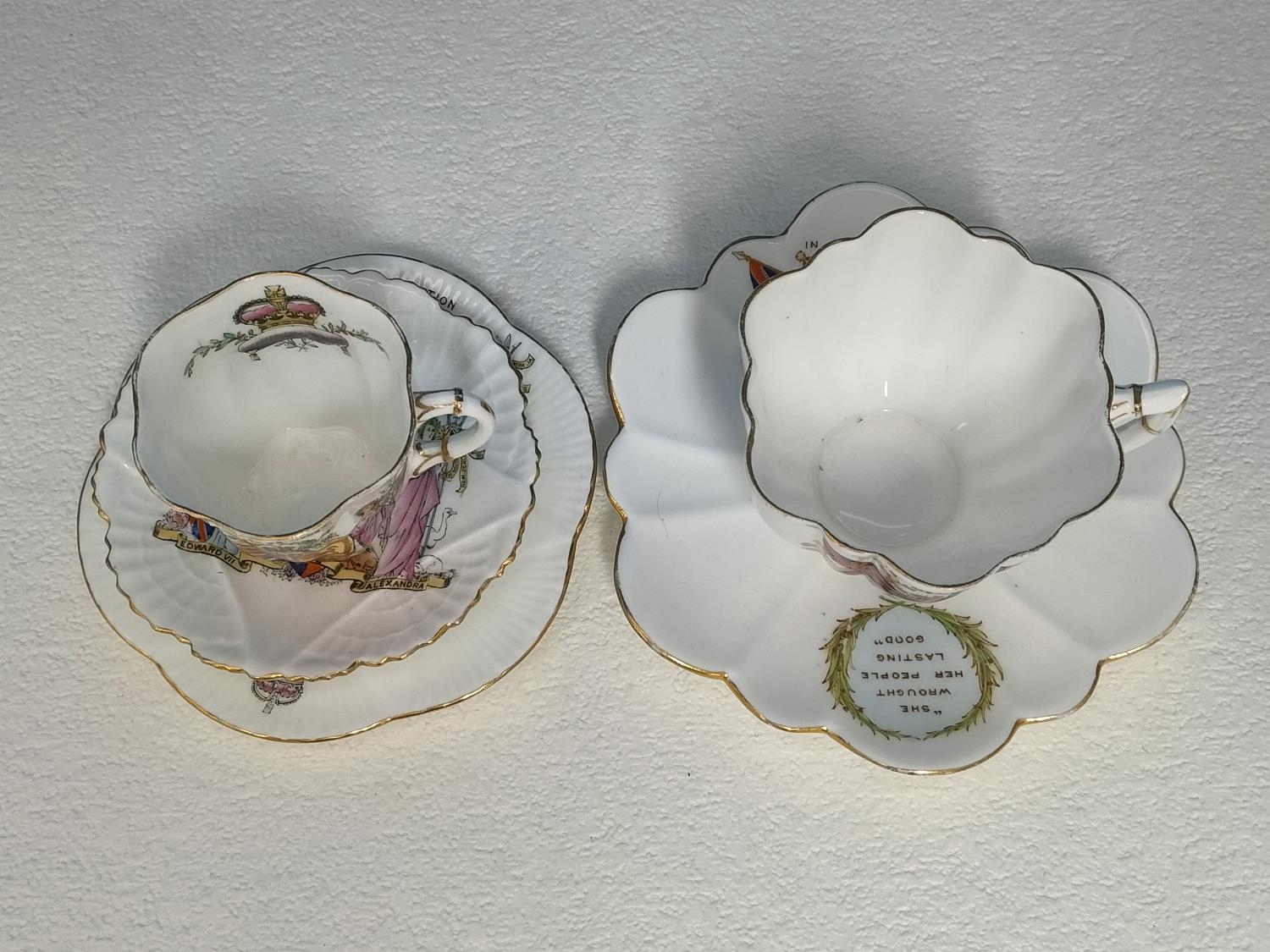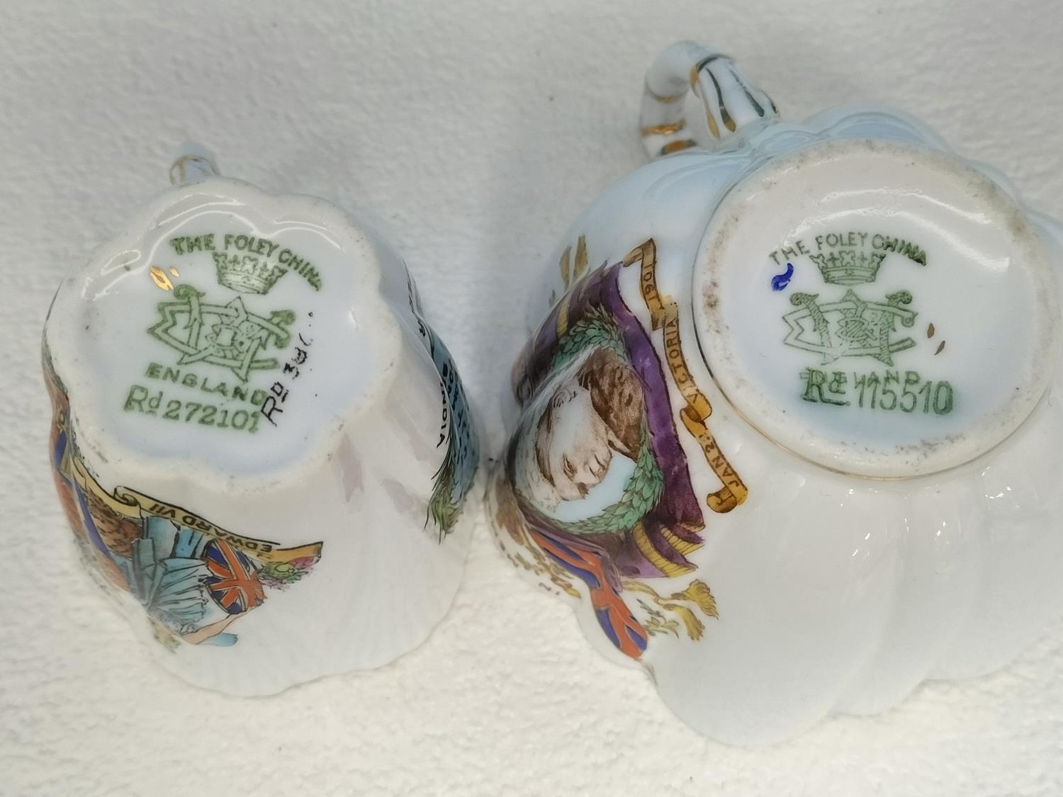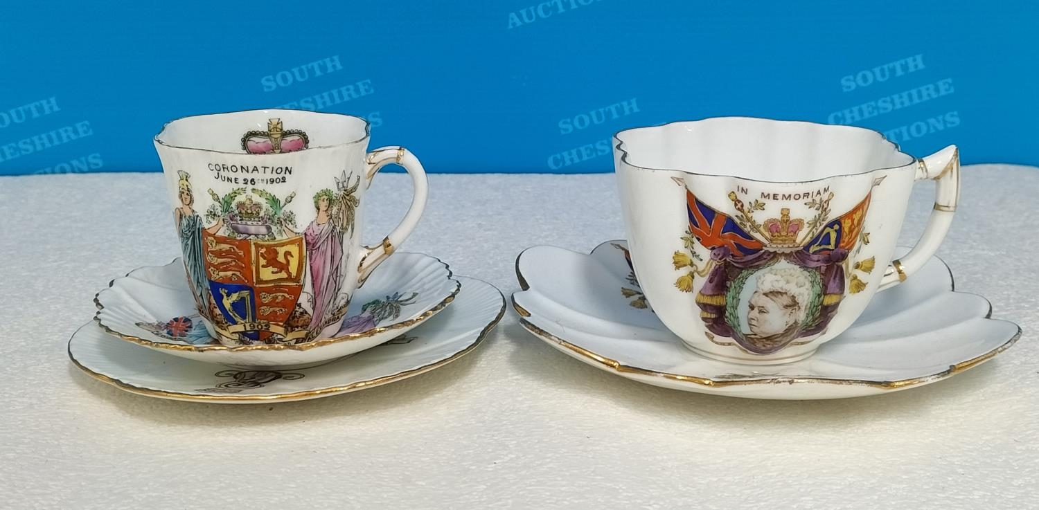 Collection of Wileman & Co Foley China Commemorative Ware to include The Death of Queen Victoria 1901 Cup and Saucer, Queen Anne Shaped Cup and Saucer for Queen Victoria's Golden Jubilee 1837-1887, Coronation of Edward V11 1902 Demitasse Trio, Coronation of George V 1911 Coffee Can and Coronation of Edward V11 1902 Pin Dish.