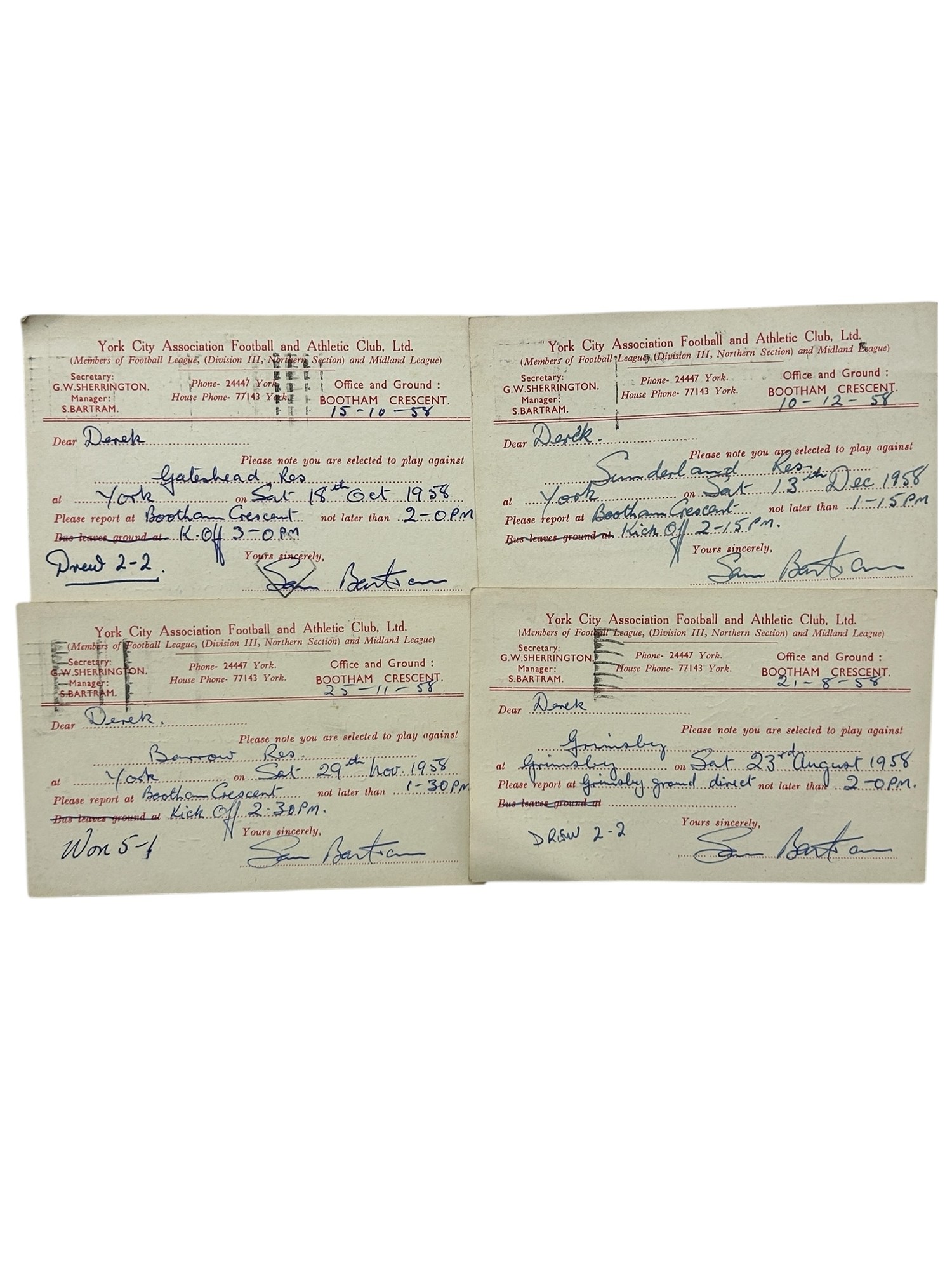 X4 YORK CITY 1958/59 PLAYER CALL UP POST CARDS, ADDRESSED TO PLAYER DEREK CHAMBERLAIN, 3 RESERVES FIXTURES + 1 FIRST TEAM.