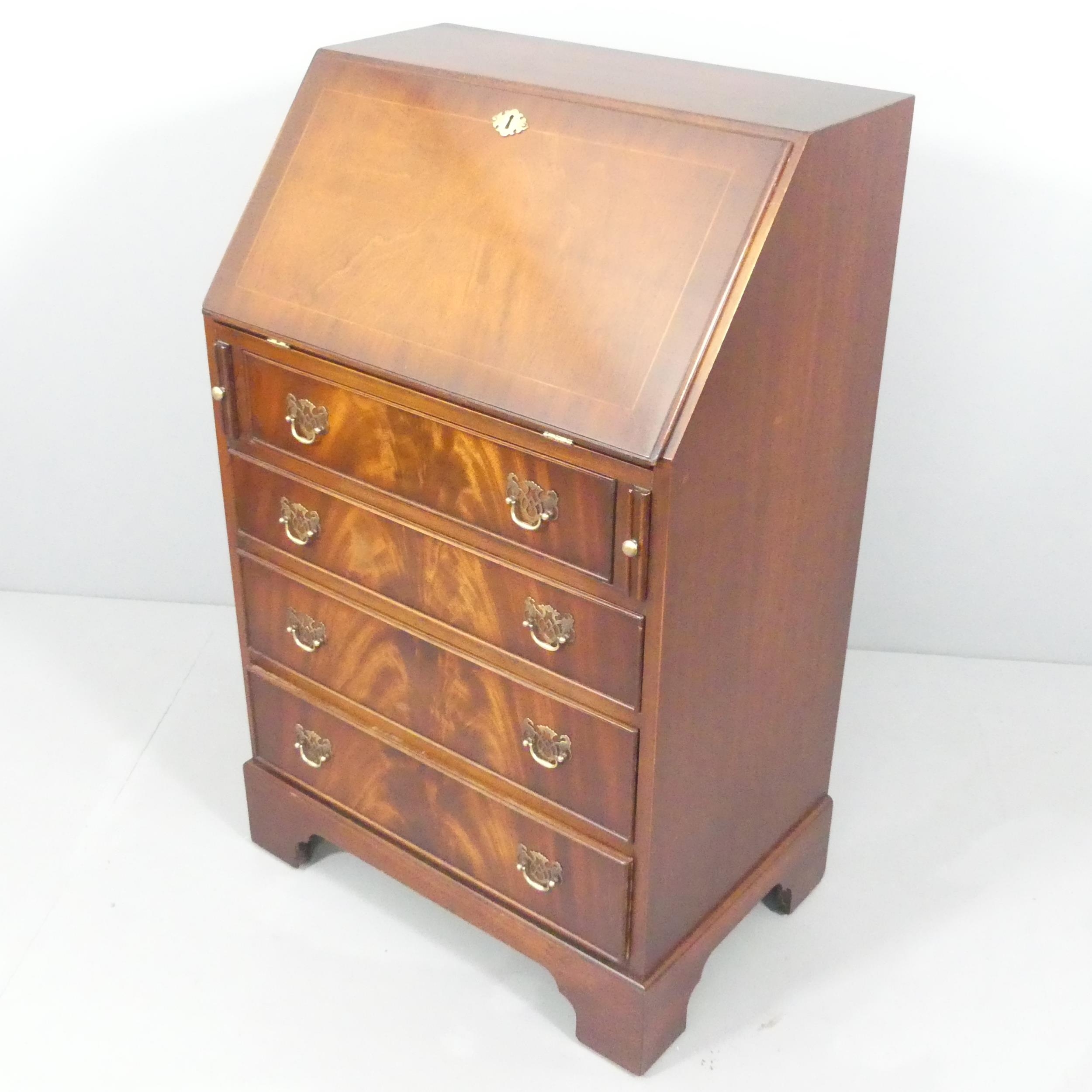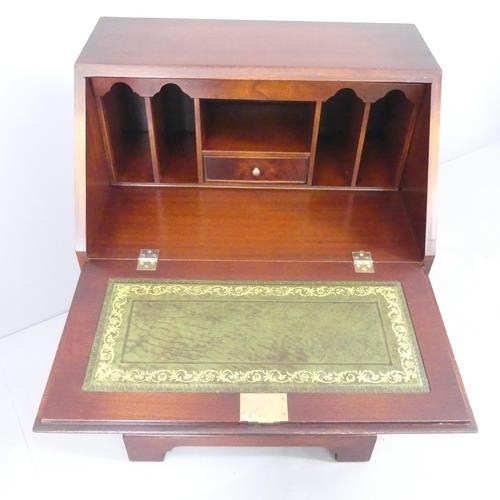 A reproduction mahogany bureau, the fall-front revealing a fitted interior with four drawers below and raised on bracket feet. 62x100x42cm.