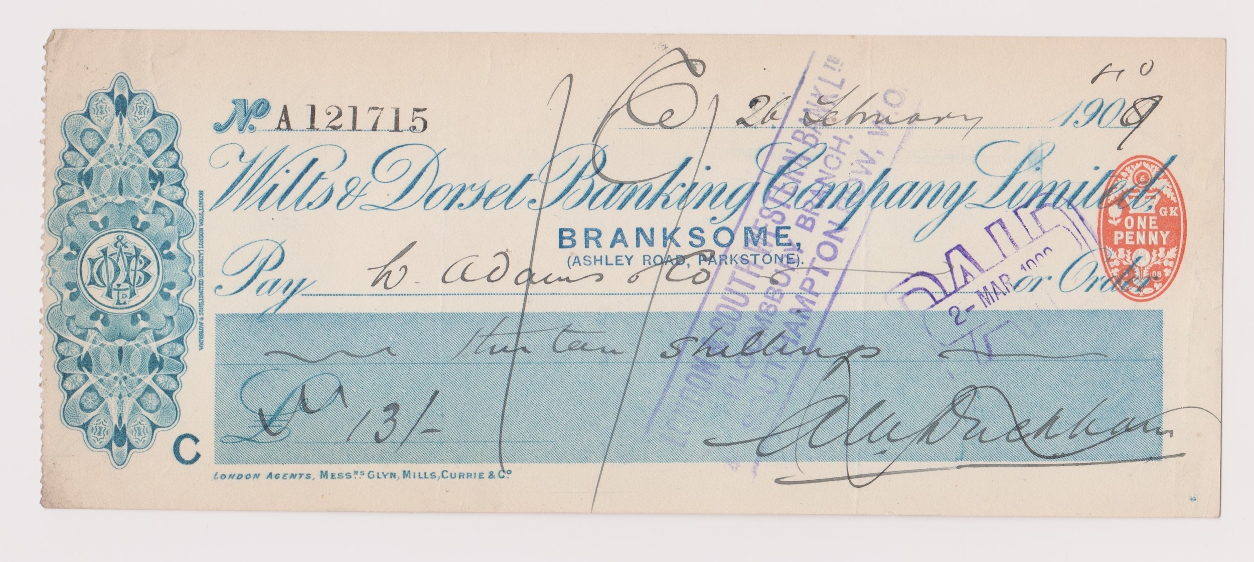 Wilts & Dorset Company Ltd, Branksome. Paid, order RO 06.8.08, green on white. Printer: Waterlow & Sons