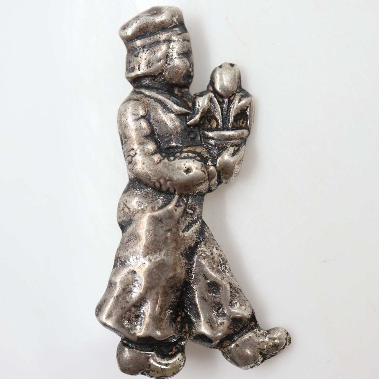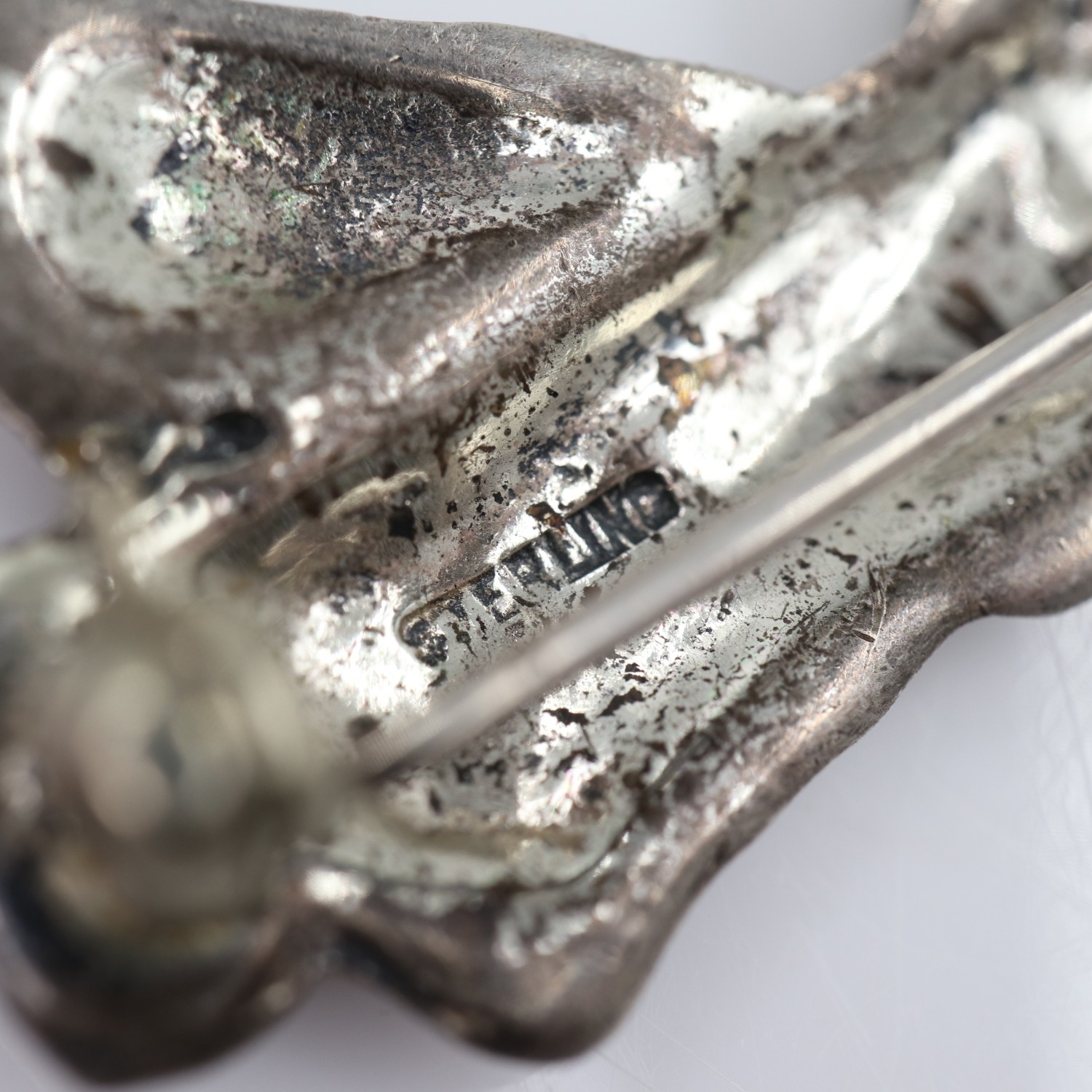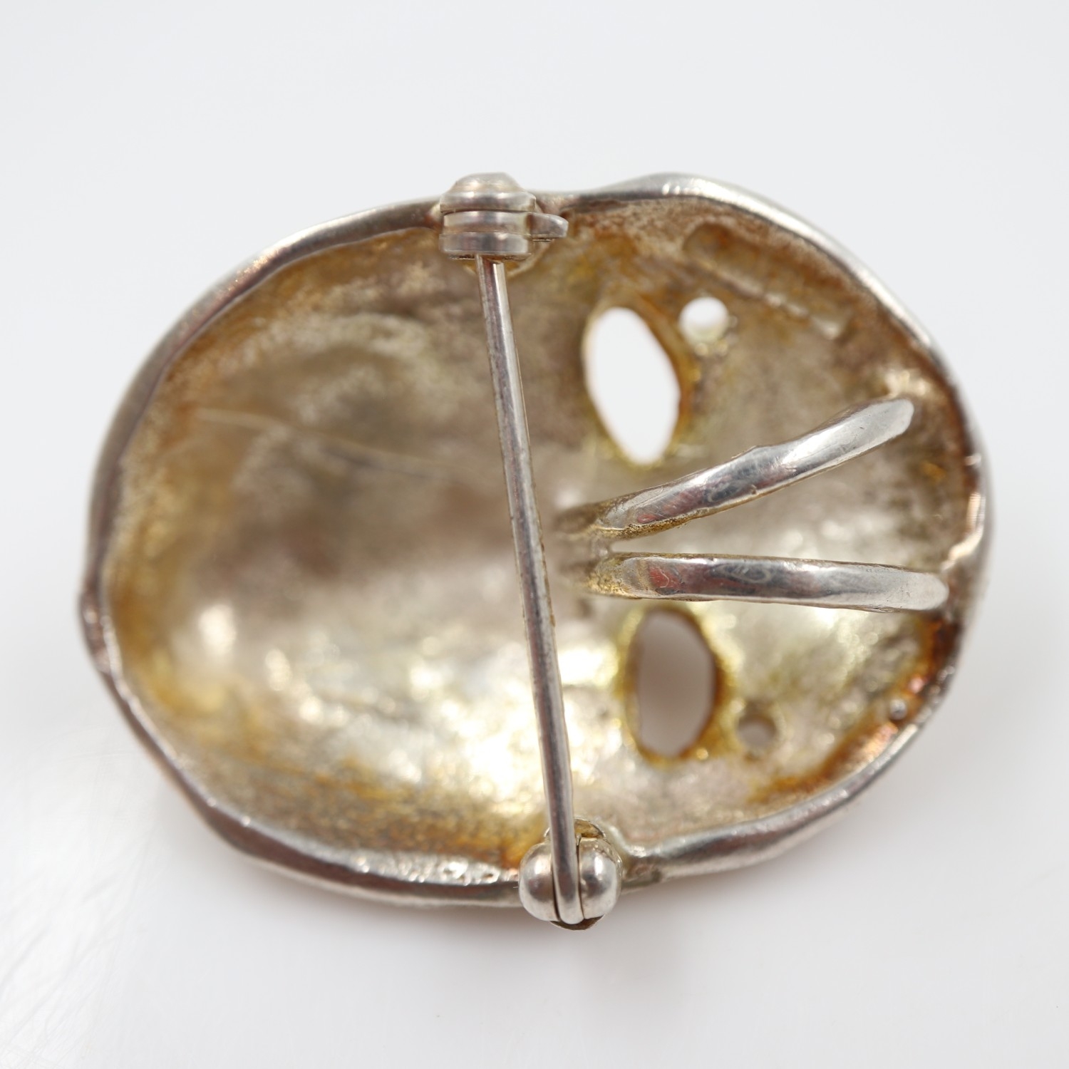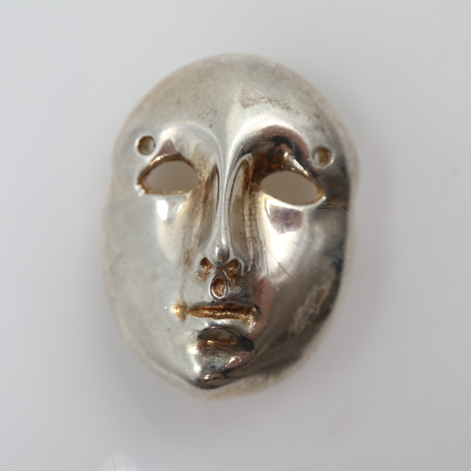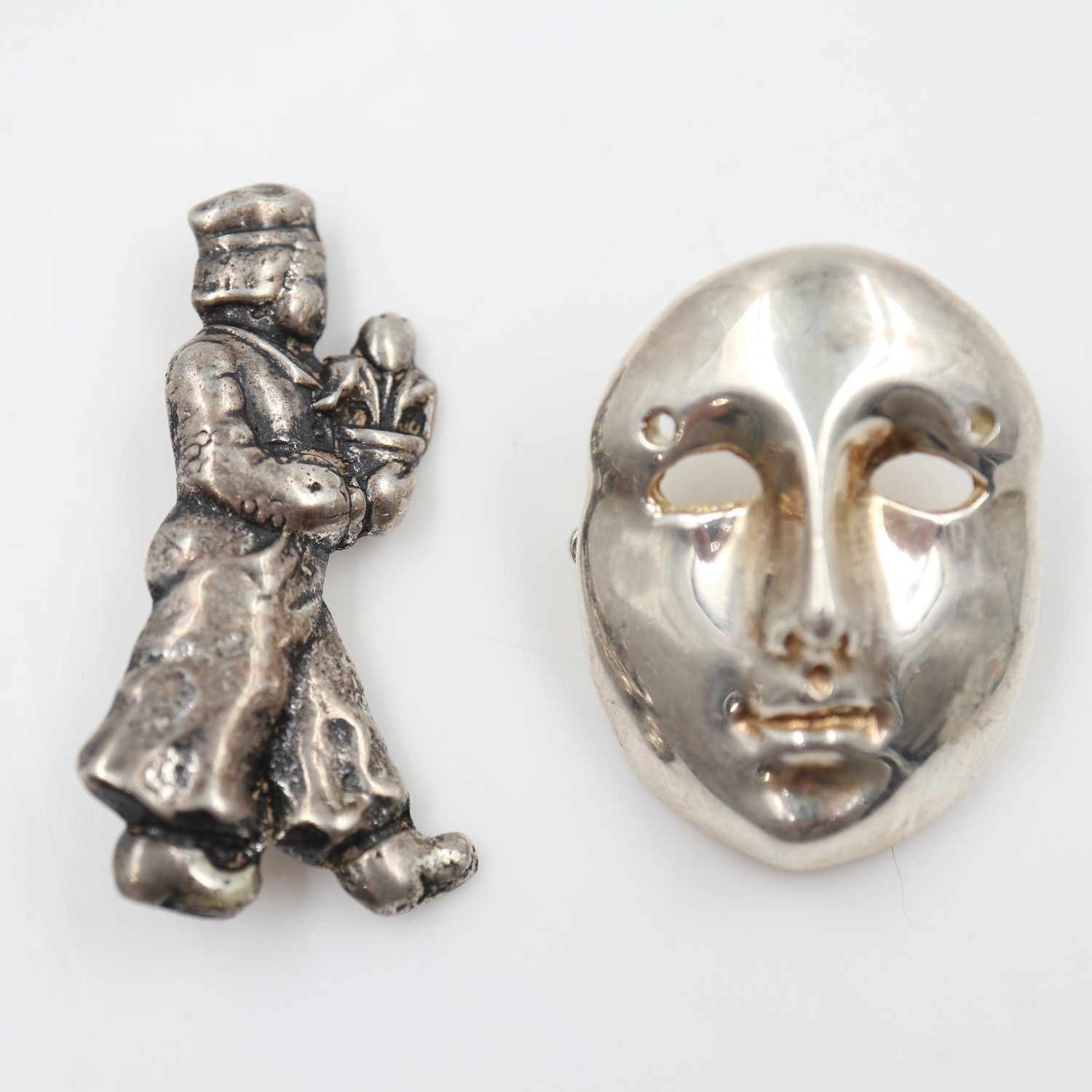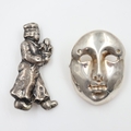 Two silver brooches, one of mask form with pendant suspension loop. UK P&P Group 1 (£18+VAT for the first lot and £2+VAT for subsequent lots)