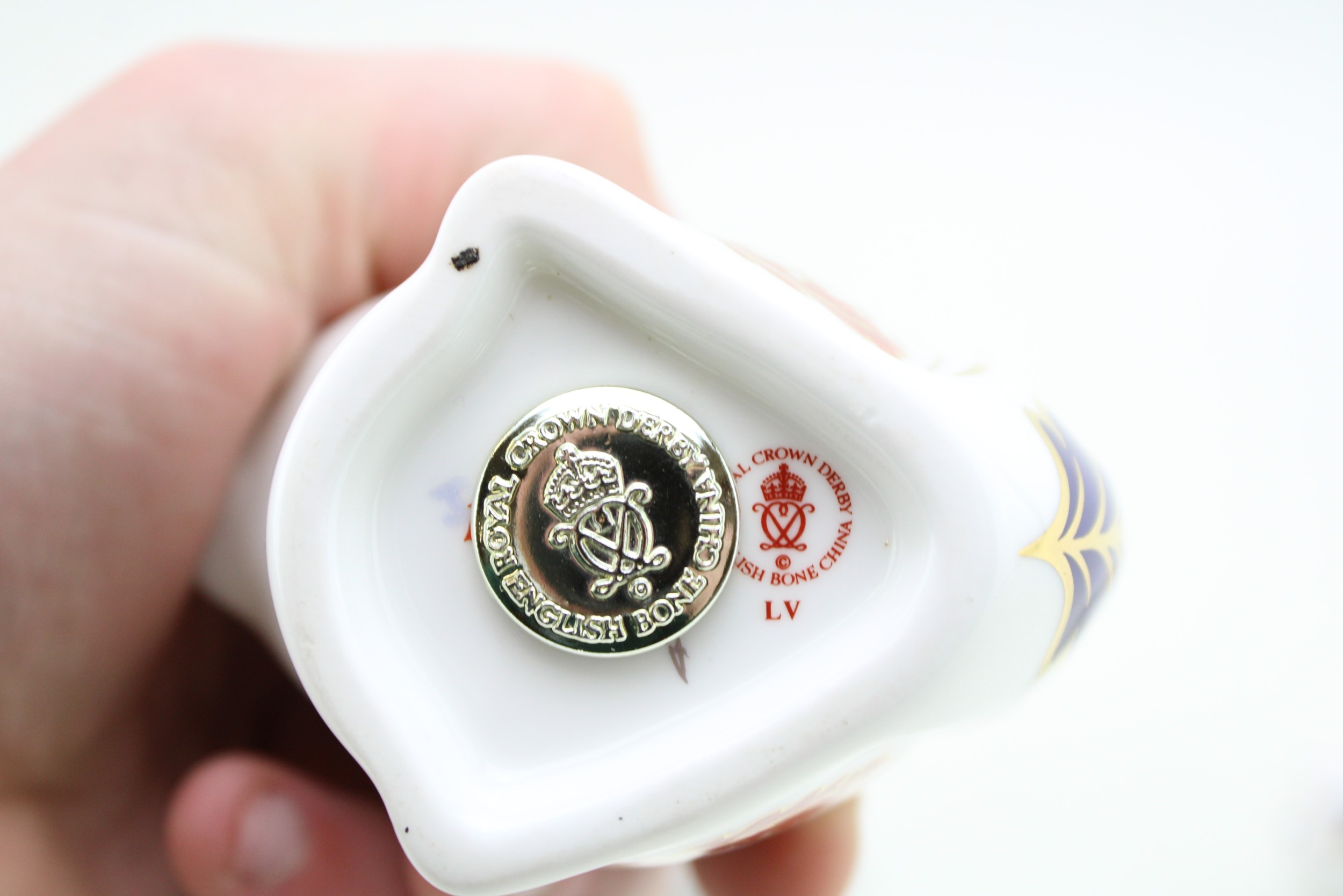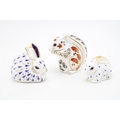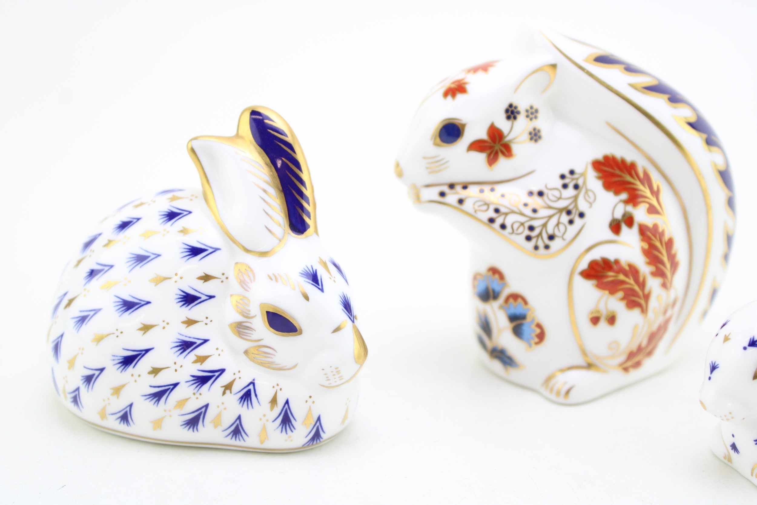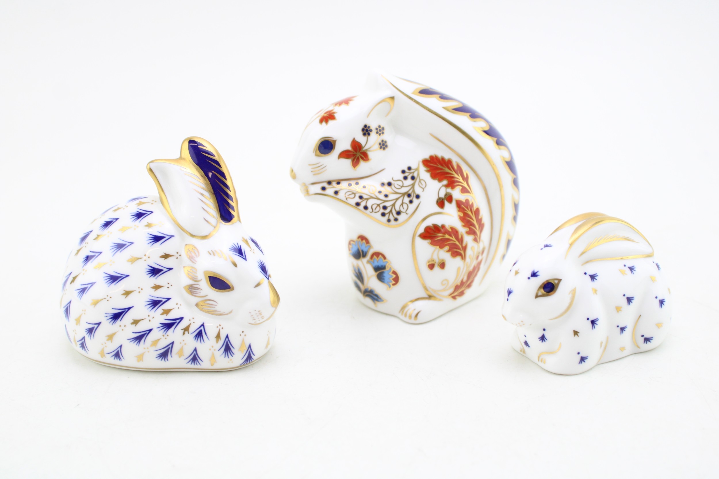 A Royal Crown Derby paperweight, Squirrel, date mark for 1992 (LV), red Royal Crown Derby stamp on the base, gold stopper; together with a further two Royal Crown Derby paperweights, Rabbit, one of the original six paperweights first introduced at the Chatsworth House launch in 1981, date code for 1991 (LIV); together with Baby Rabbit, date code for 1992 (LV), gold stoppers and Royal Crown Derby stamp on the base (3).