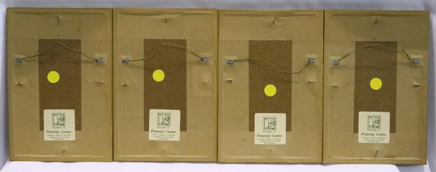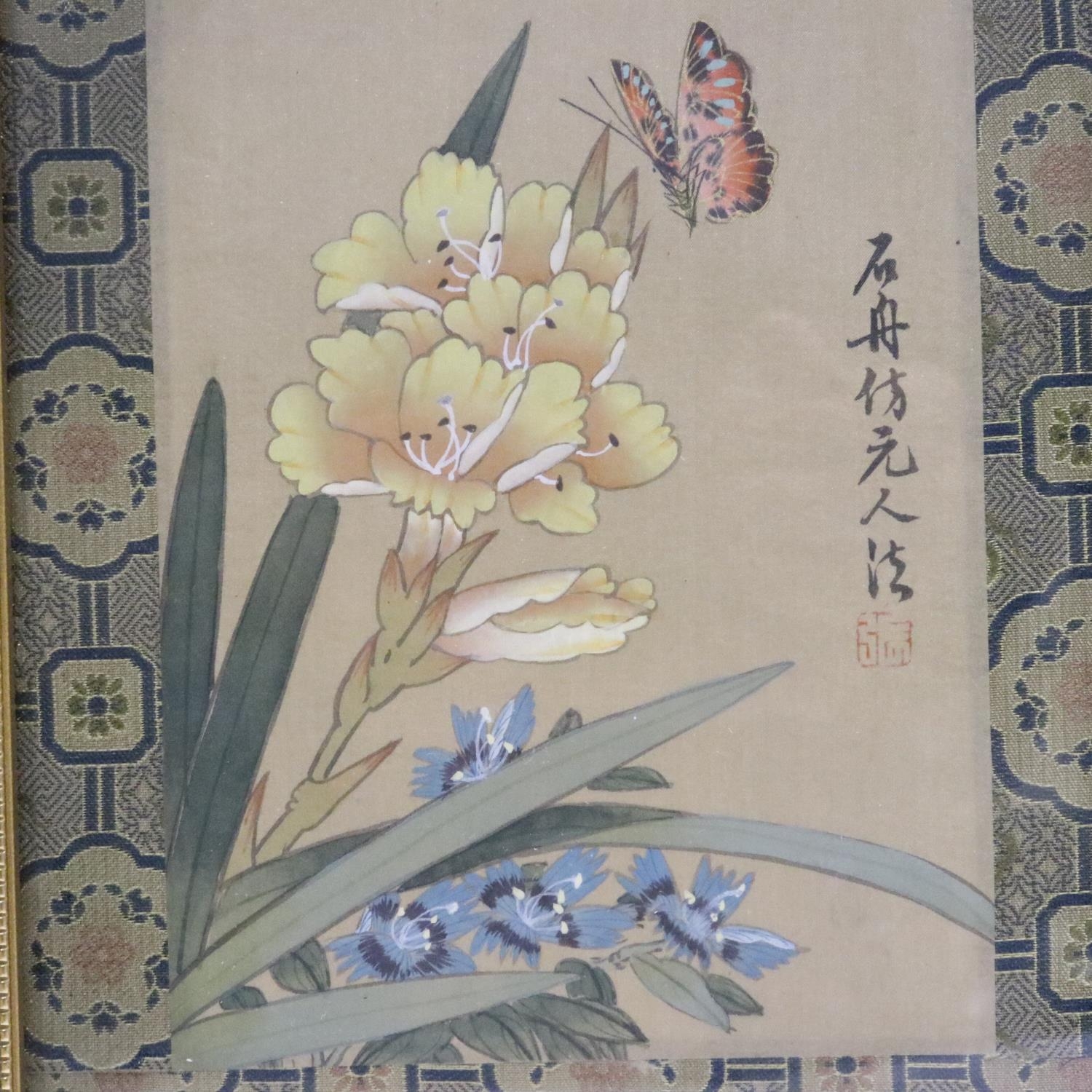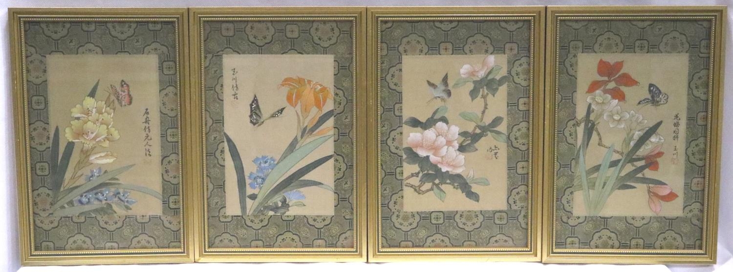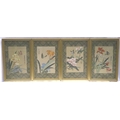 Four framed Oriental watercolours on silk, each 24 x 17 cm. Not available for in-house P&P