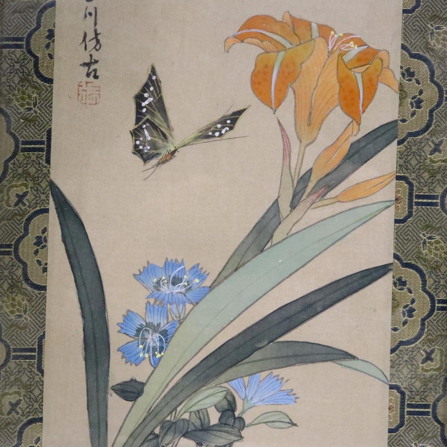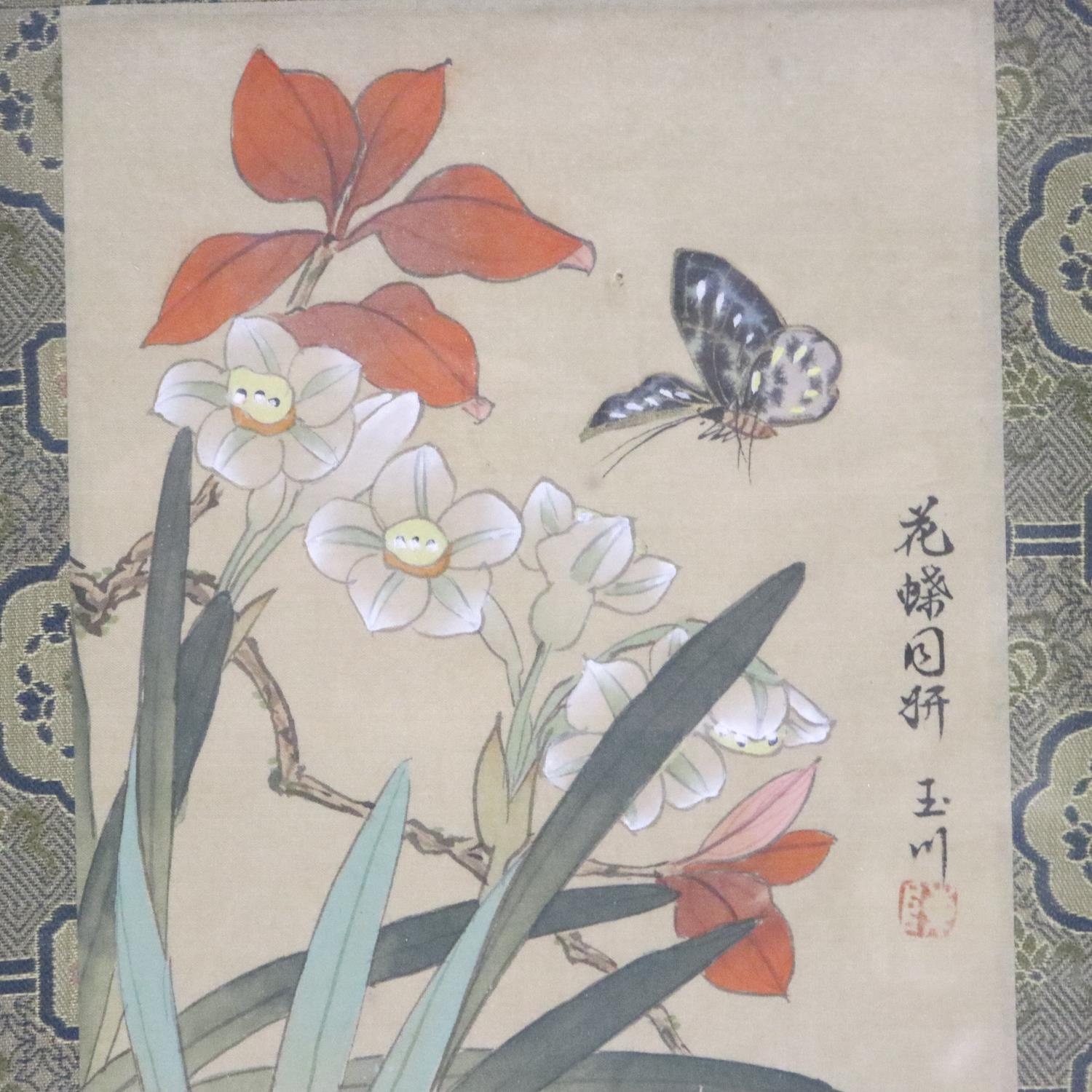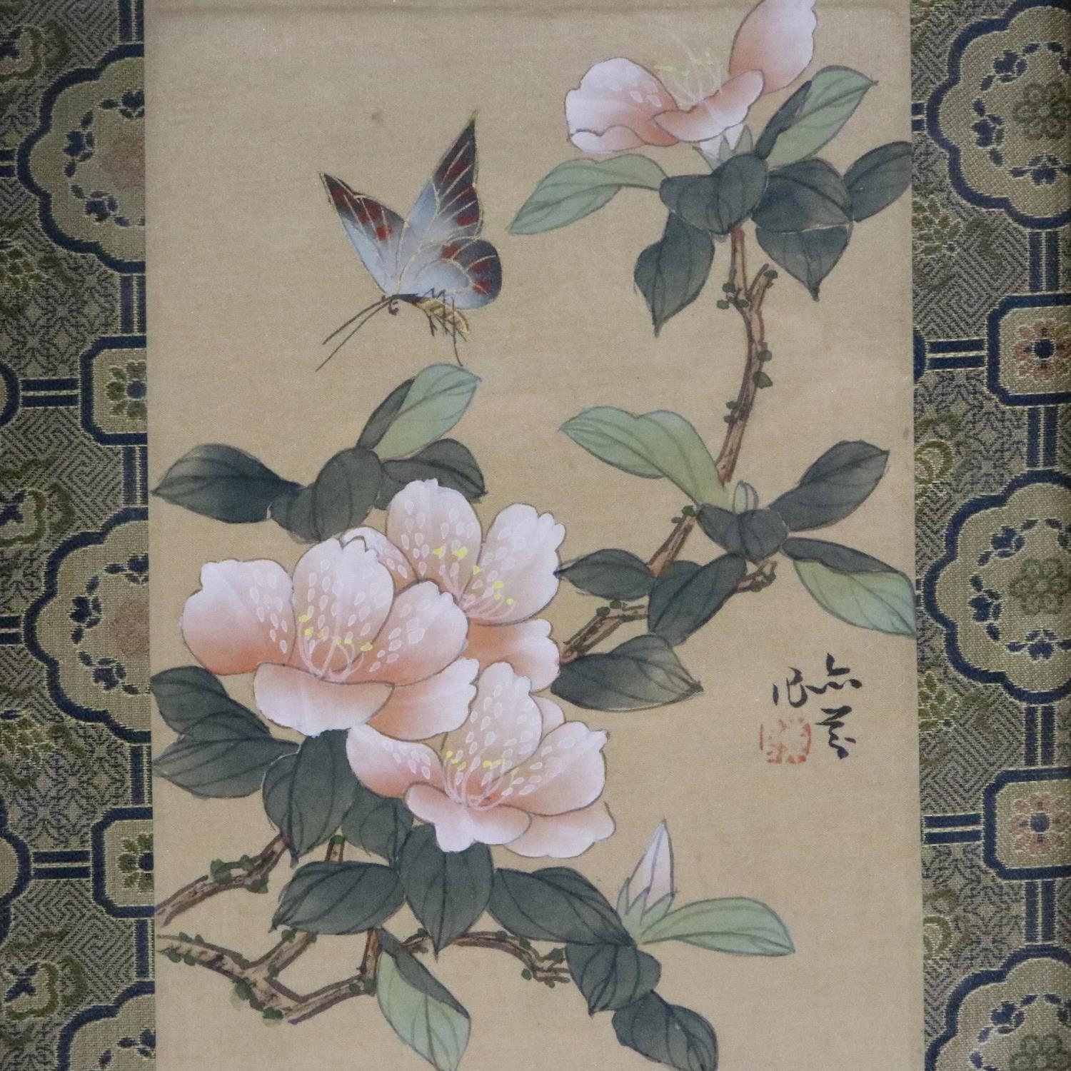 Four framed Oriental watercolours on silk, each 24 x 17 cm. Not available for in-house P&P