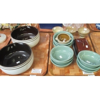 Two trays of mixed items to include: Italian, Chinese decorated, pottery vase, pair of china basket ware pedestal bowls, and a selection of glassware to include paperweights, ashtrays, and two studio glass pigs, Murano style, in clear and mottled glass. (2)
