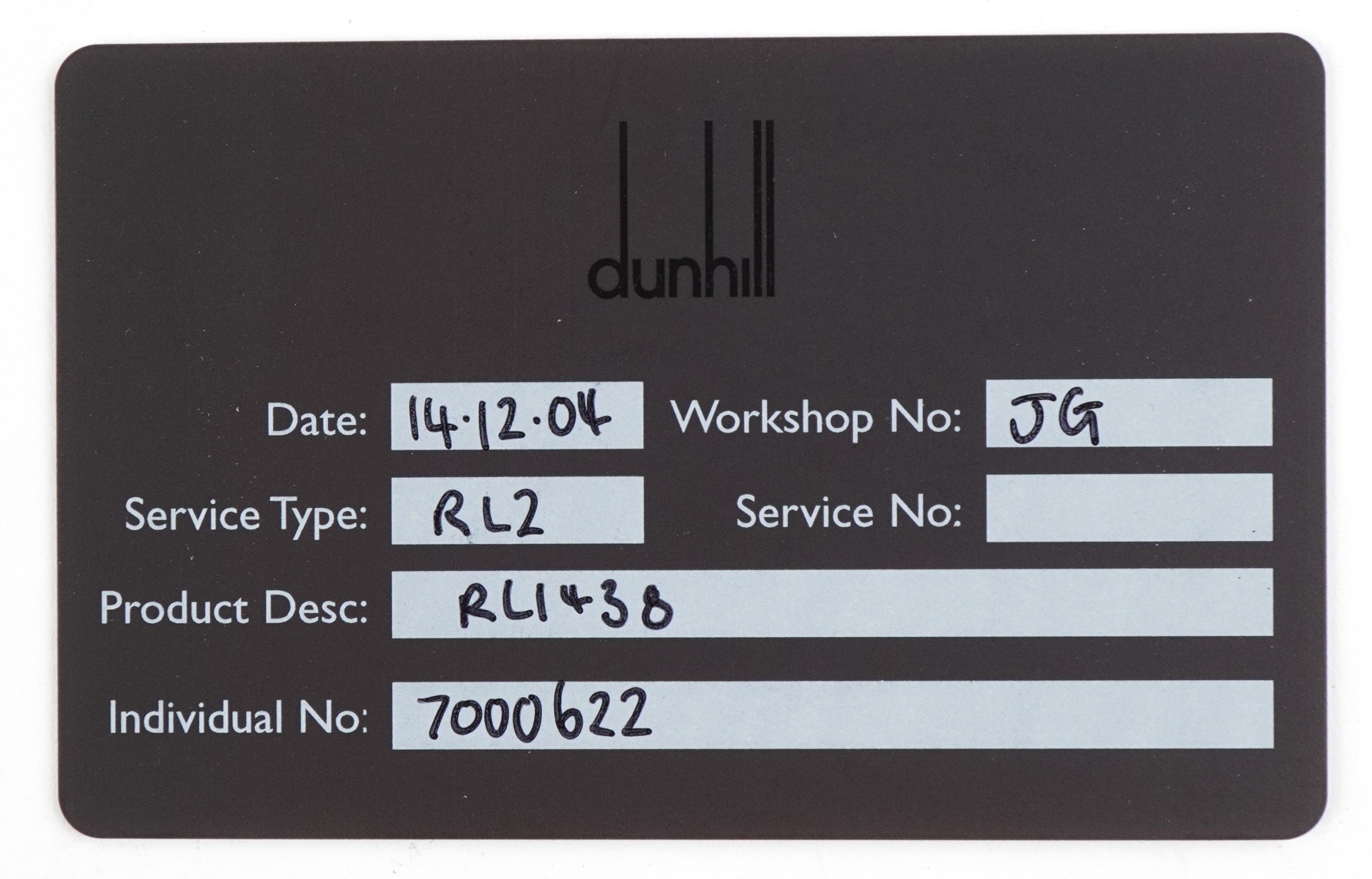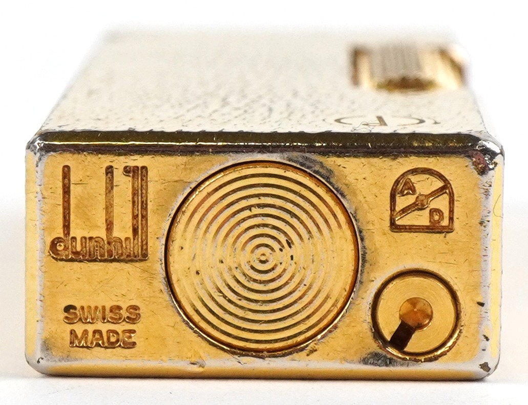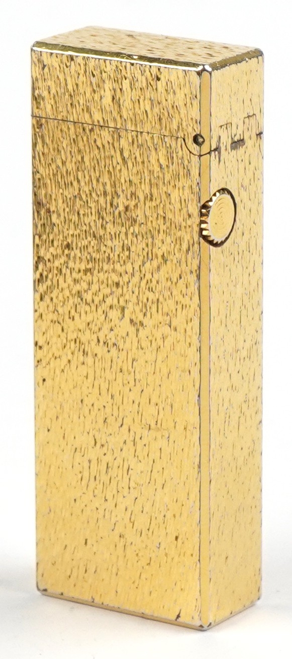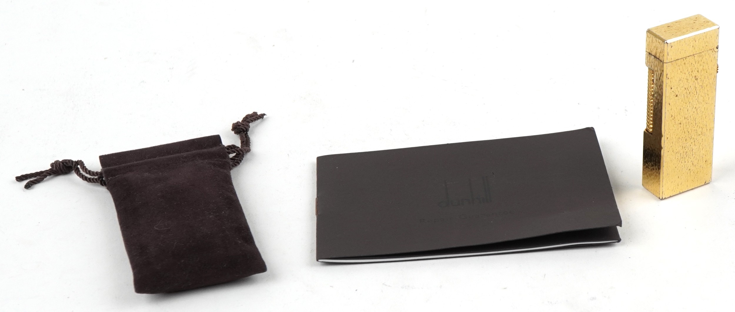 A Dunhill gold plated engine turned pocket lighter with guarantee card, 6.5cm high.