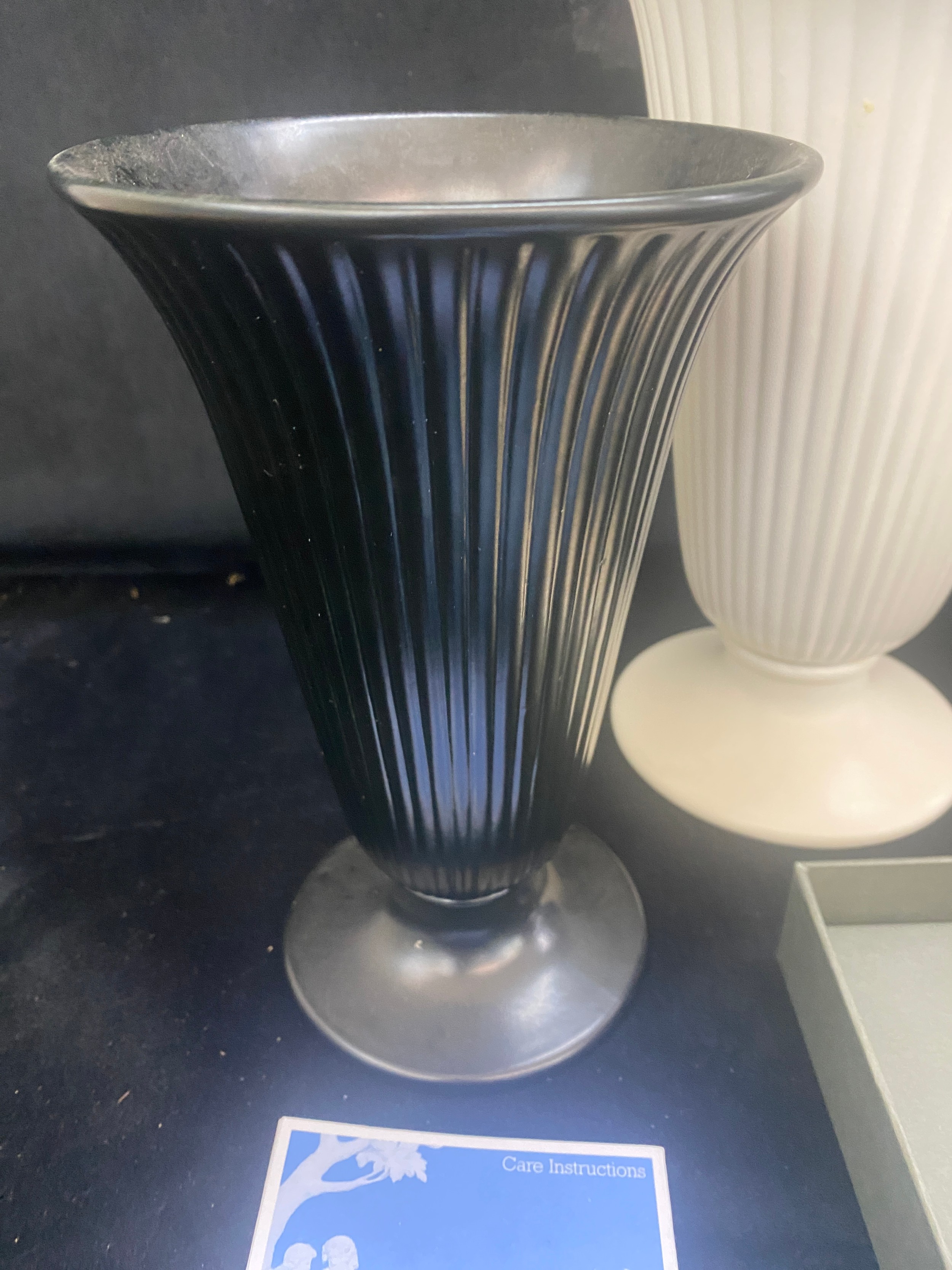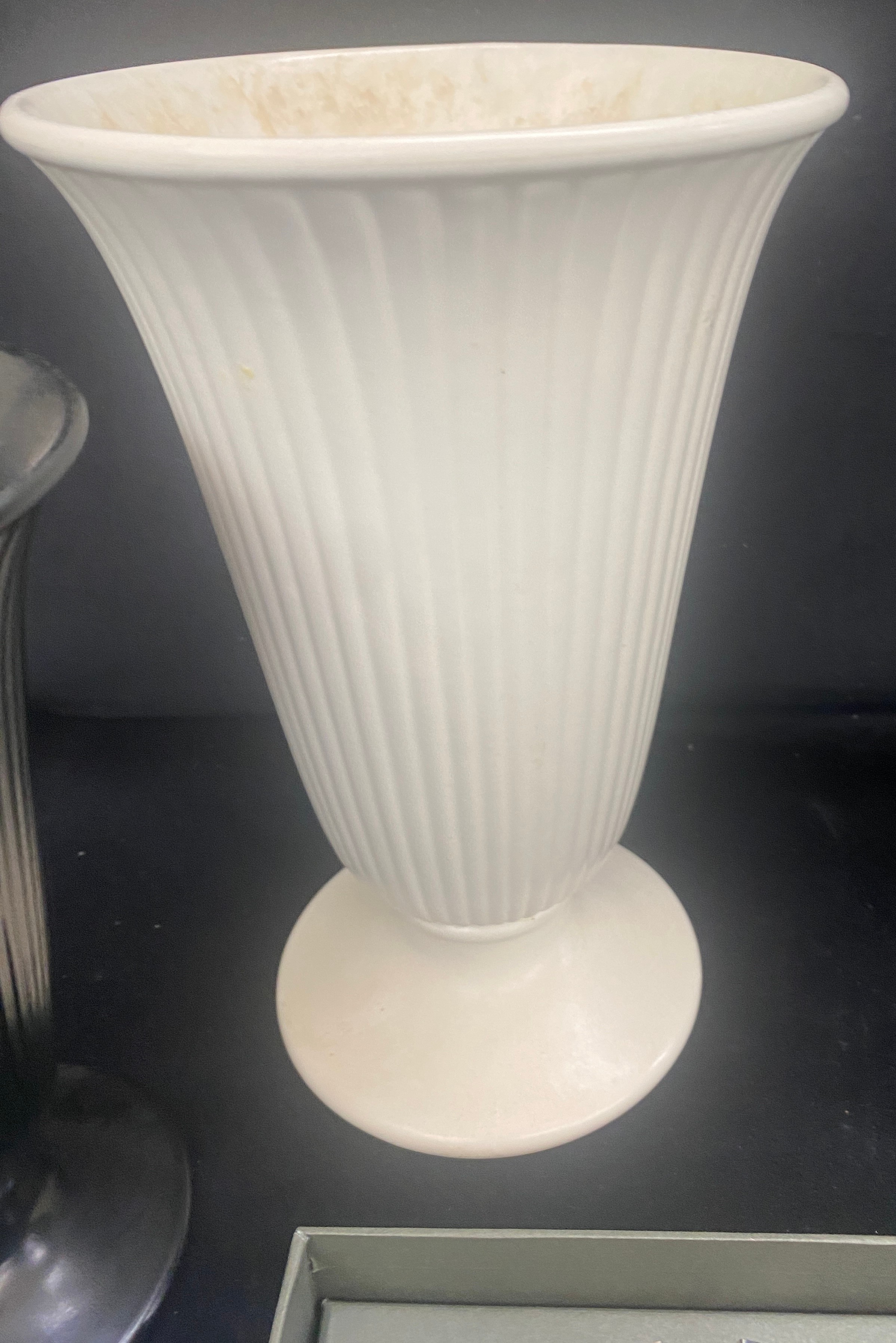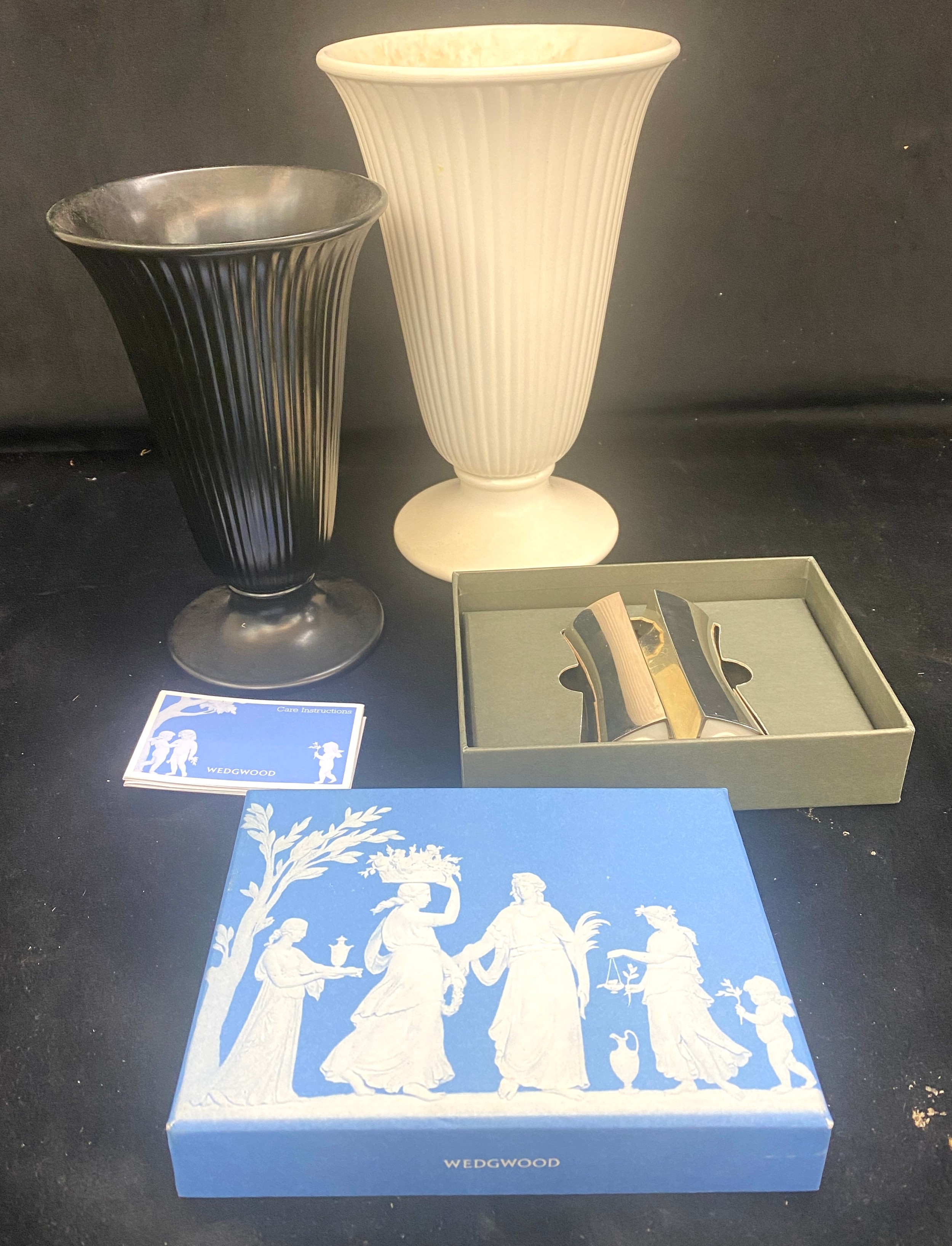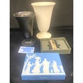 Three pieces of Wedgwood includes salt and pepper, vases etc