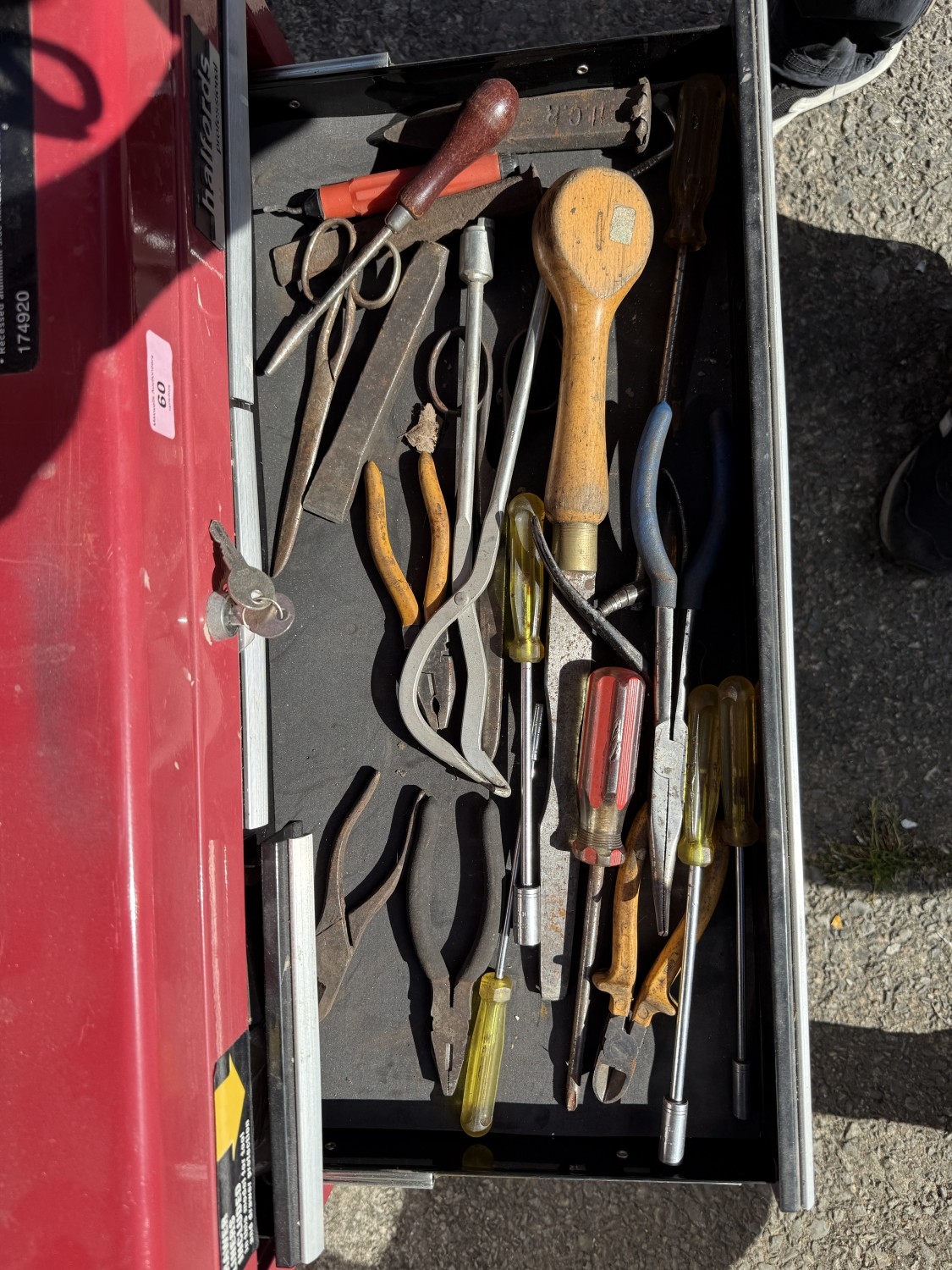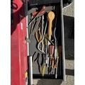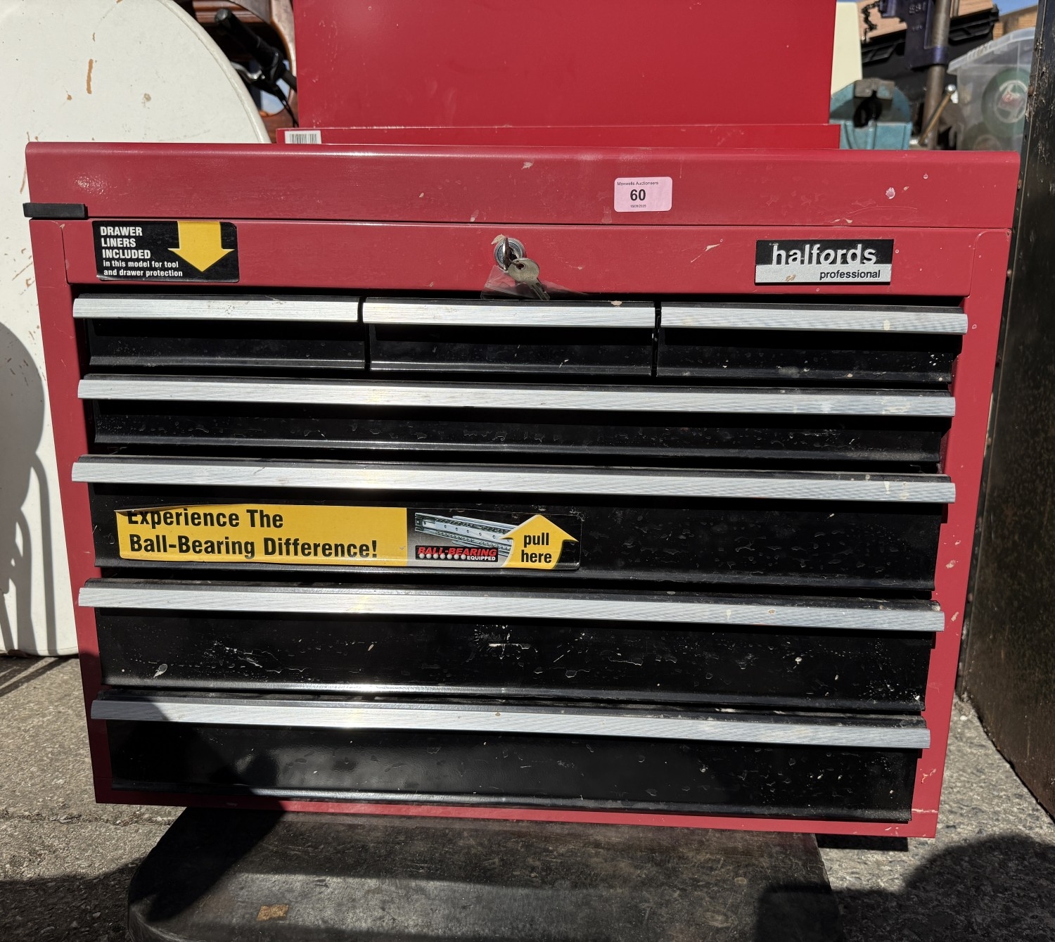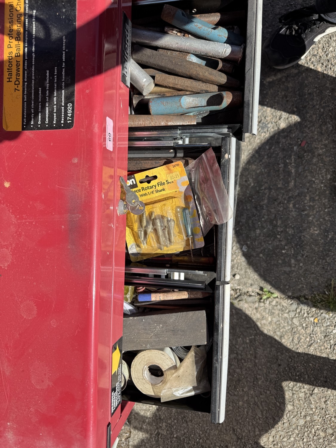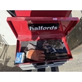 A Halfords professional multi-drawer tool storage case with tools and other tool boxes.