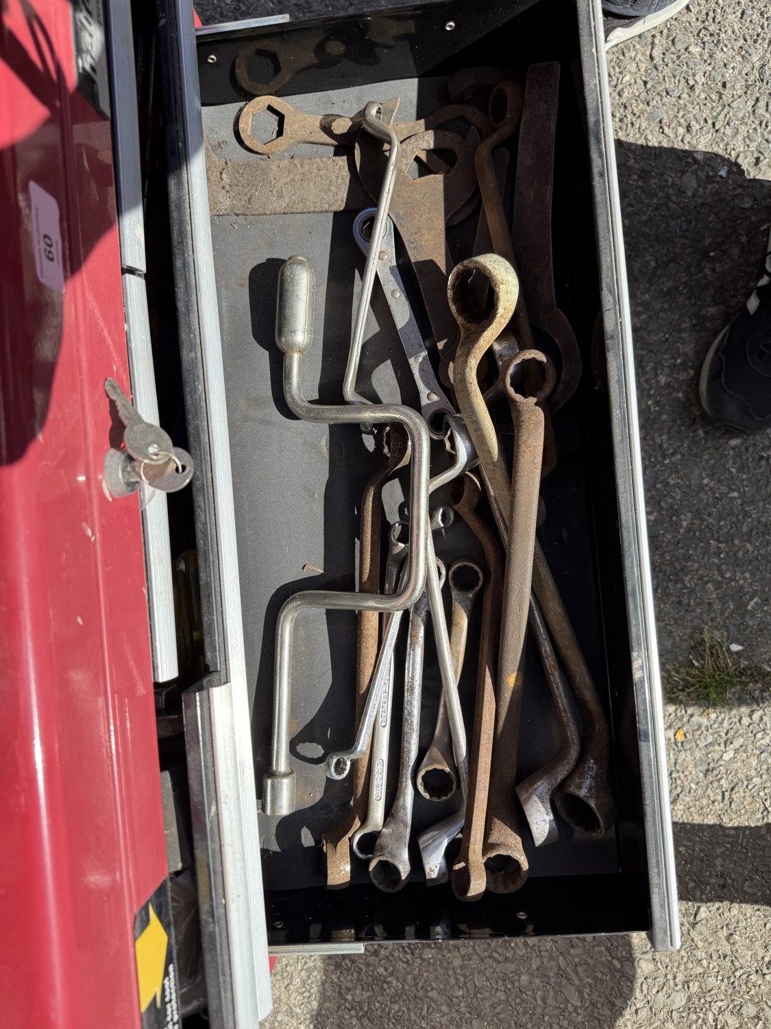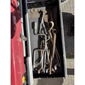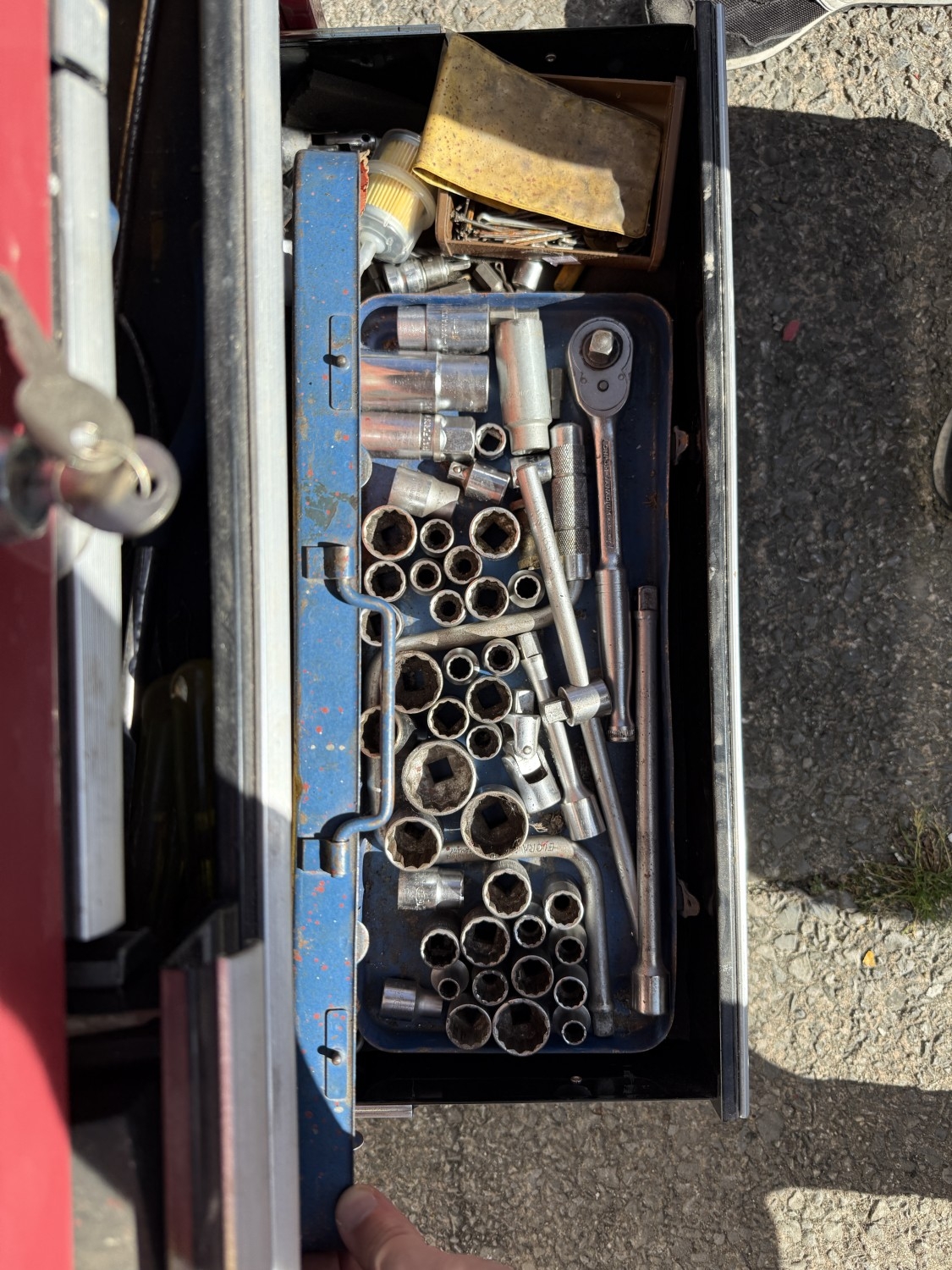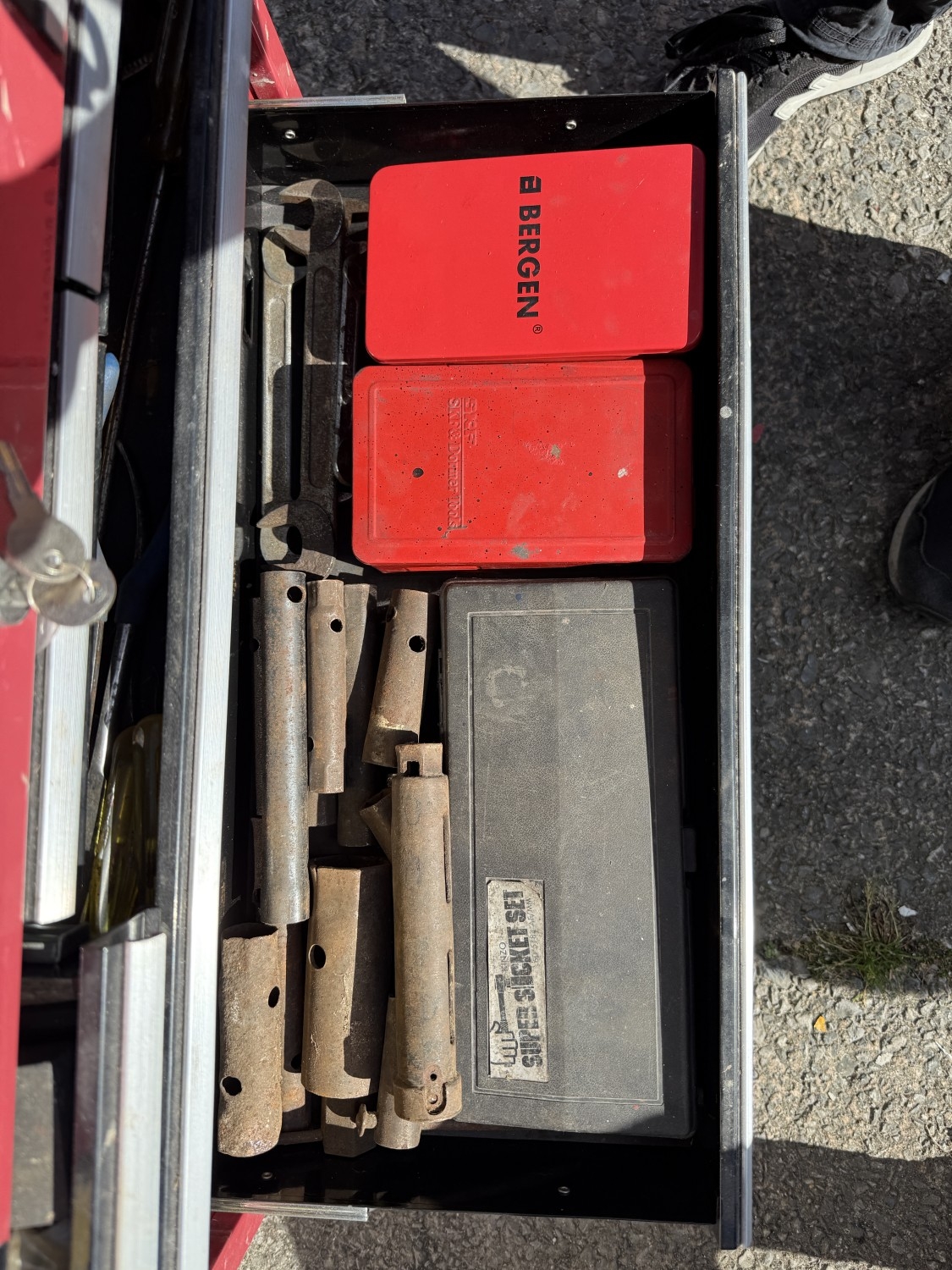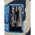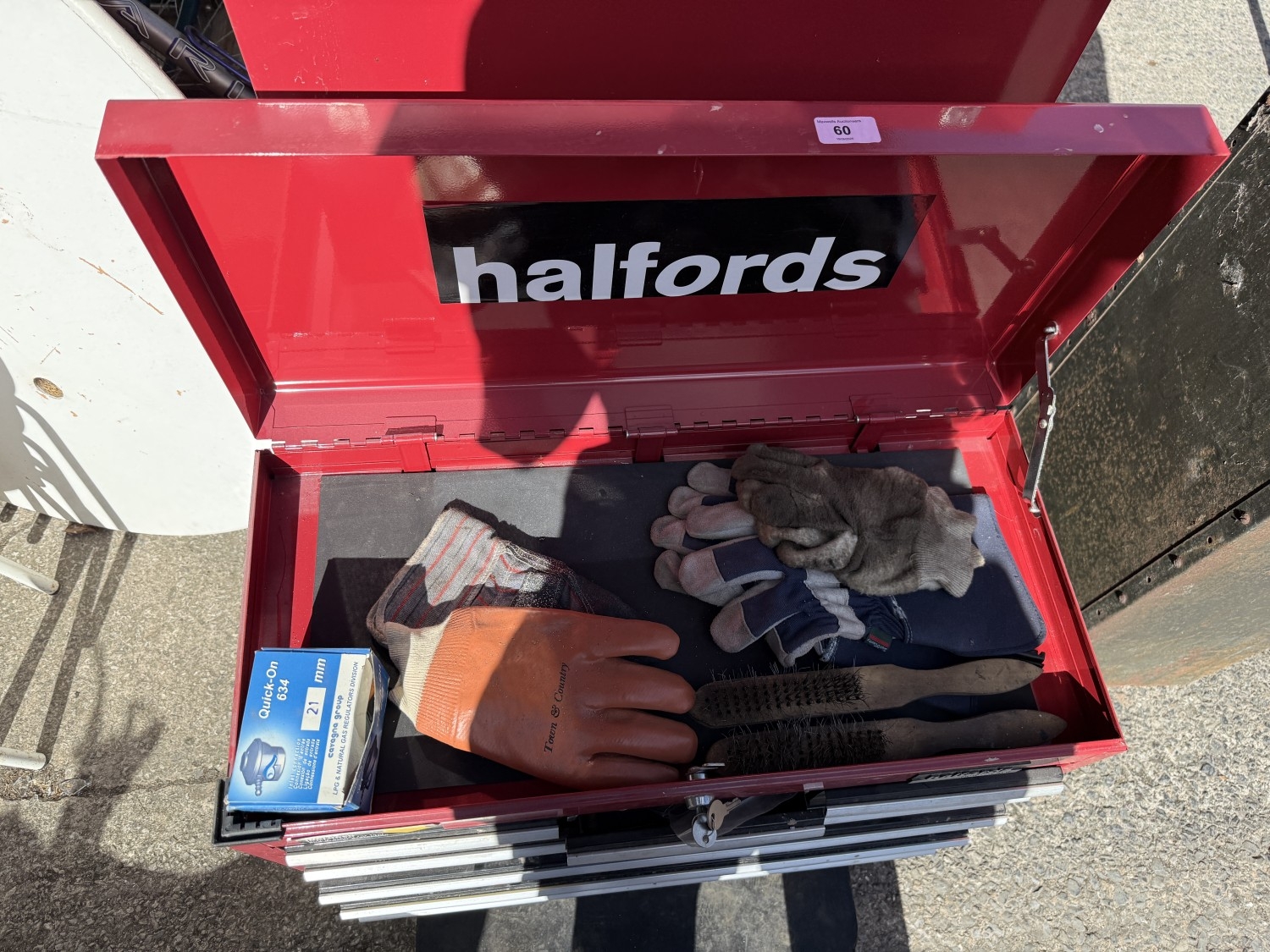 A Halfords professional multi-drawer tool storage case with tools and other tool boxes.