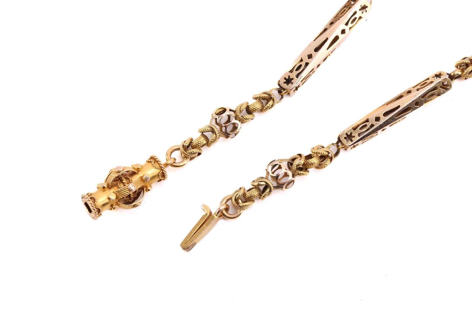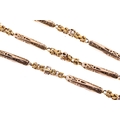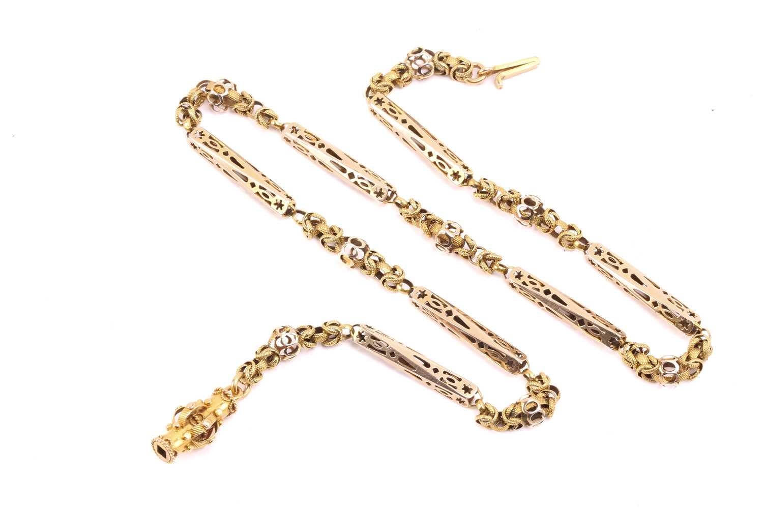 A 19th-century fancy link chain, consisting of pierced bar links flanking textured woven links, to a barrel clasp decorated with applied cablework, bar links testing 14ct, woven segments testing 18ct, overall length 40.0 cm, total weight of item 12.8 grams. showing alterations to a Gerogian fancy link chain by adding bar links from a later period.