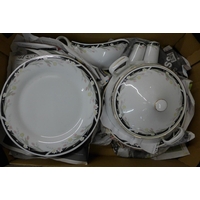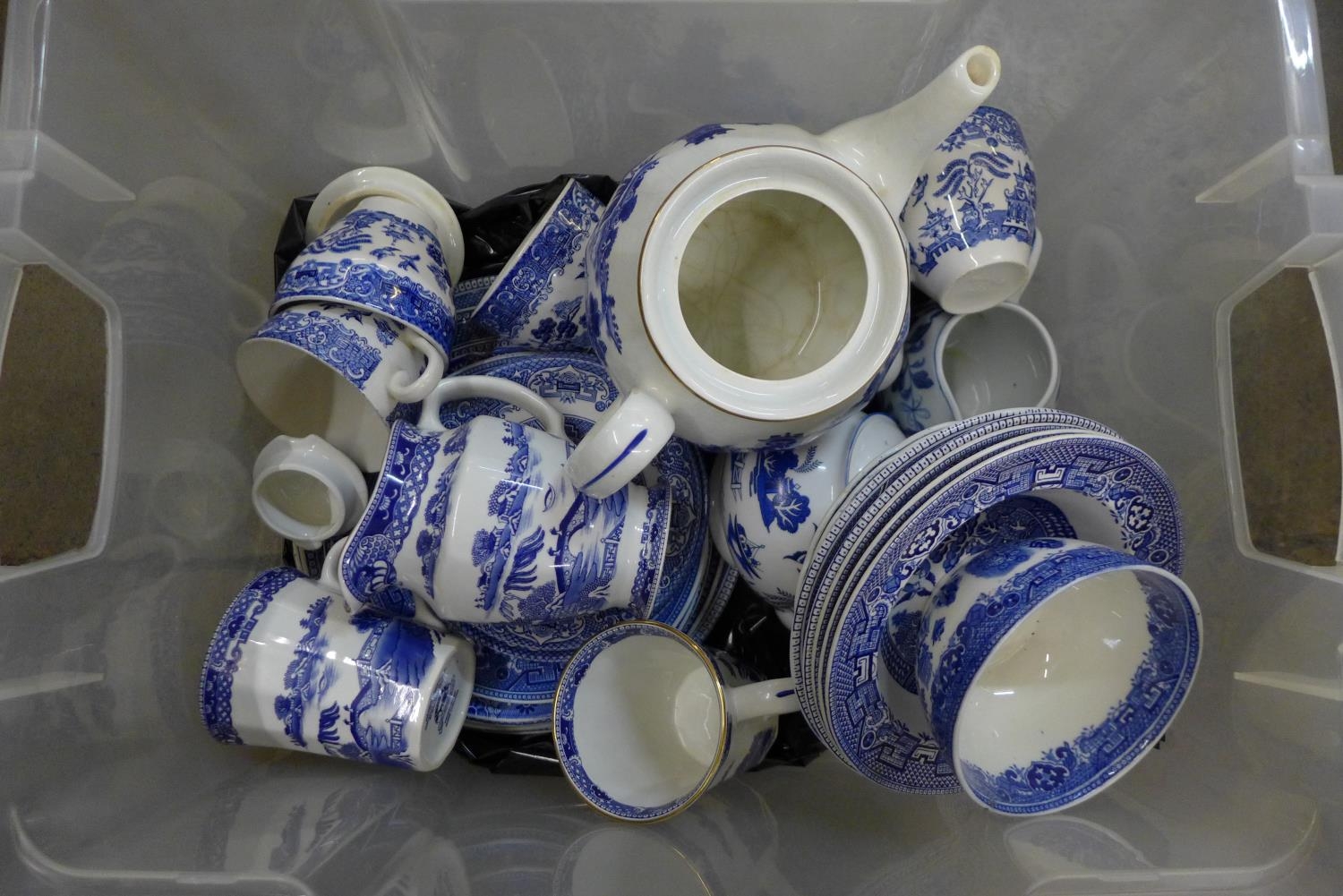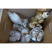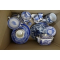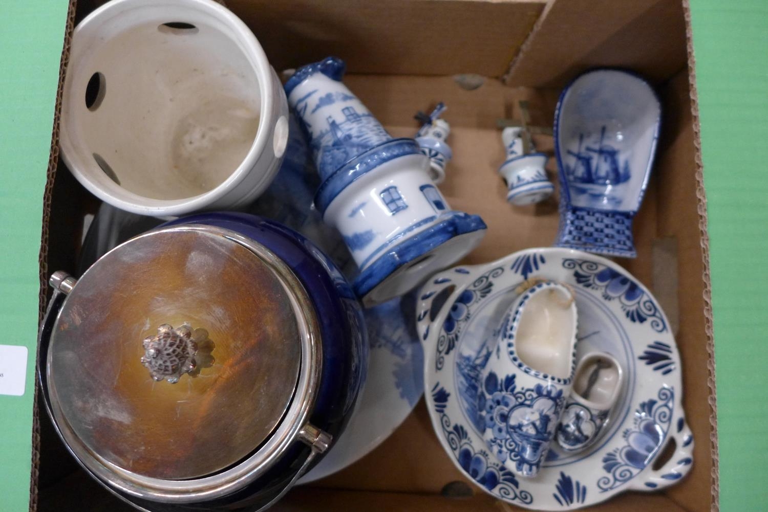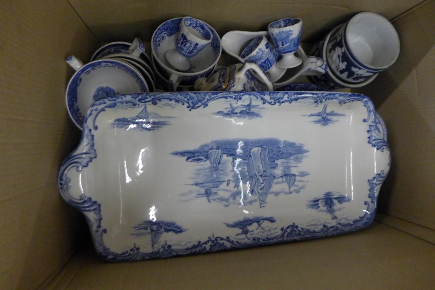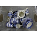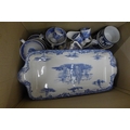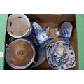Two boxes of blue and white china and a box of Delft china