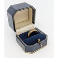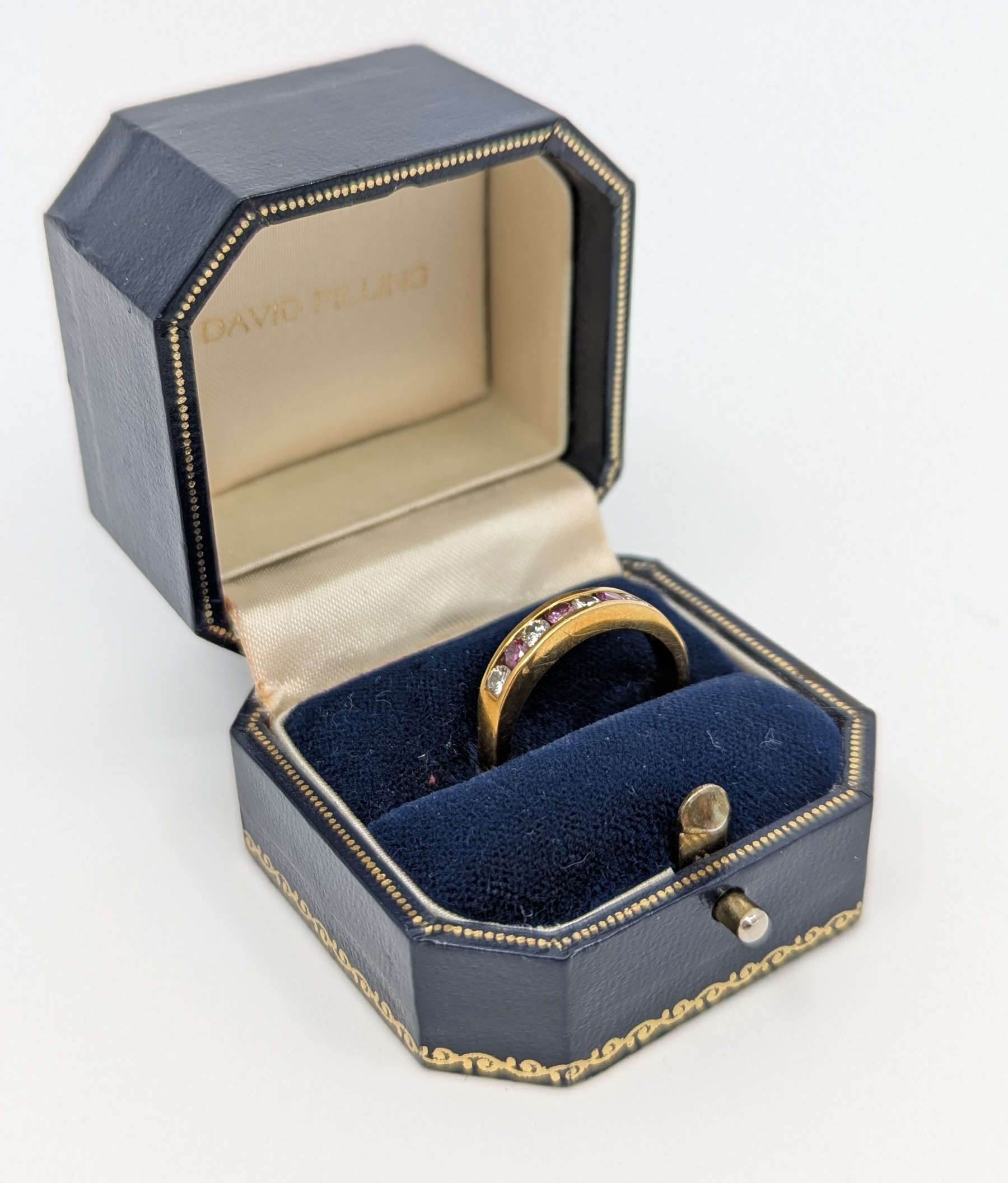 set with three approx. 0.05ct round brilliant cut pink synthetic diamonds and four approx. 0.05ct round brilliant cut white synthetic diamonds, total diamond carat weight approx. 0.35ct, hallmarked "750", size P, approx. 4.2g gross, boxed