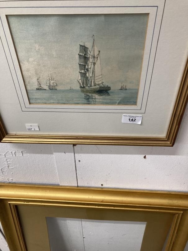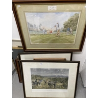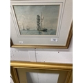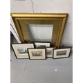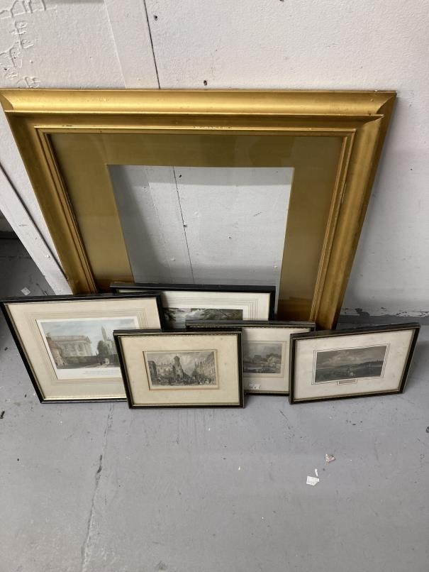19th cent. and later pictures to include engravings of The Royal Exchange, Tottenham Mills Middlesex, silk of a fishing boat, etc. Includes gilt glazed frame. (7)