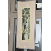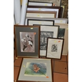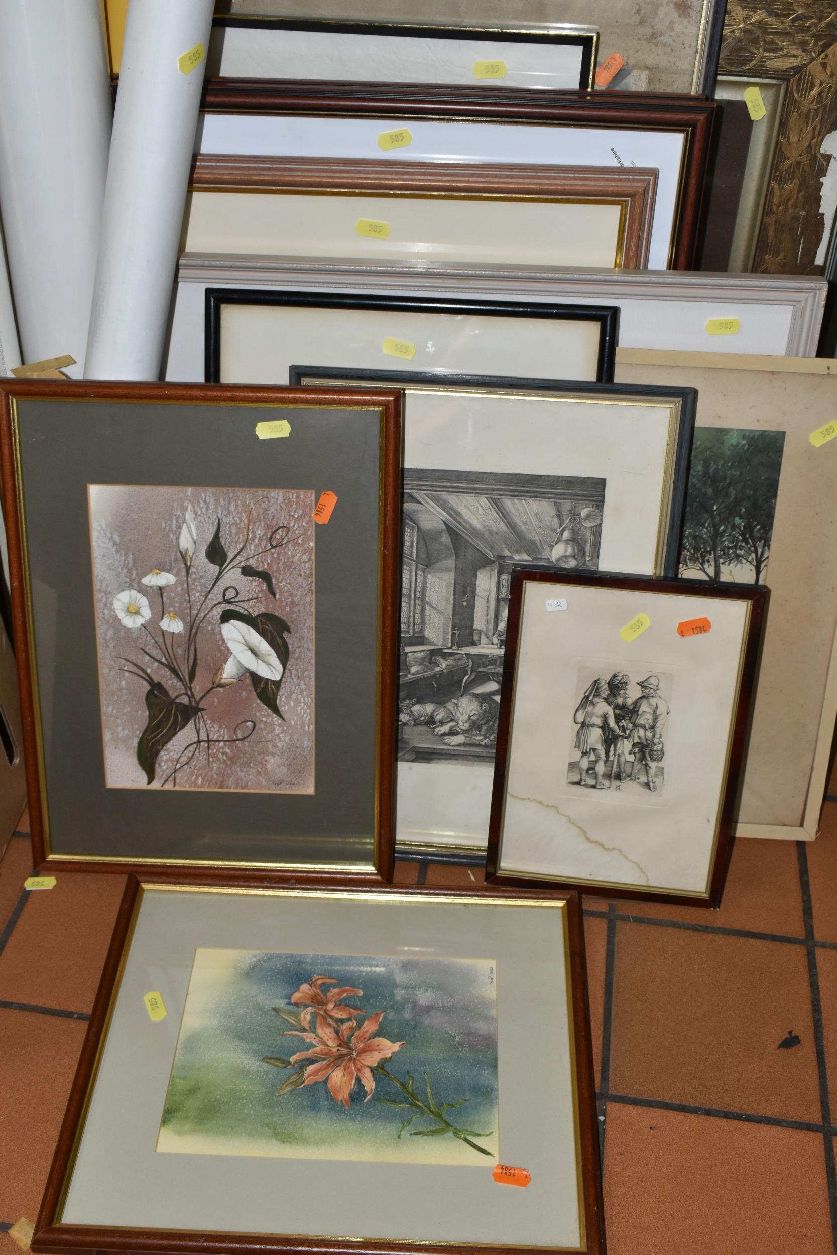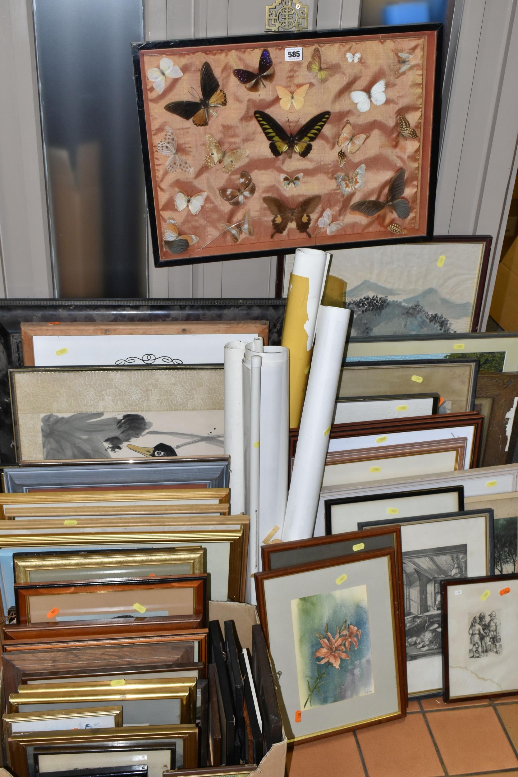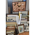 A QUANTITY OF PAINTINGS AND PRINTS ETC, to include two etchings after Albrecht Durer 'Three peasants in conversation' stain to the margin and 'Saint Jerome in his study', an Abu Bakar Ibrahim coastal landscape watercolour, Kathleen G Jefferies etching depicting St John the Baptist church in Bristol, assorted prints, selection of butterflies in a glazed case - glass cracked, unsigned oil on canvas depicting a landscape - varnish cloudy in places (Qty)