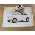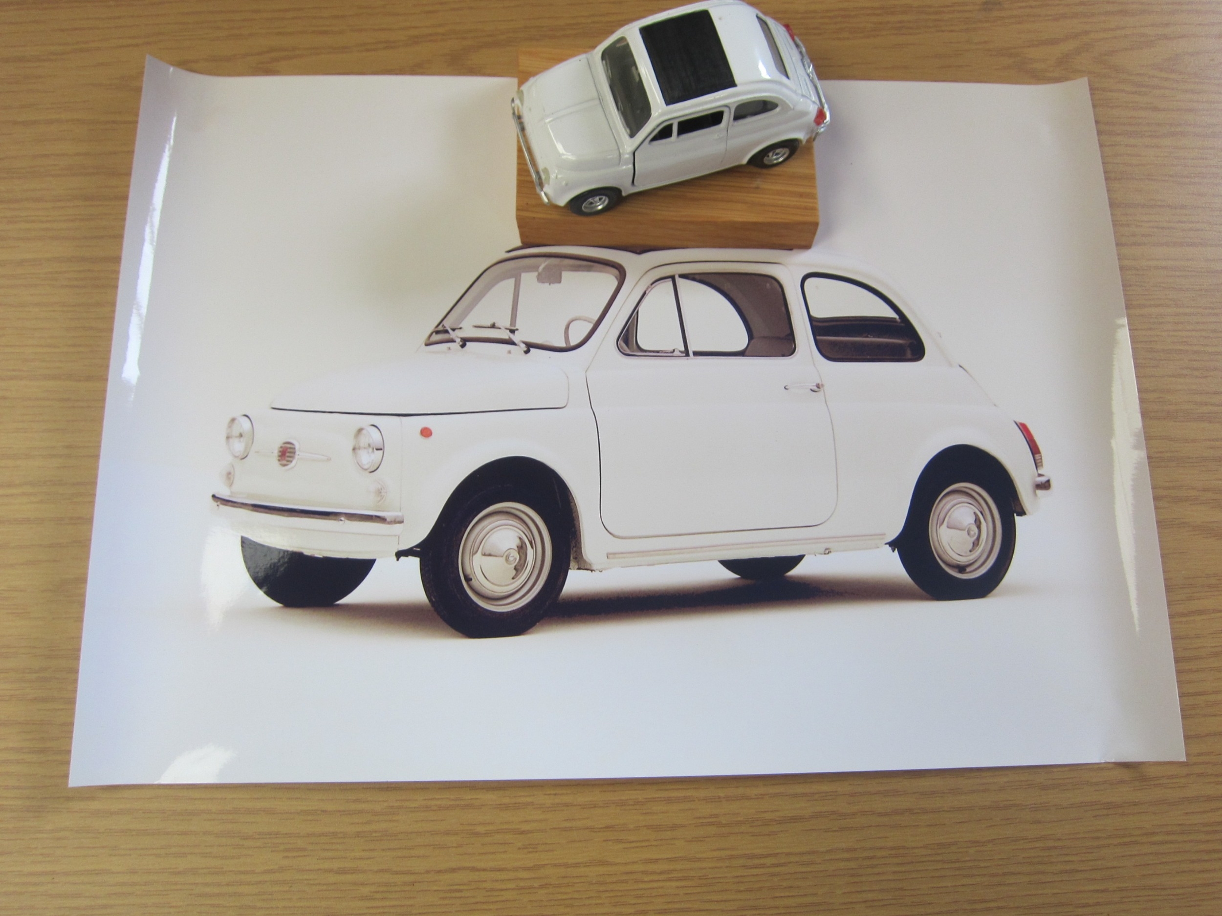 A die cast Fiat 500 mounted on a plinth and a Fiat 500 photograph