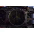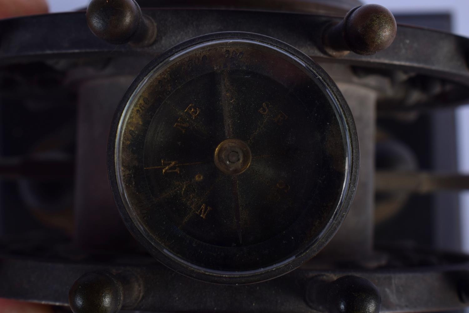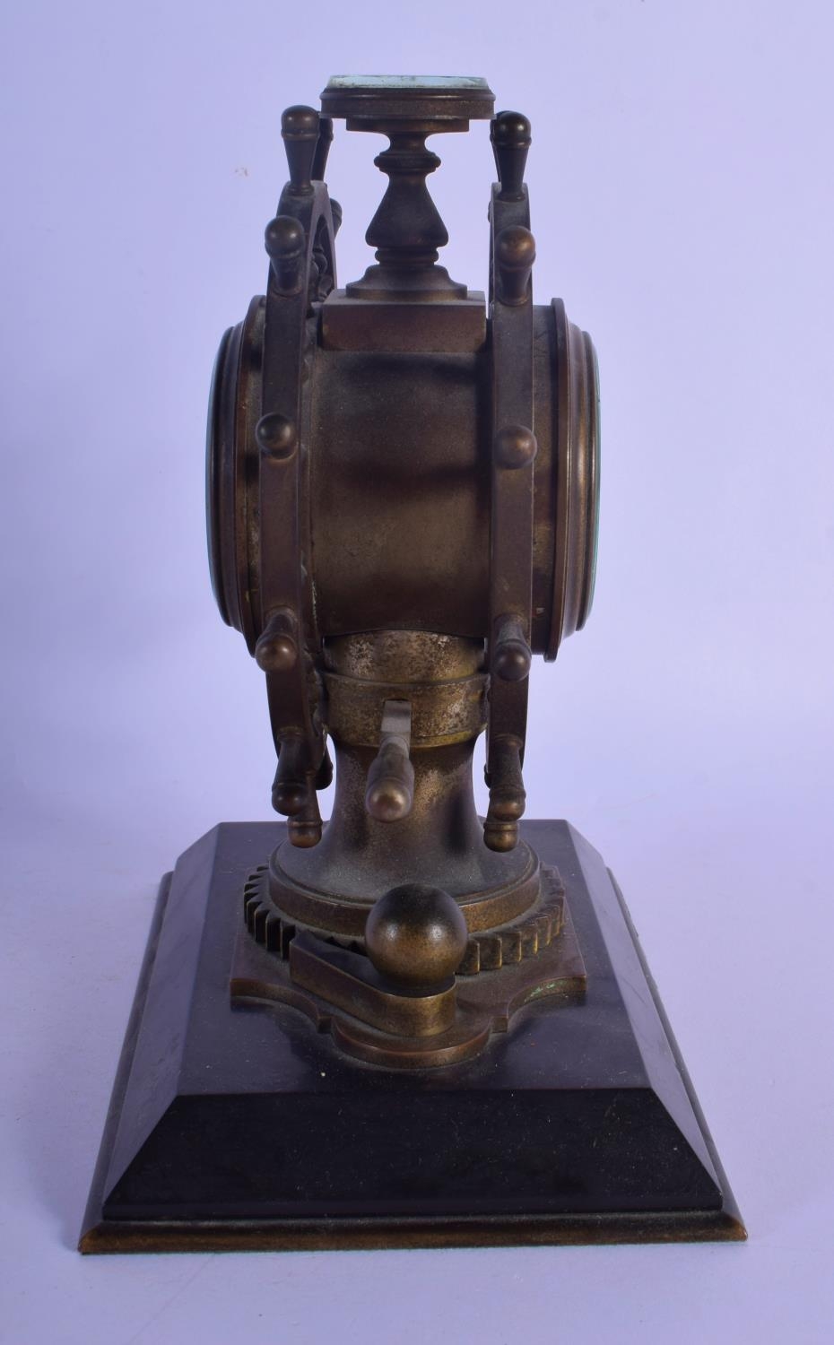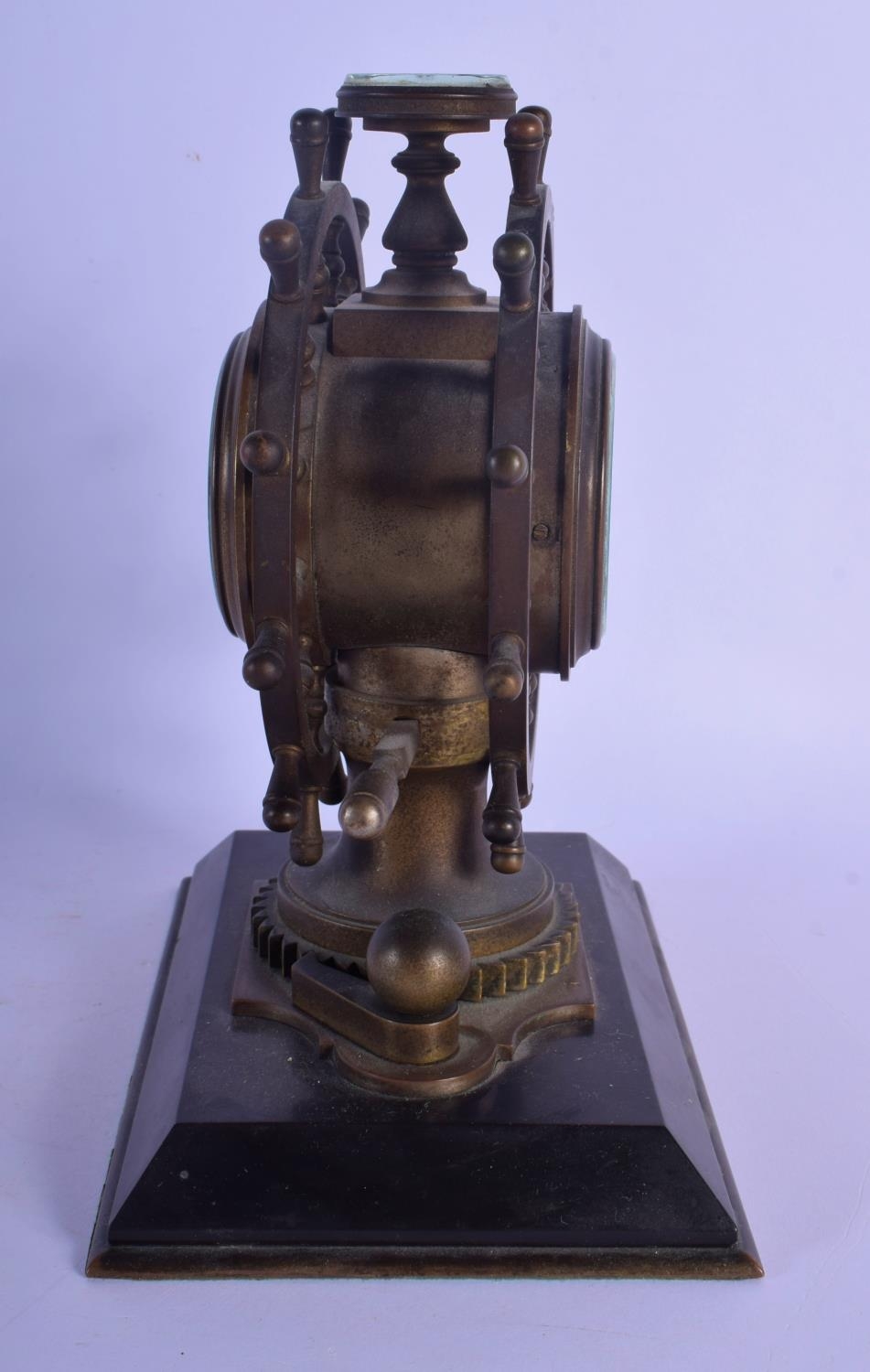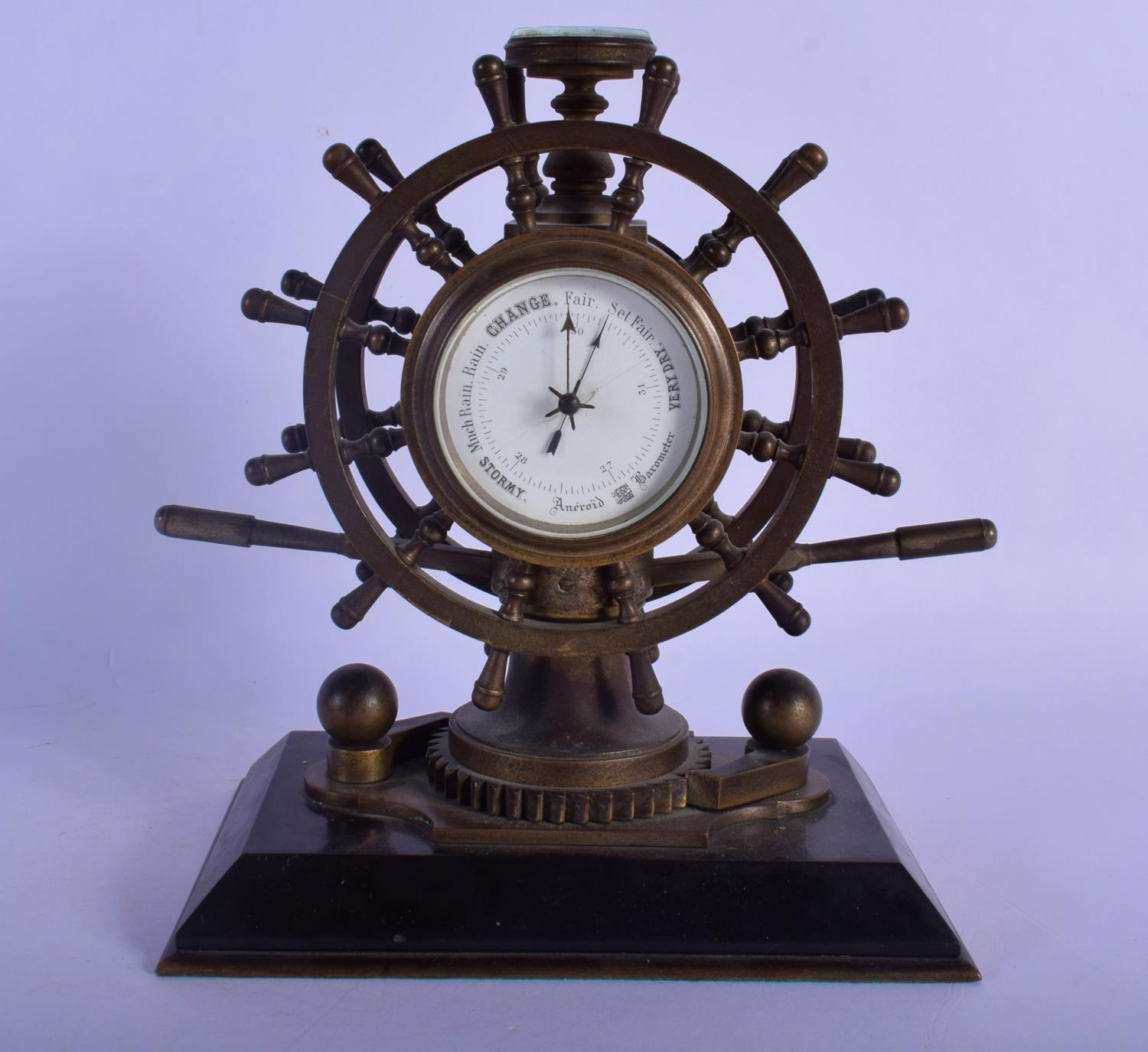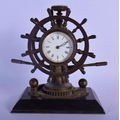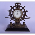 A RARE 19TH CENTURY EUROPEAN INDUSTRIAL SHIPS WHEEL CLOCK with revolving base and inset barometer & compass. 18 cm x 21 cm.