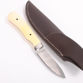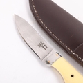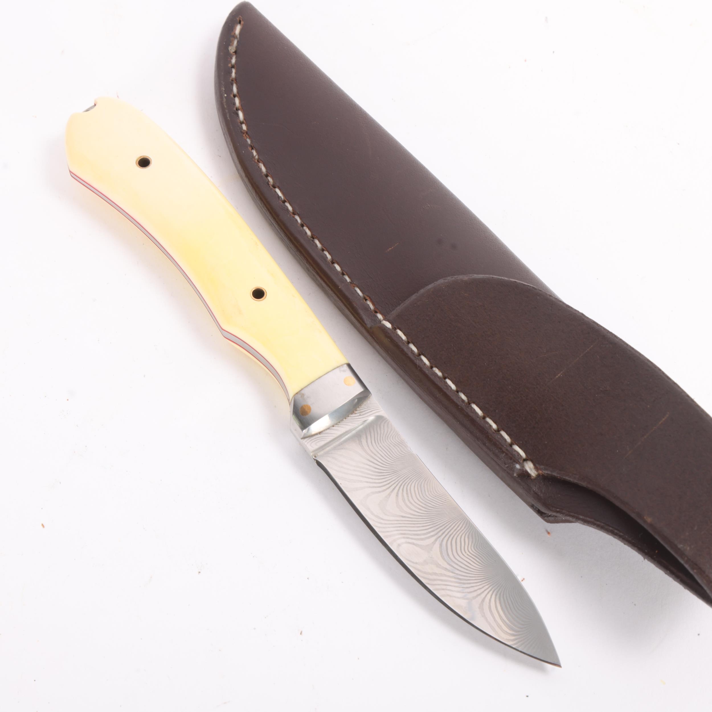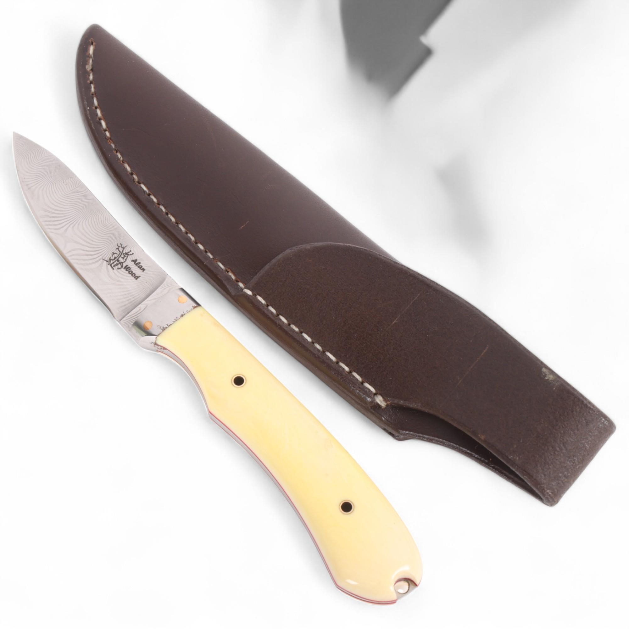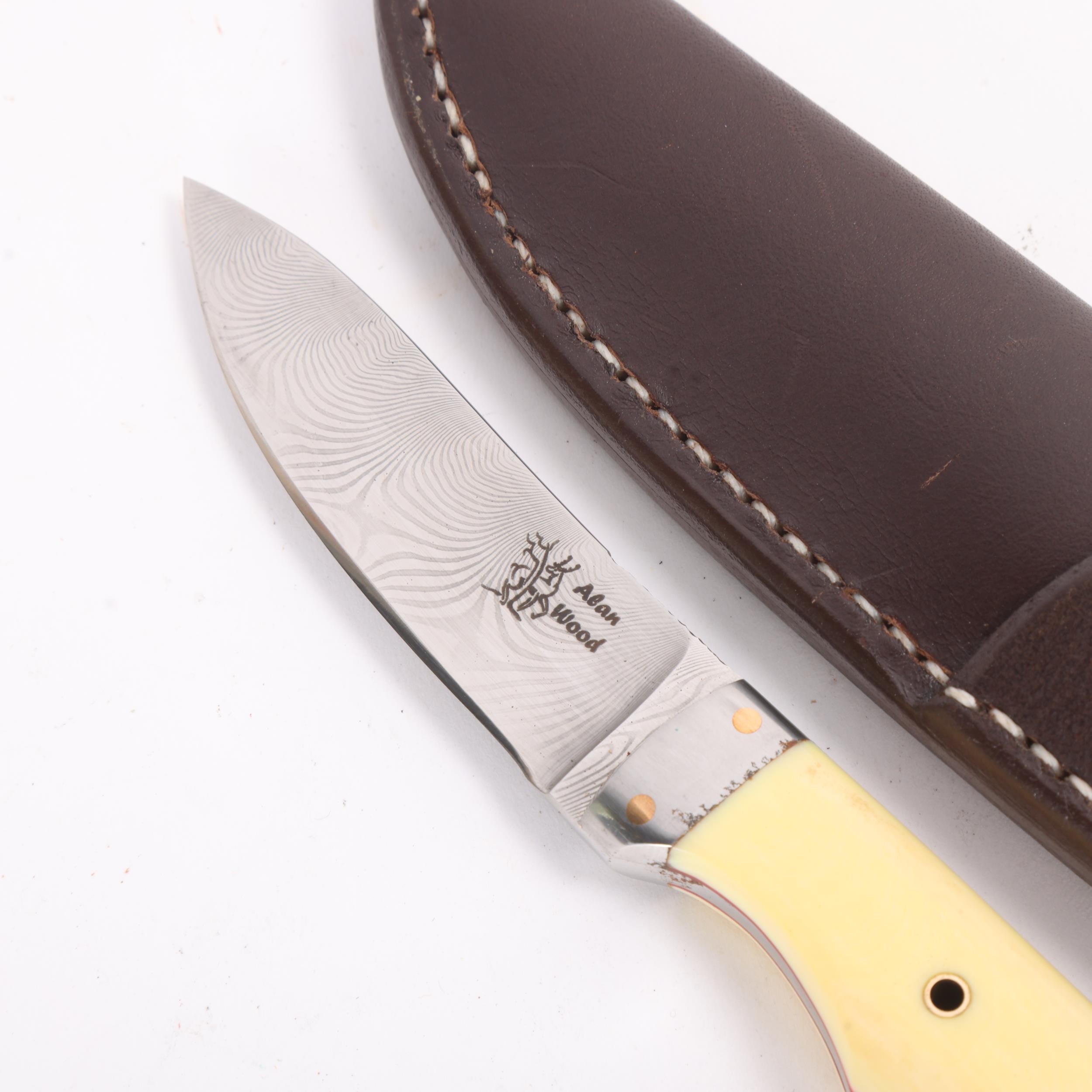 An Alan Wood fixed blade knife, with Damascus steel blade and ivorine handle and leather sheath, makers marks to blade, blade 7cm, overall 19cm.